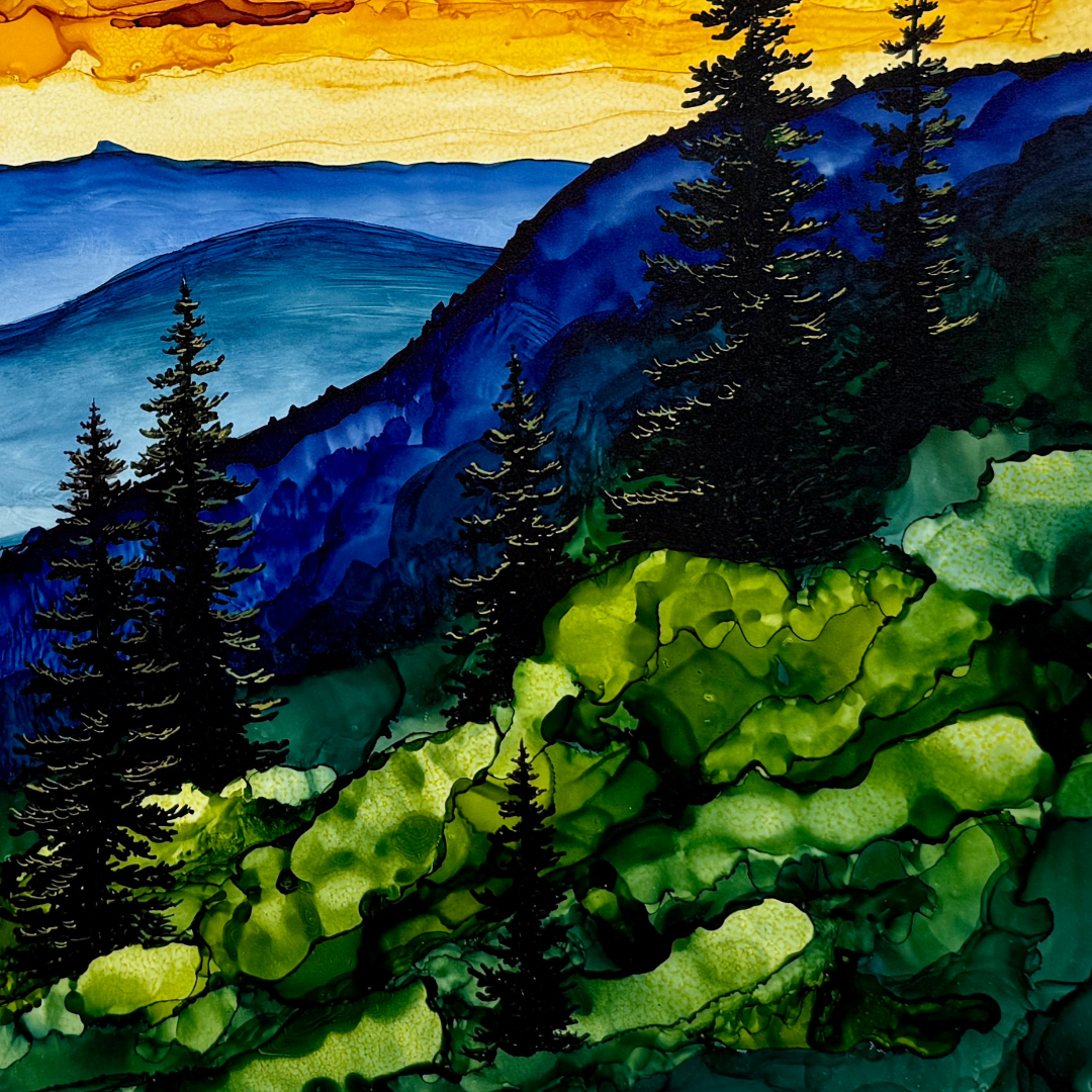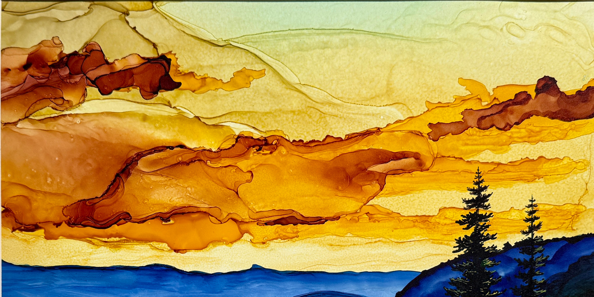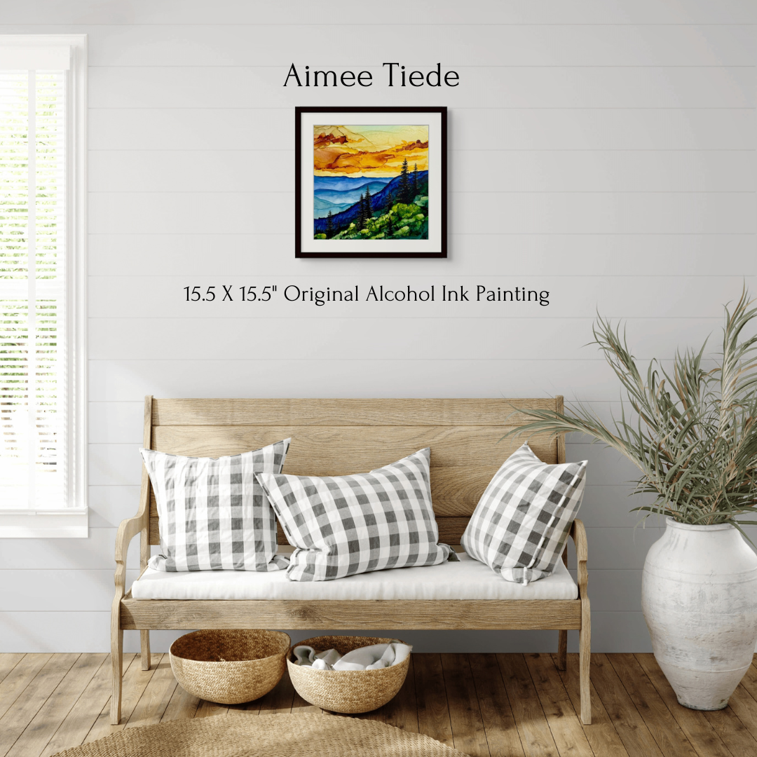 Works from Aimee Tiede's collection of Alcohol Ink paintings are vibrant and stunning, with a three-dimensional quality in person. This piece captures a serene sunrise with stunning detail. Perfect for adding a touch of tranquility to any space.