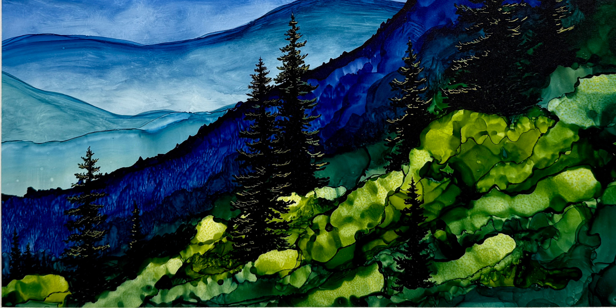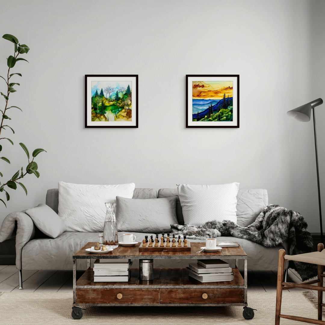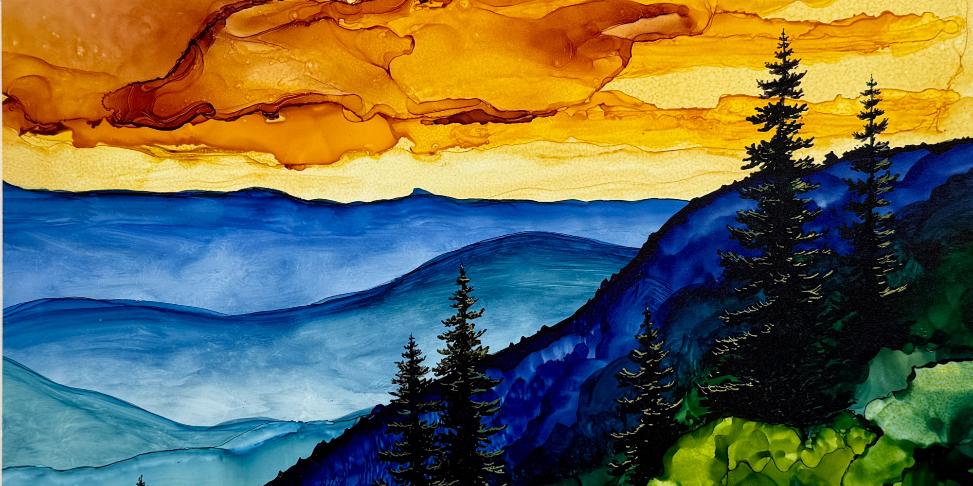 Works from Aimee Tiede's collection of Alcohol Ink paintings are vibrant and stunning, with a three-dimensional quality in person. This piece captures a serene sunrise with stunning detail. Perfect for adding a touch of tranquility to any space.