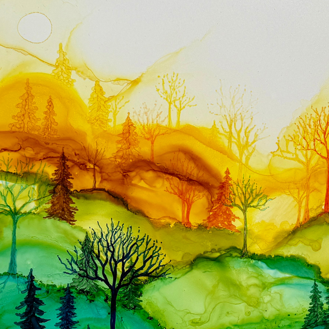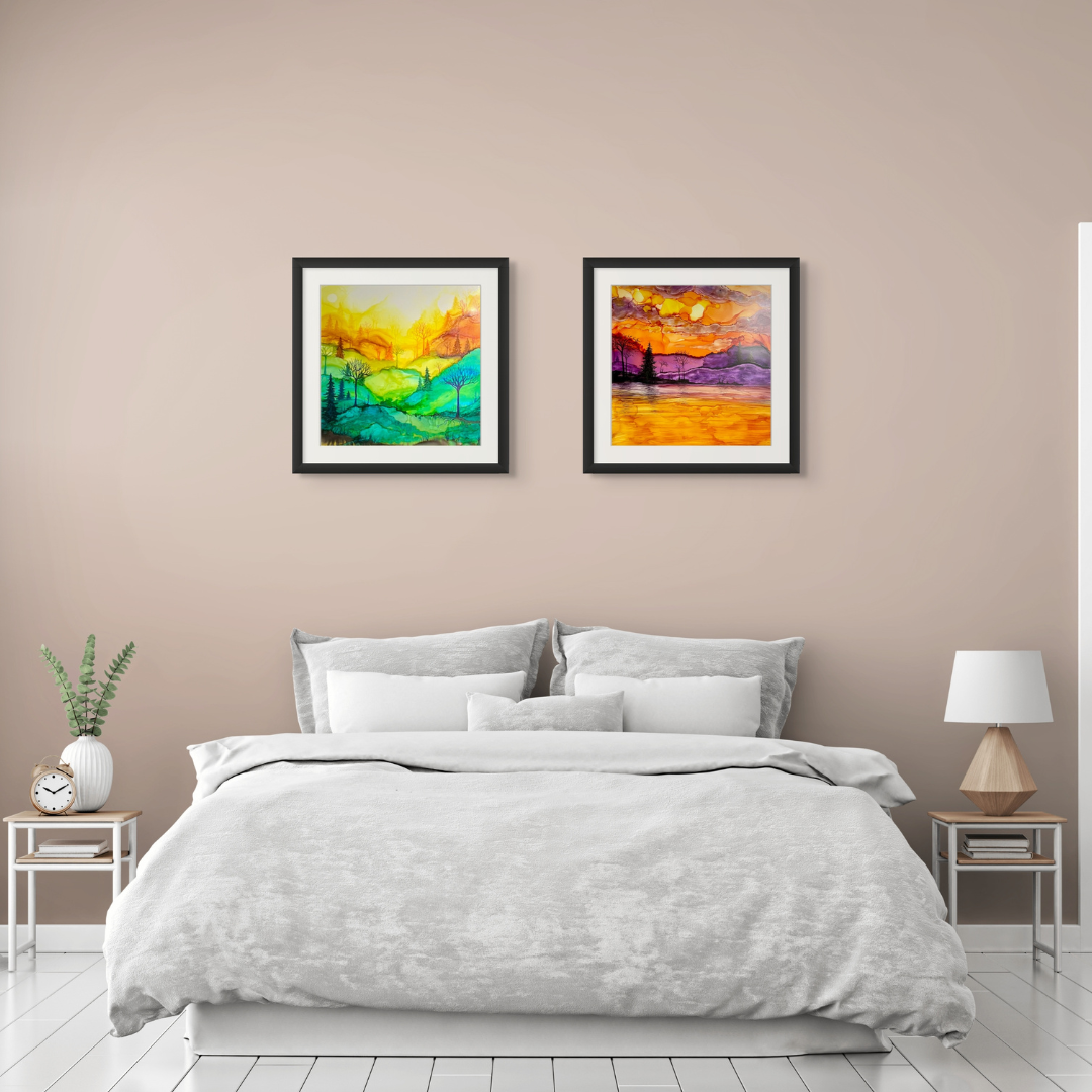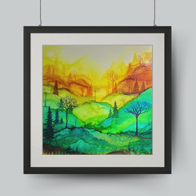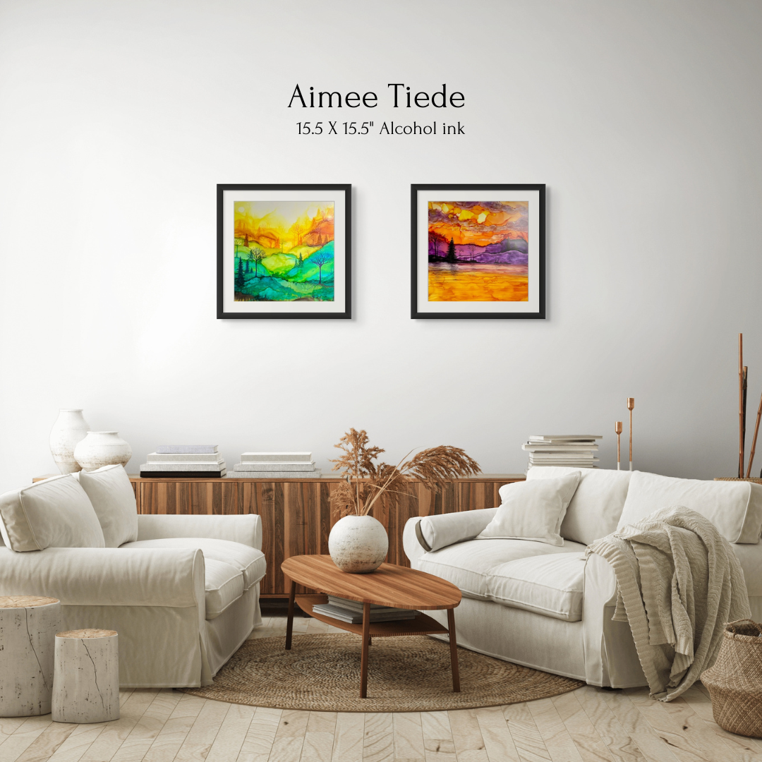 Works from Aimee Tiede's collection of Alcohol Ink paintings are vibrant and stunning, with a three-dimensional quality in person. This piece captures a serene sunrise with stunning detail. Perfect for adding a touch of tranquility to any space.