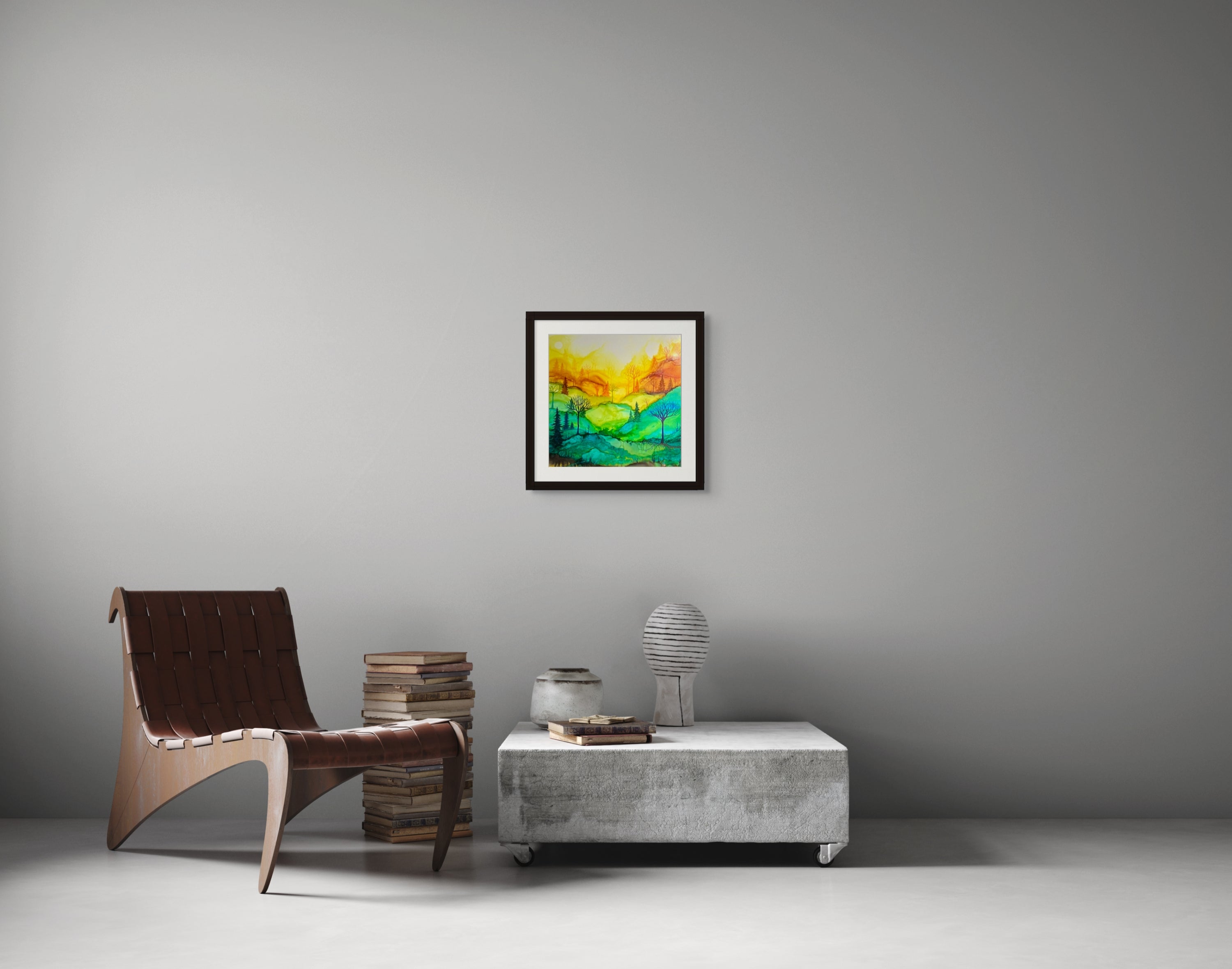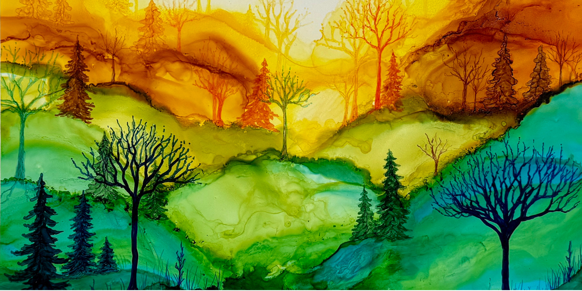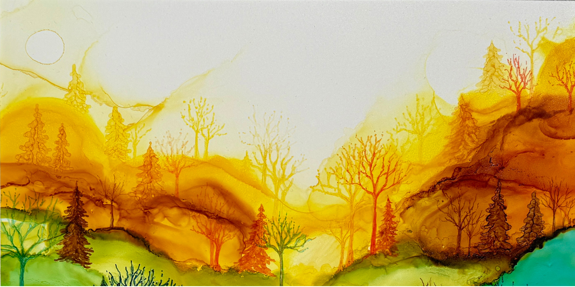Works from Aimee Tiede's collection of Alcohol Ink paintings are vibrant and stunning, with a three-dimensional quality in person. This piece captures a serene sunrise with stunning detail. Perfect for adding a touch of tranquility to any space.