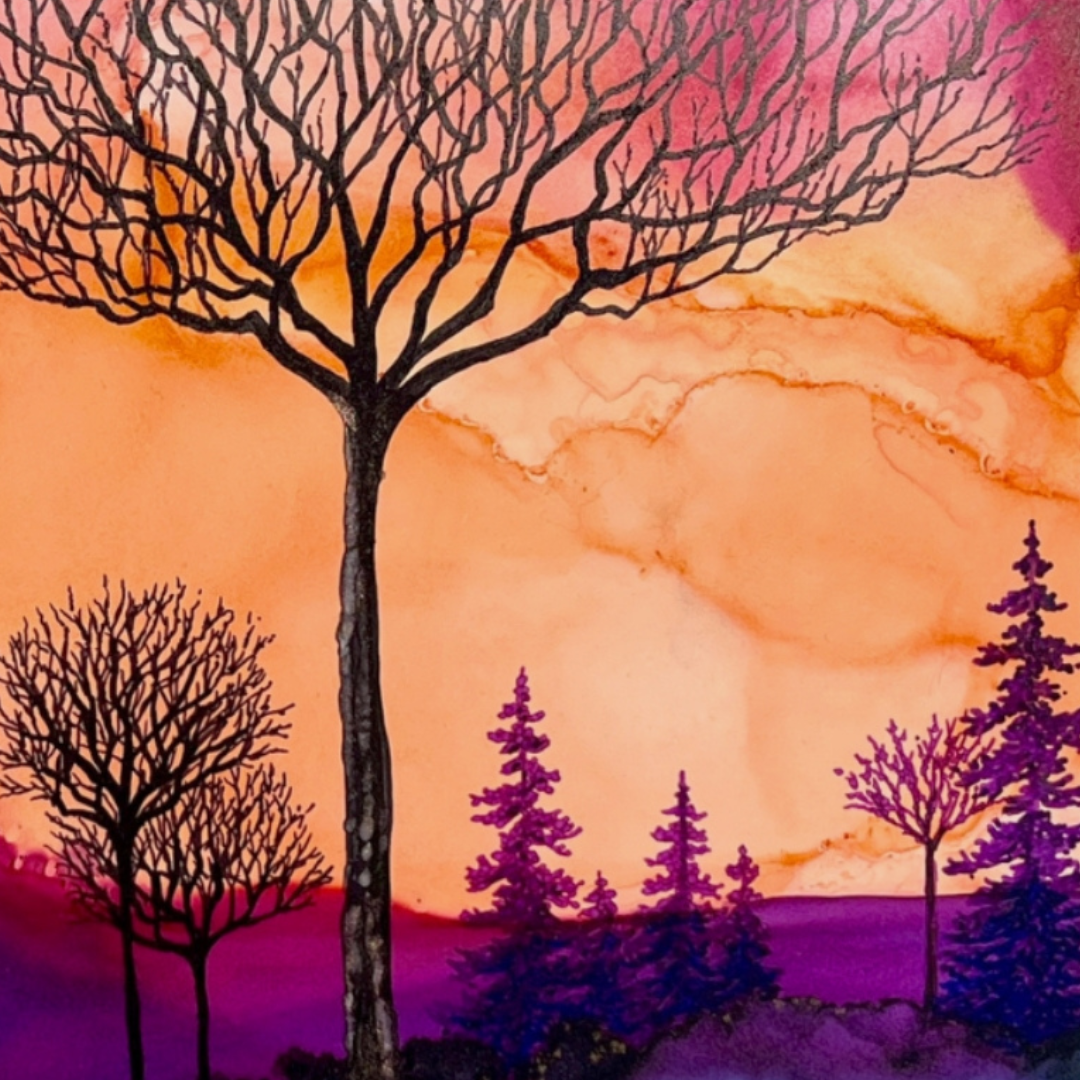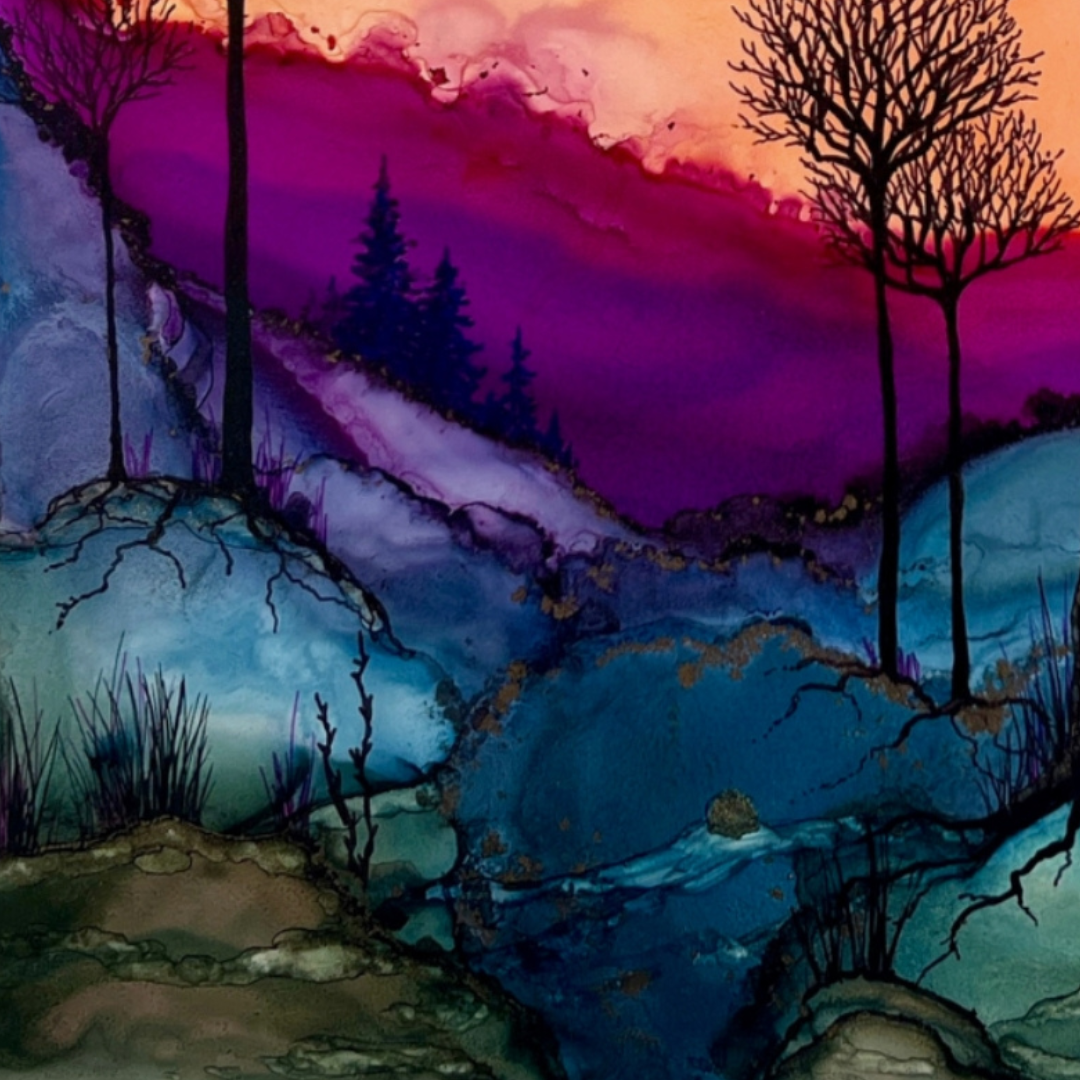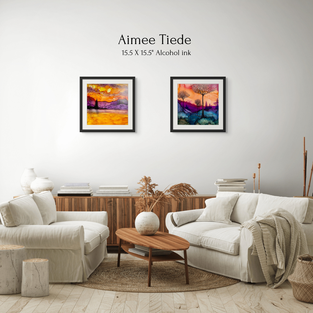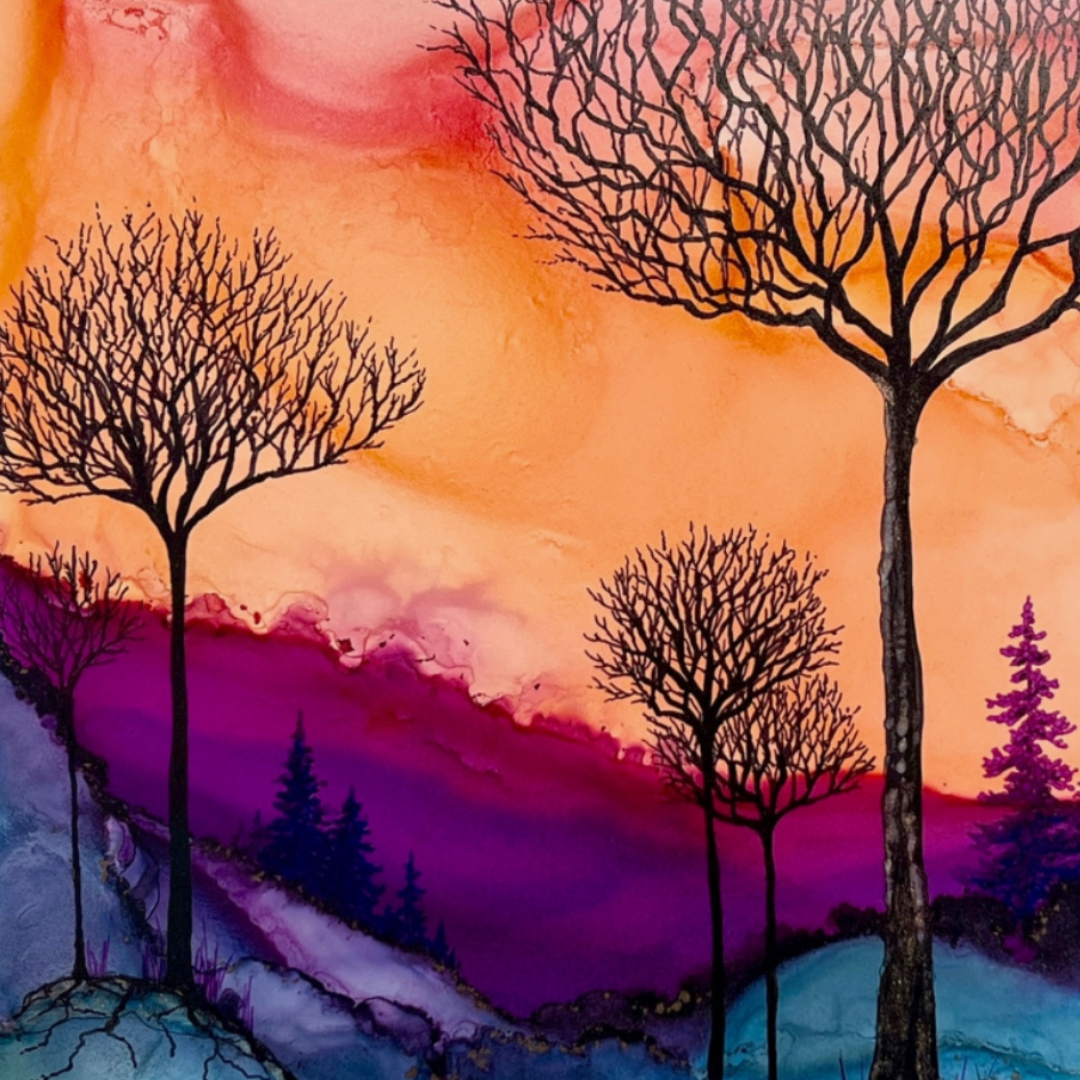 Works from Aimee Tiede's collection of Alcohol Ink paintings are vibrant and stunning, with a three-dimensional quality in person. Daybreak Ridge glows with warm oranges and purples yet still evokes that feeling of early morning chilly air.