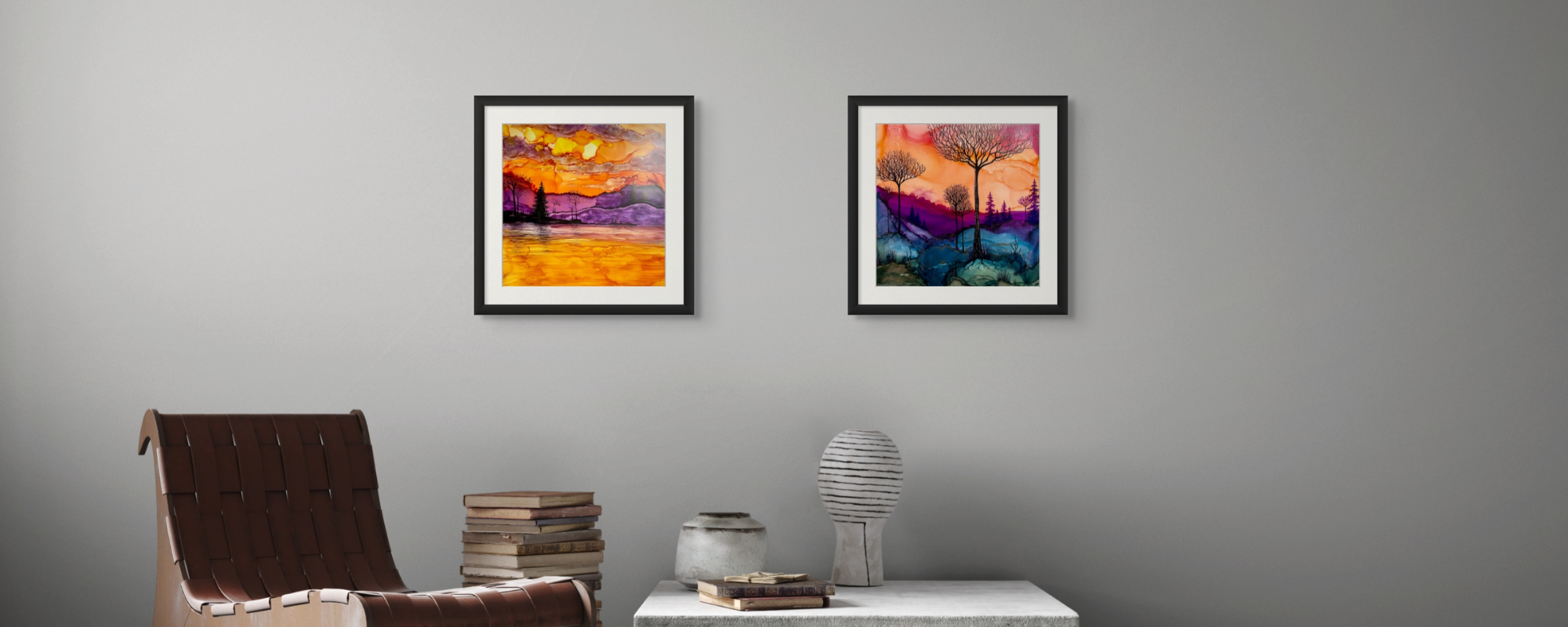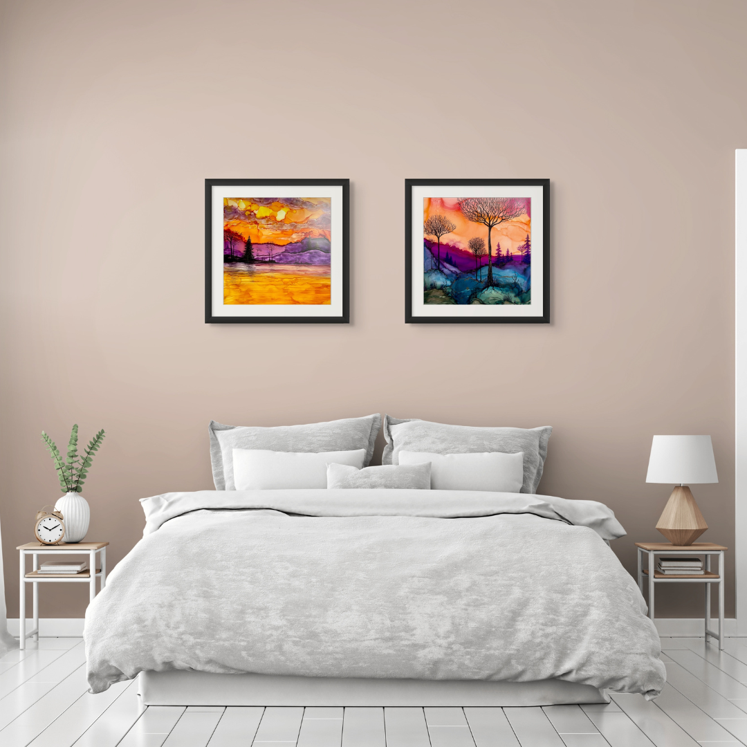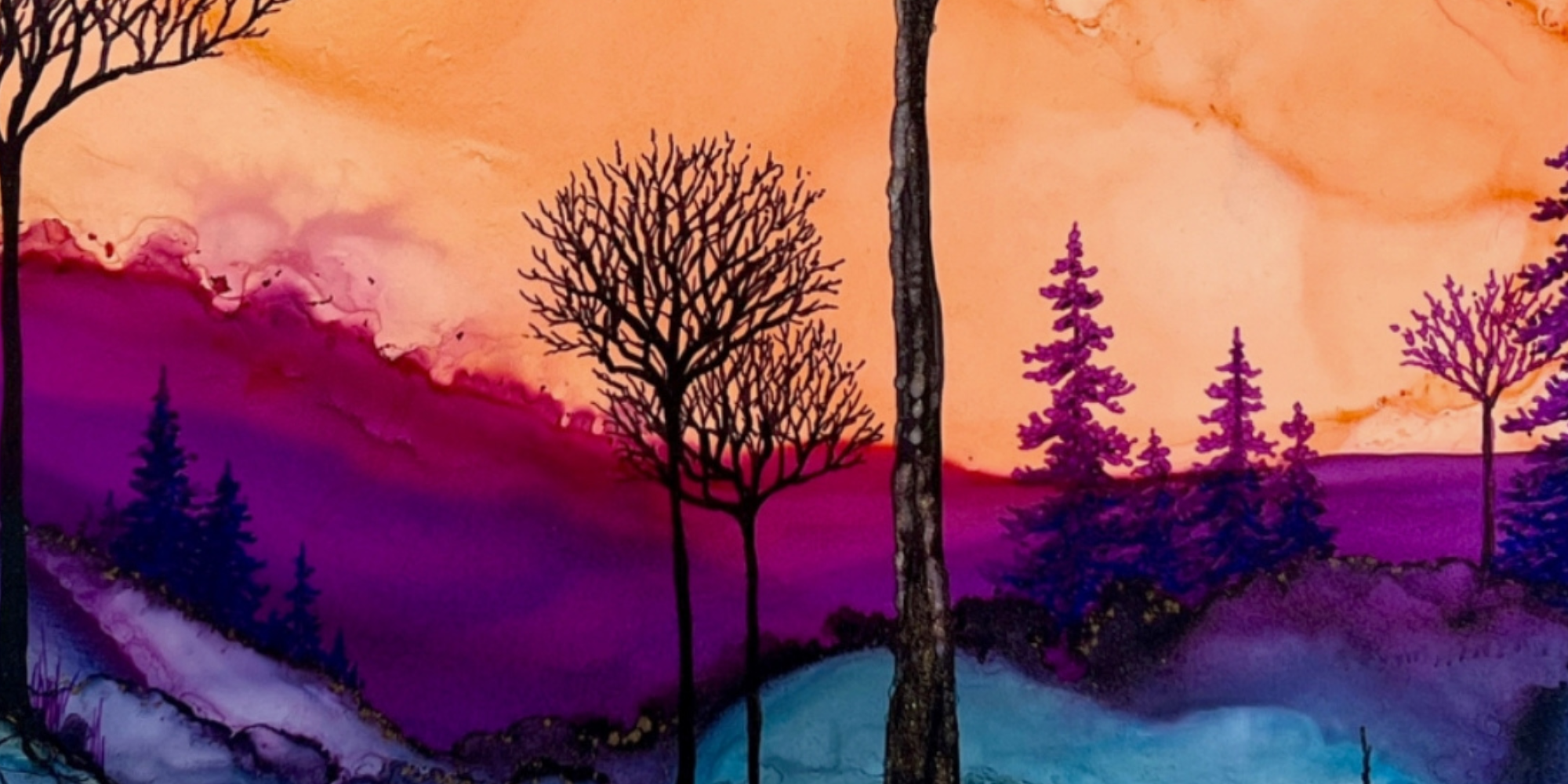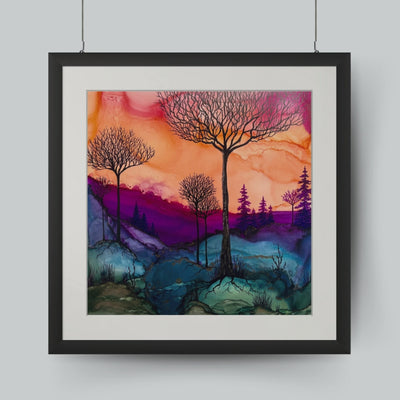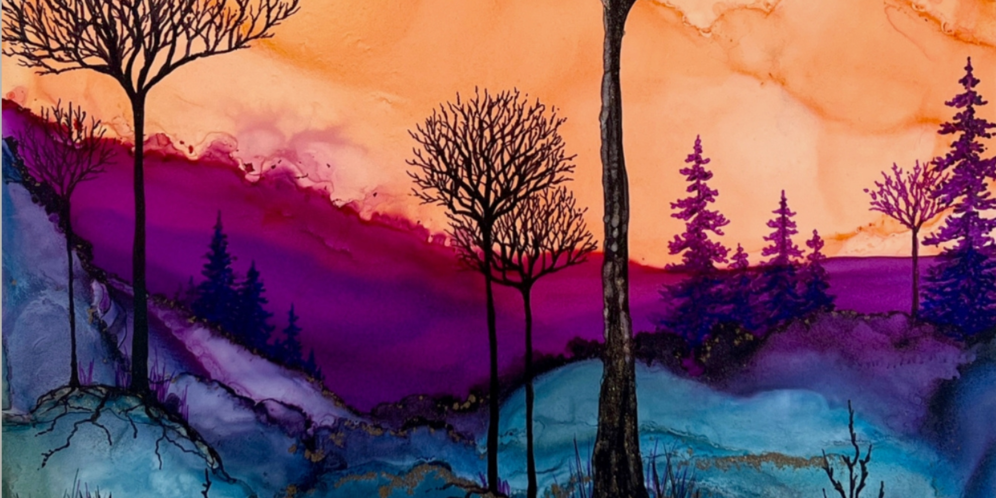 Works from Aimee Tiede's collection of Alcohol Ink paintings are vibrant and stunning, with a three-dimensional quality in person. Daybreak Ridge glows with warm oranges and purples yet still evokes that feeling of early morning chilly air.