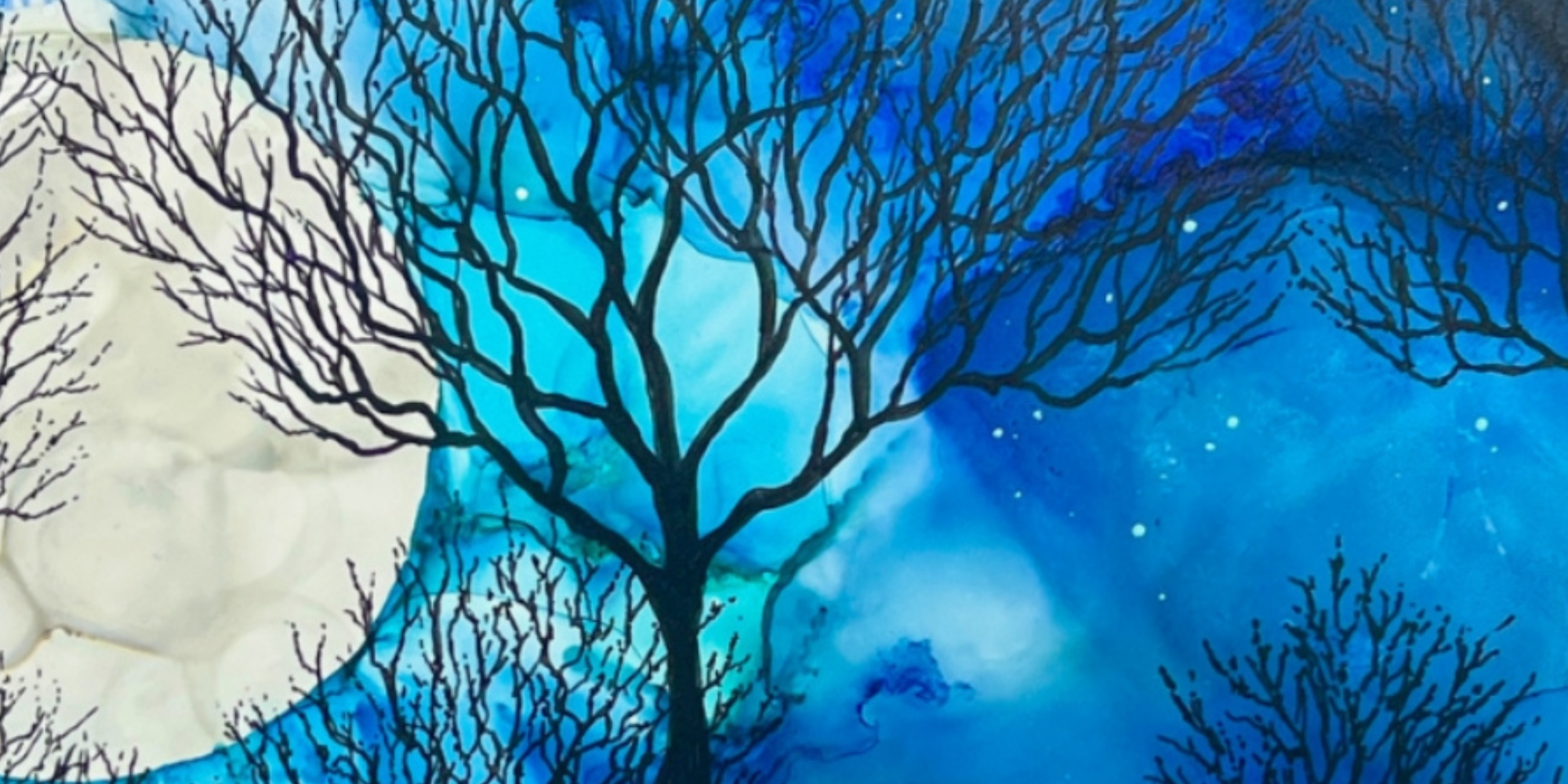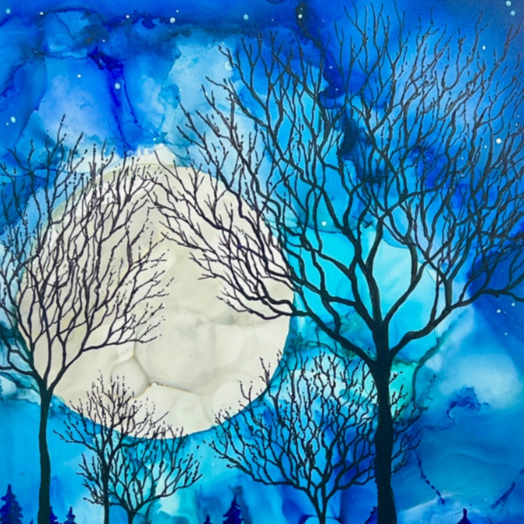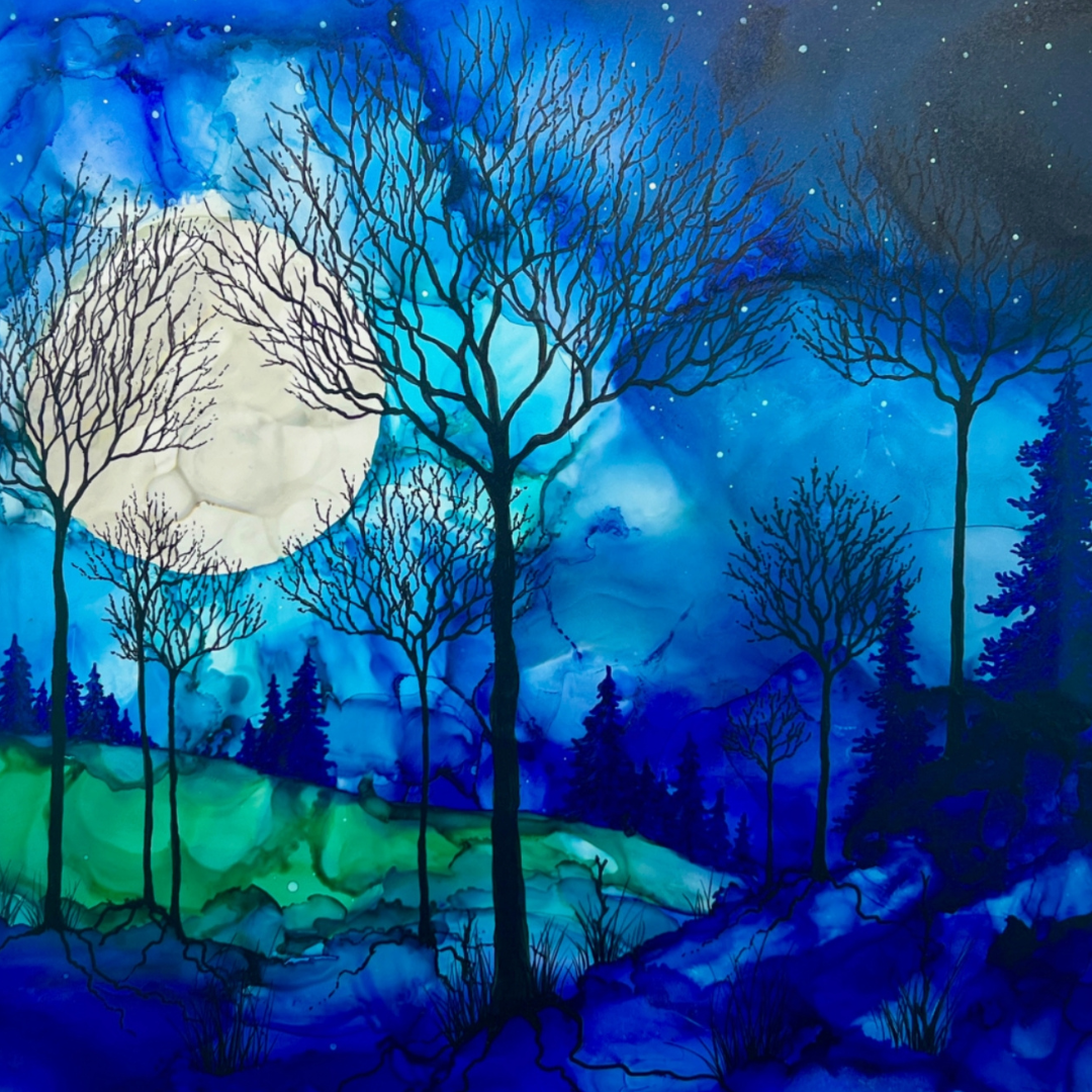 Works from Aimee Tiede's collection of Alcohol Ink paintings are vibrant and stunning, with a three-dimensional quality in person. Sometimes, the moon in New England looks like it will swallow up the sky, especially in the fall. In this stunning painting, Aimee captures that chilly fall harvest feeling so perfectly.