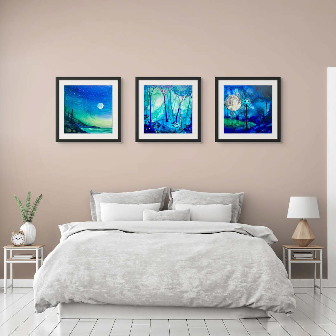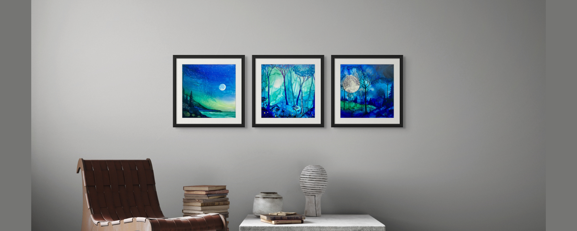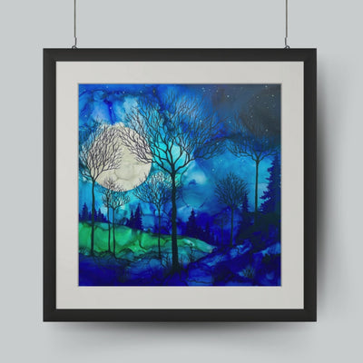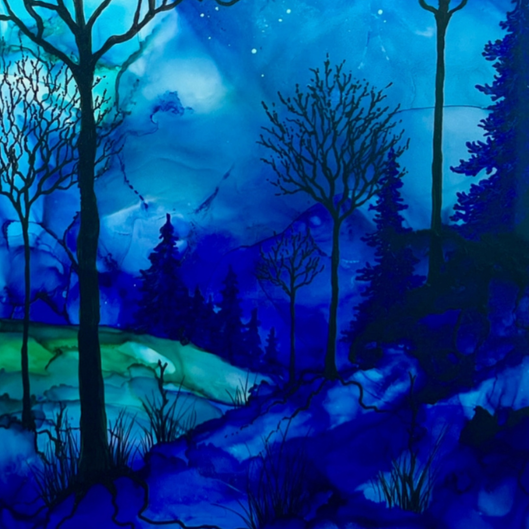 Works from Aimee Tiede's collection of Alcohol Ink paintings are vibrant and stunning, with a three-dimensional quality in person. Sometimes, the moon in New England looks like it will swallow up the sky, especially in the fall. In this stunning painting, Aimee captures that chilly fall harvest feeling so perfectly.