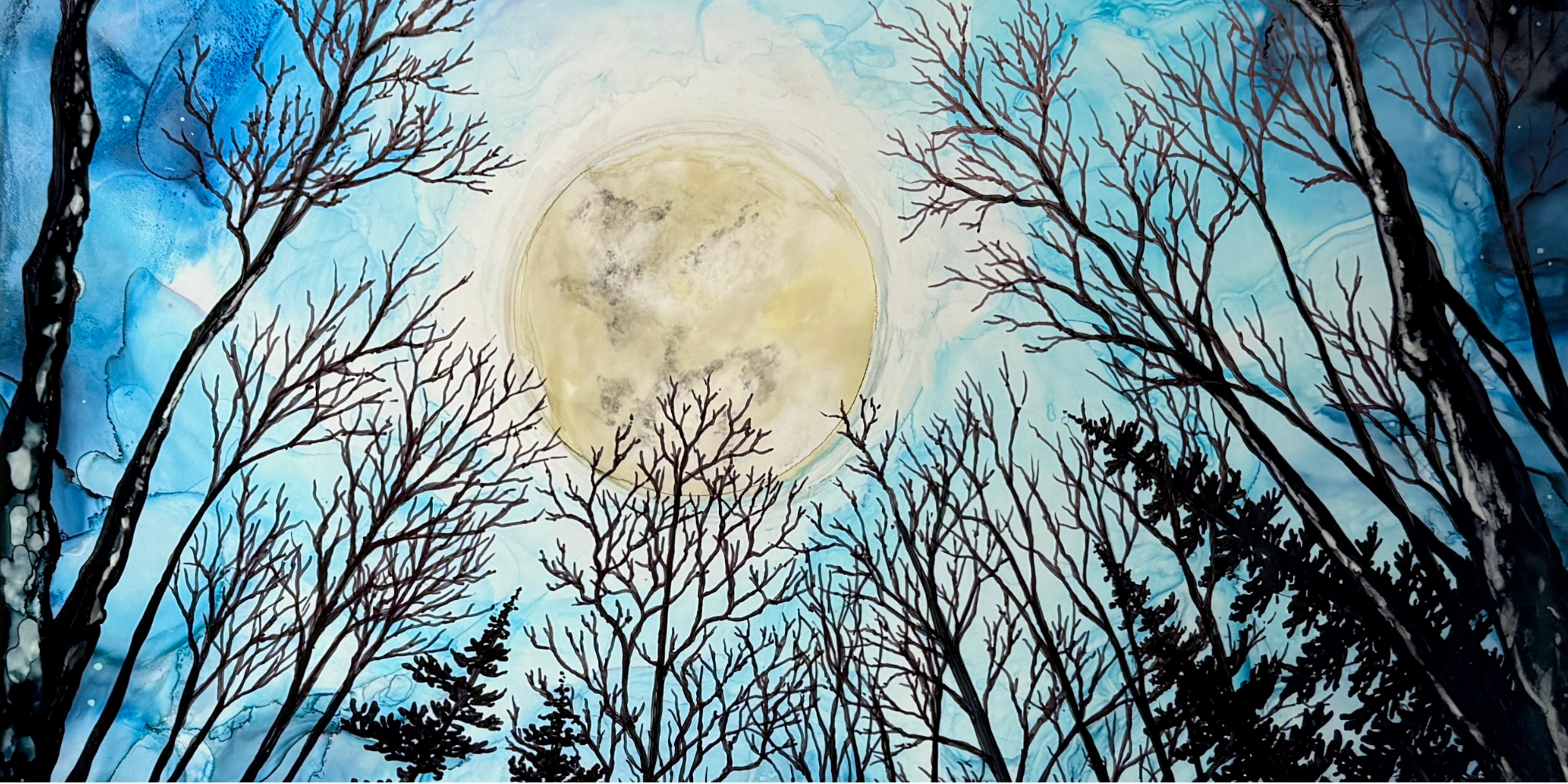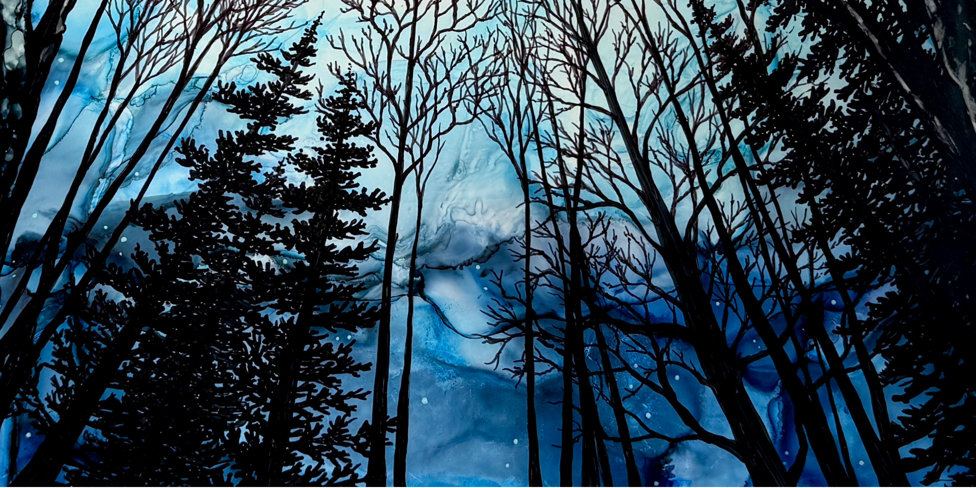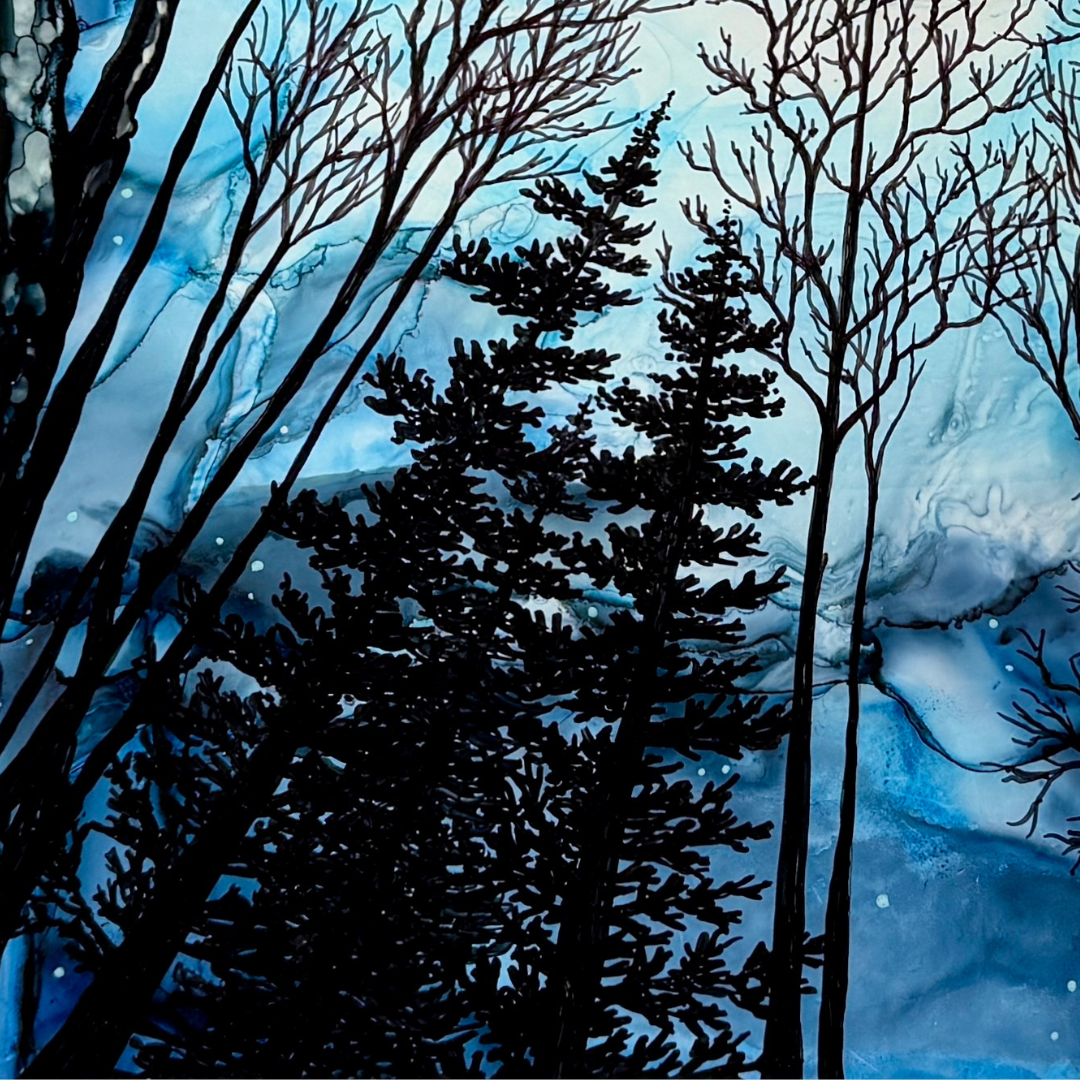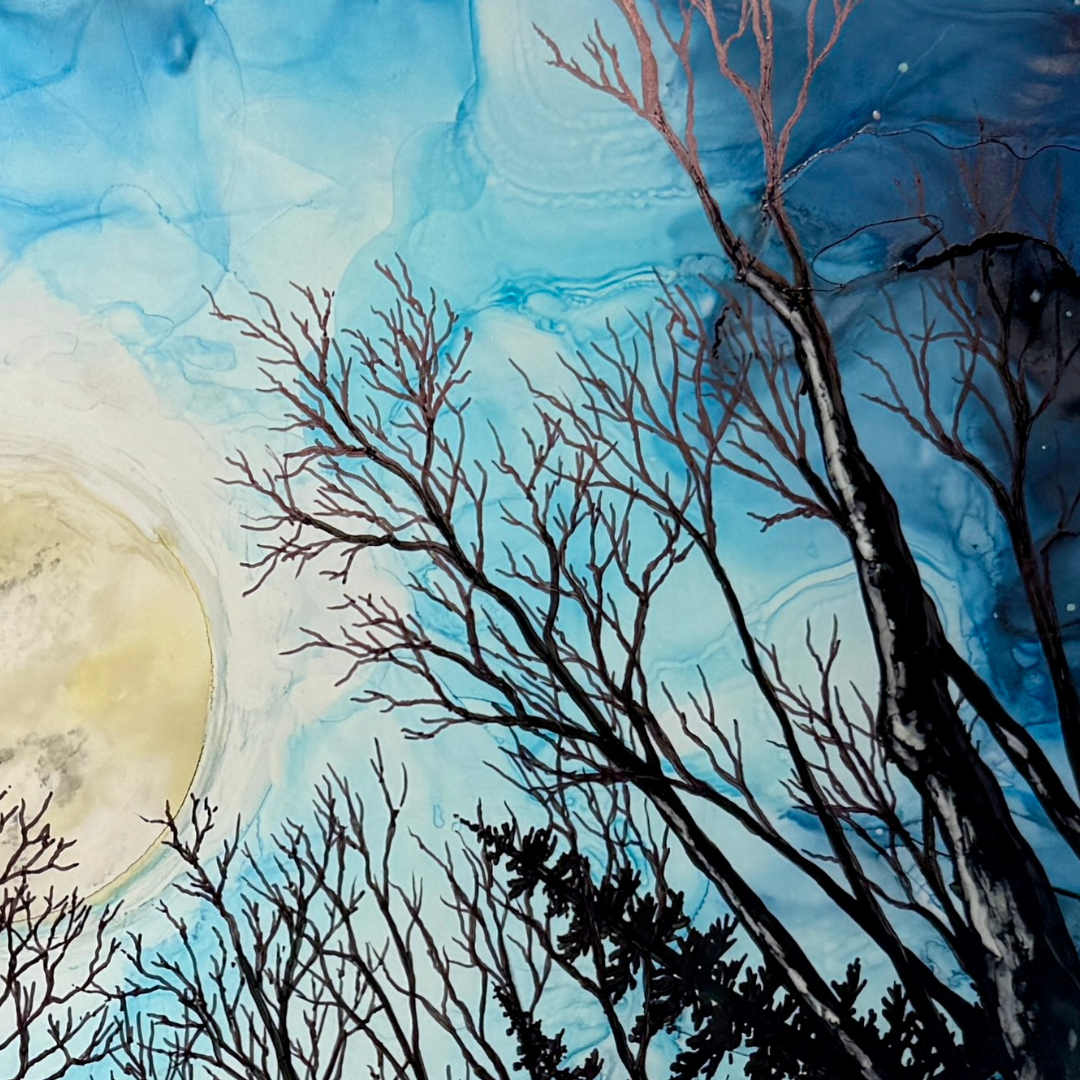 This artwork features a winter scene with a bright moon shining through a variety of pine trees and bare branches. The composition predominantly showcases blue and dark tones, highlighting the vibrant, three-dimensional quality of the ink.