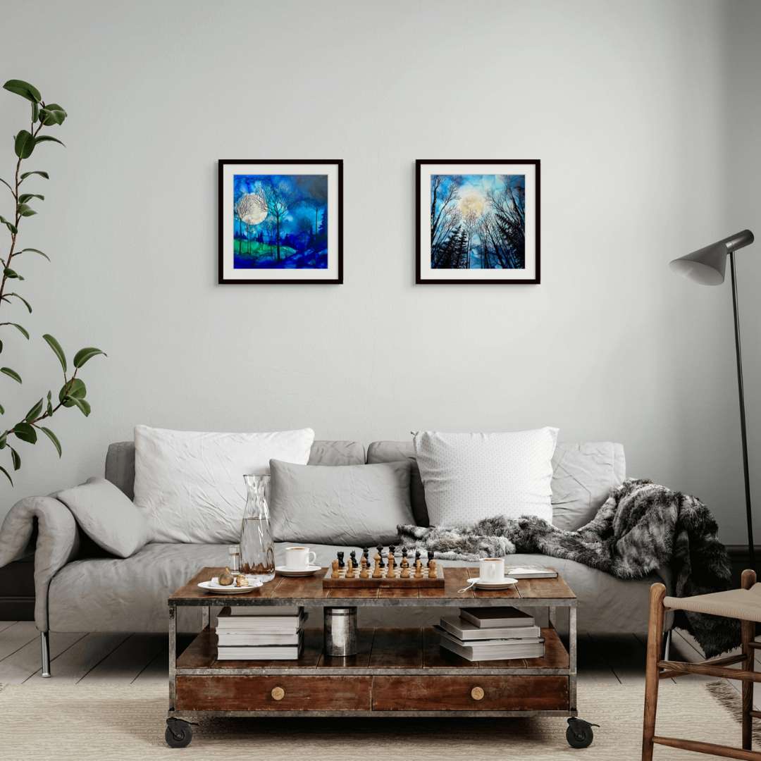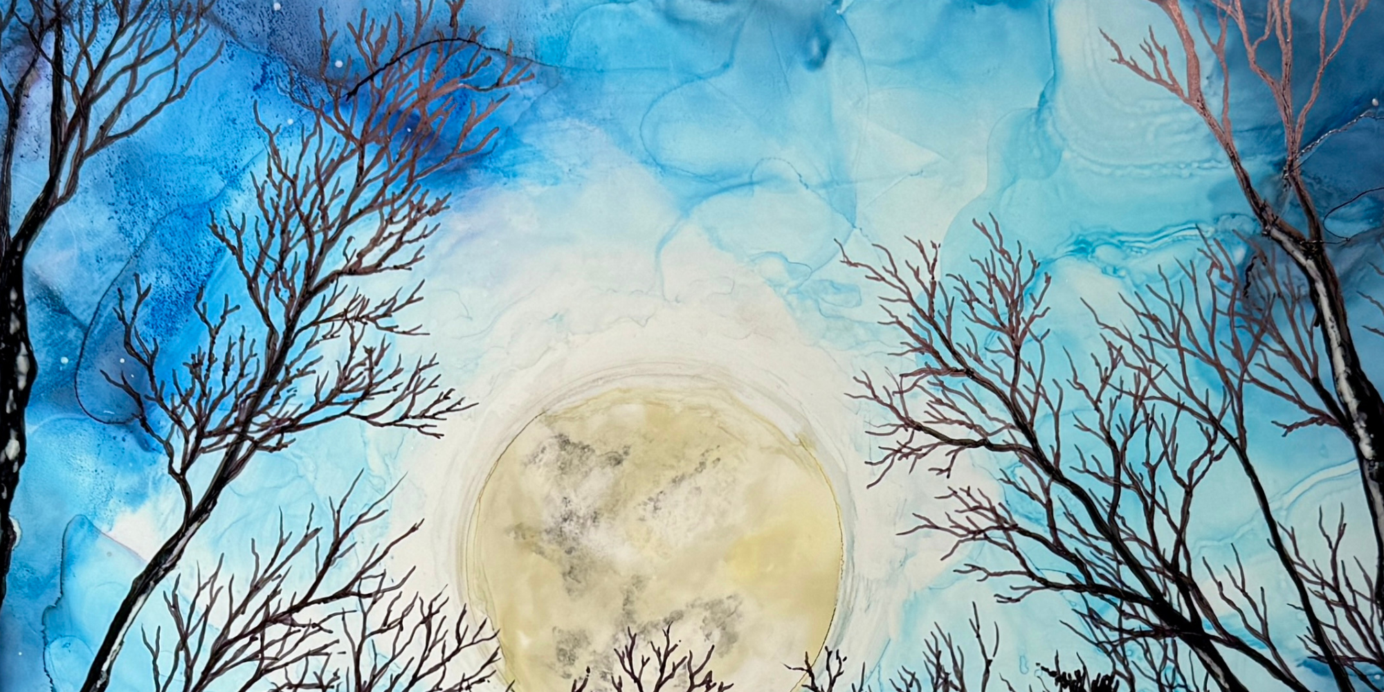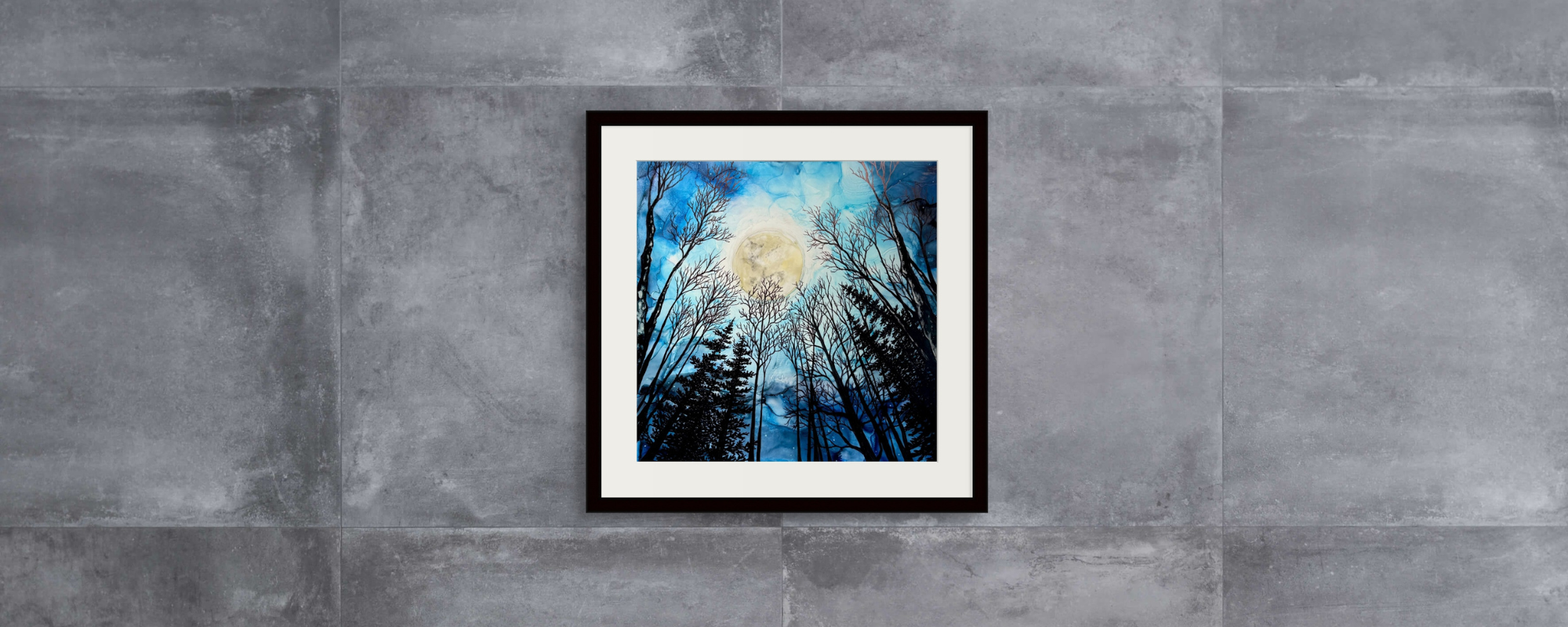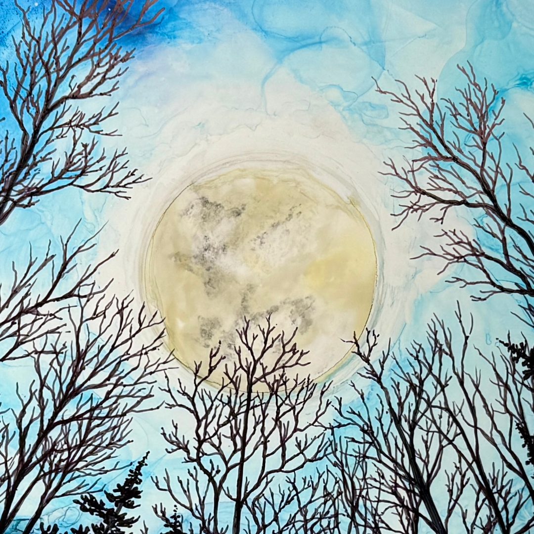 This artwork features a winter scene with a bright moon shining through a variety of pine trees and bare branches. The composition predominantly showcases blue and dark tones, highlighting the vibrant, three-dimensional quality of the ink.
