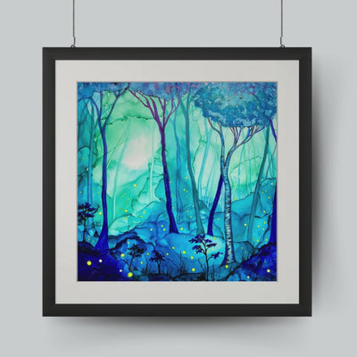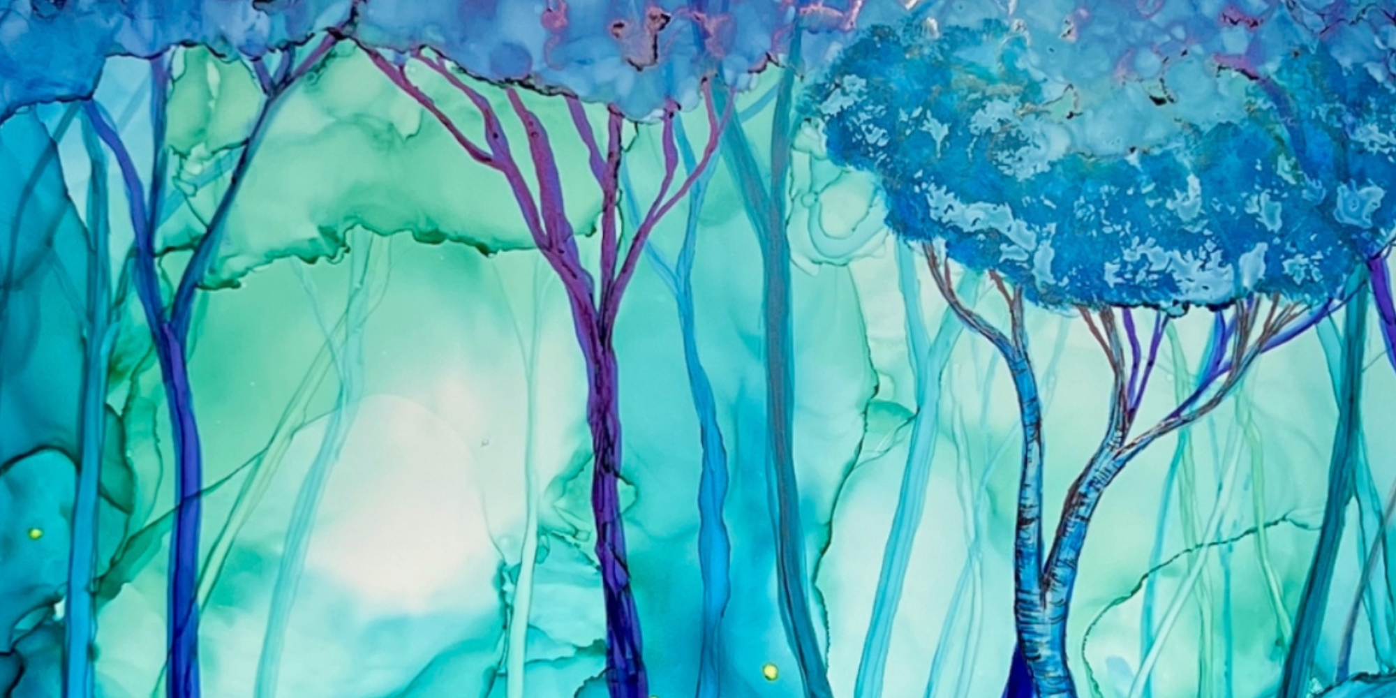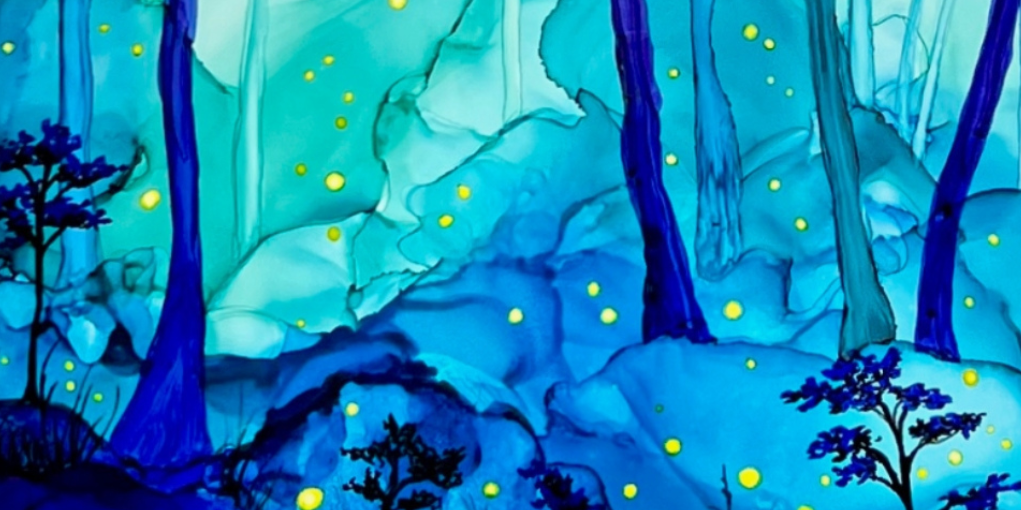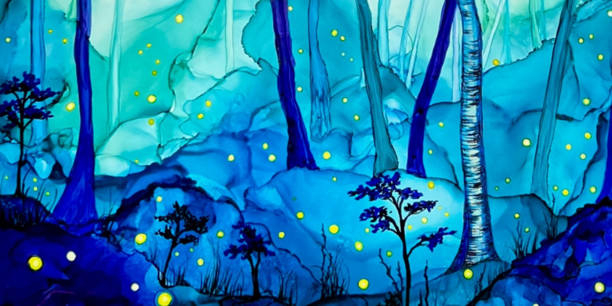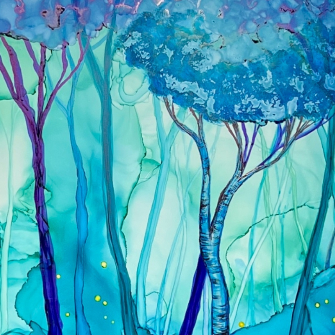Works from Aimee Tiede's collection of Alcohol Ink paintings are vibrant and stunning, with a three-dimensional quality in person. New England summer nights with fireflies in a birch glen... This peaceful painting almost has us hearing crickets and frogs.
