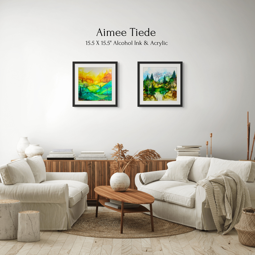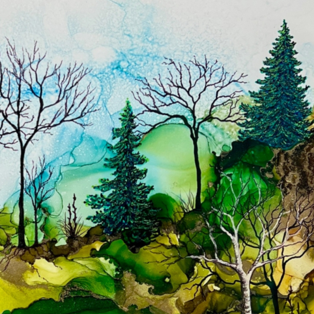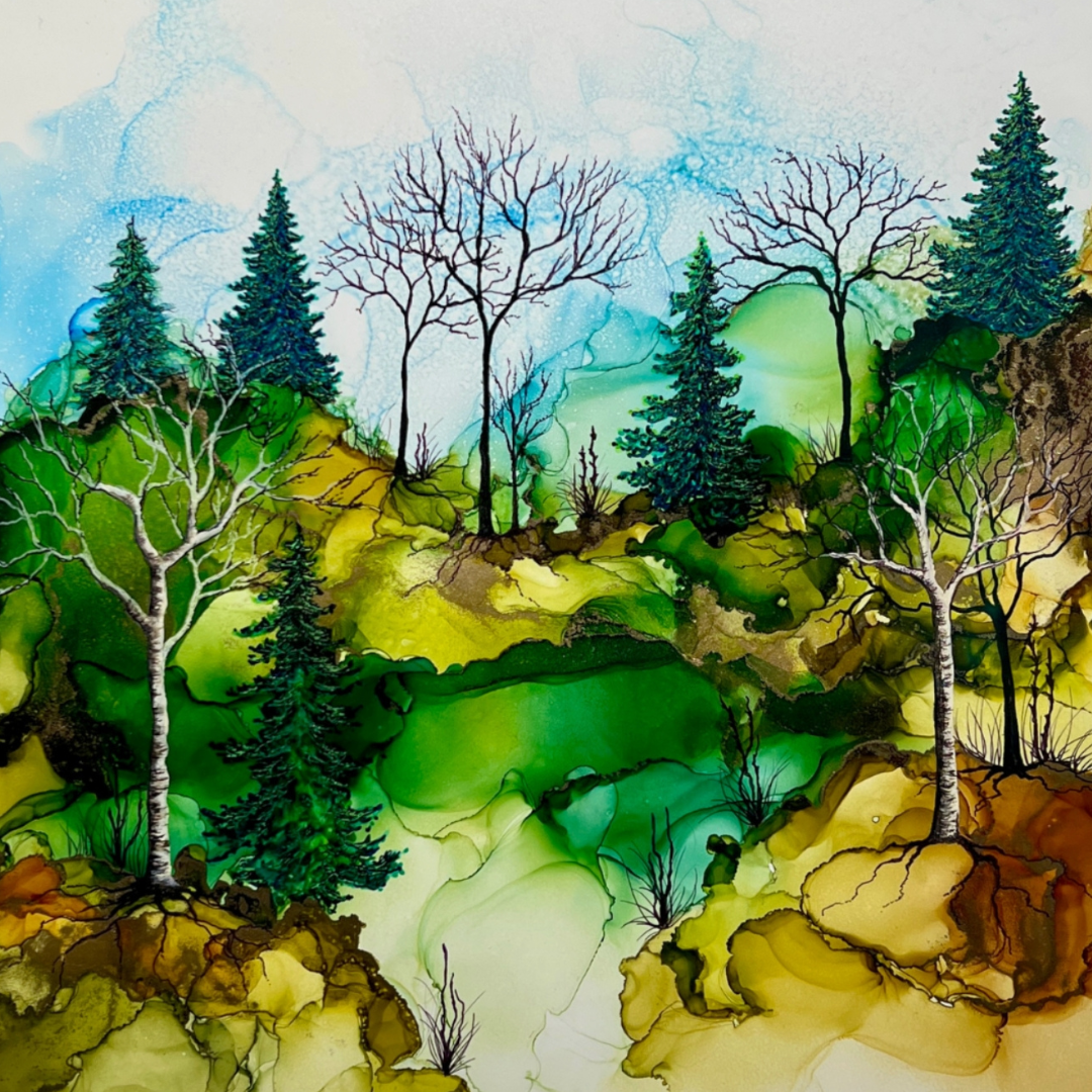 Works from Aimee Tiede's collection of Alcohol Ink paintings are vibrant and stunning, with a three-dimensional quality in person. This pastoral painting depicts iconic New England birches, watching over a peaceful valley.