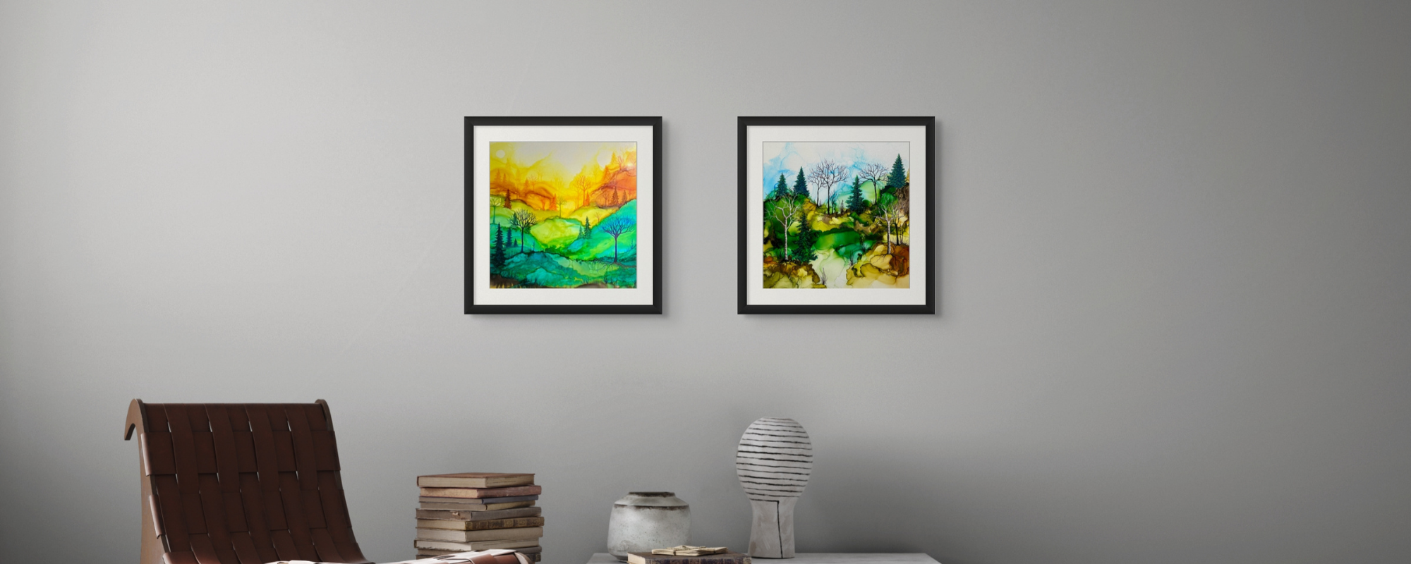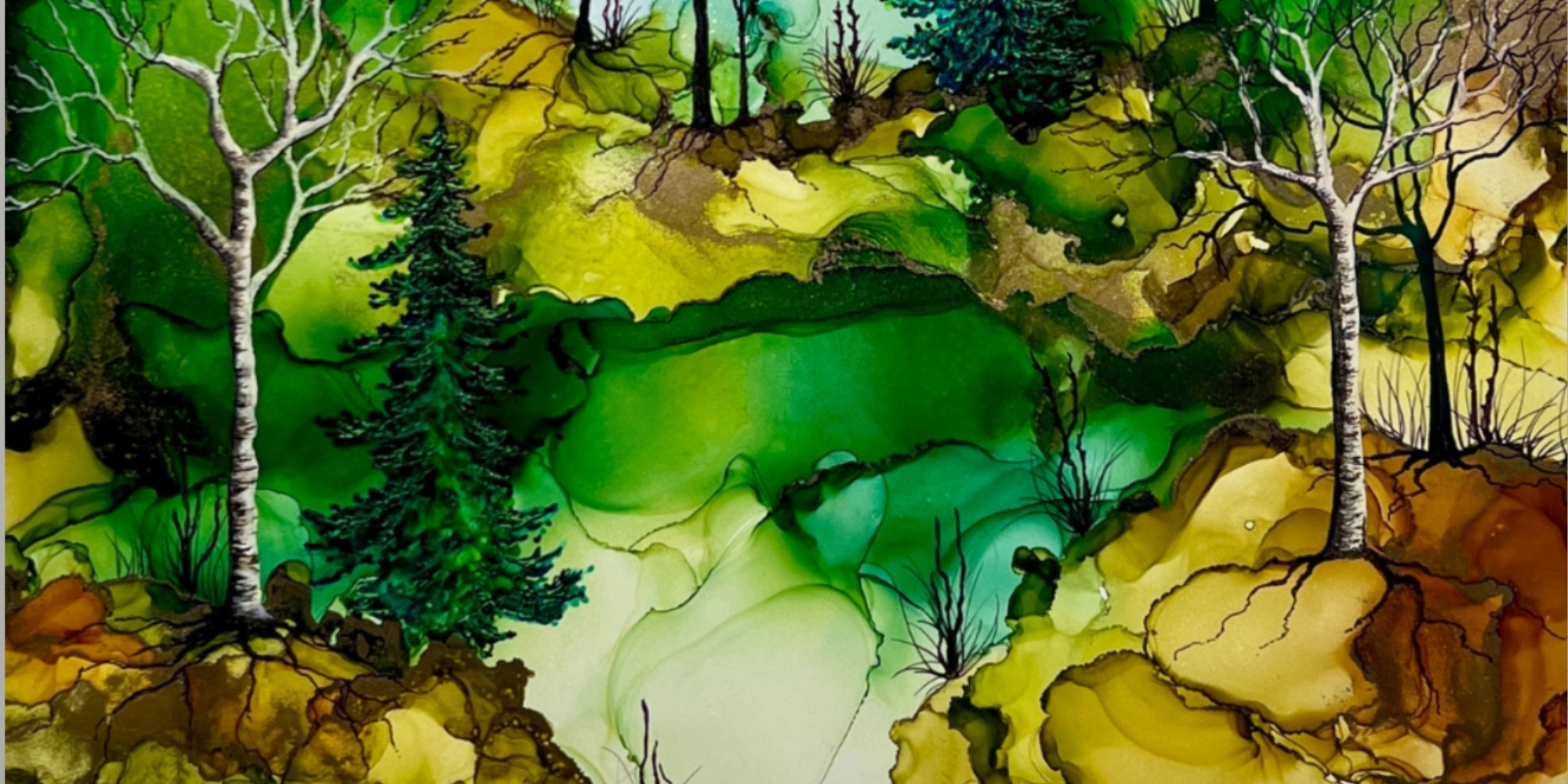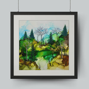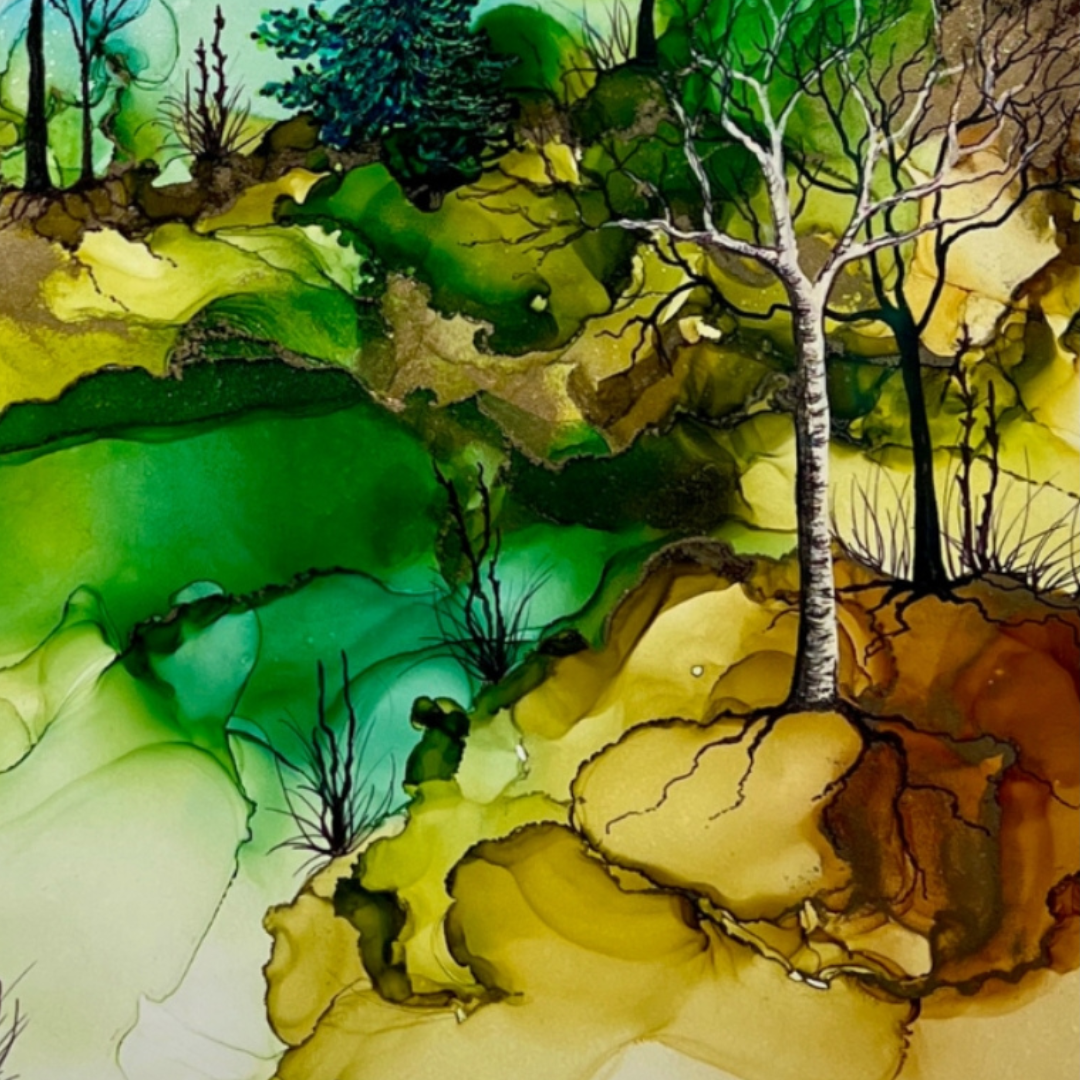 Works from Aimee Tiede's collection of Alcohol Ink paintings are vibrant and stunning, with a three-dimensional quality in person. This pastoral painting depicts iconic New England birches, watching over a peaceful valley.