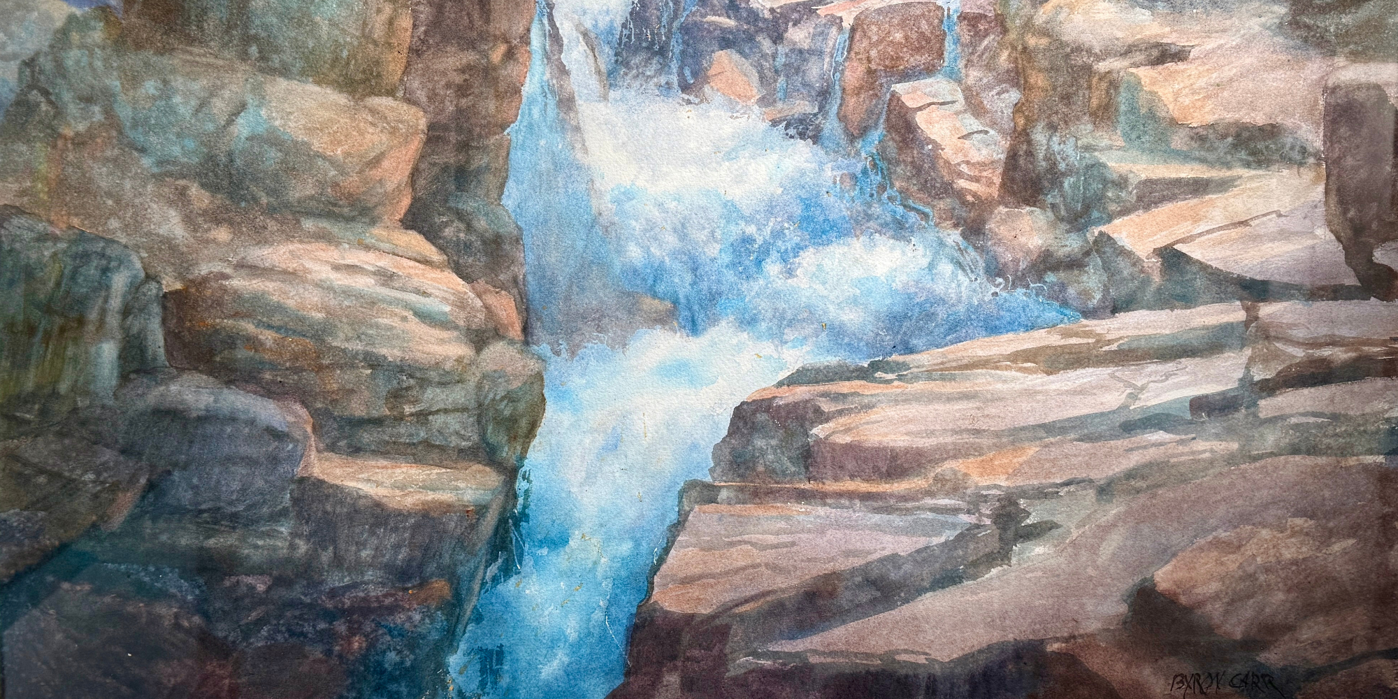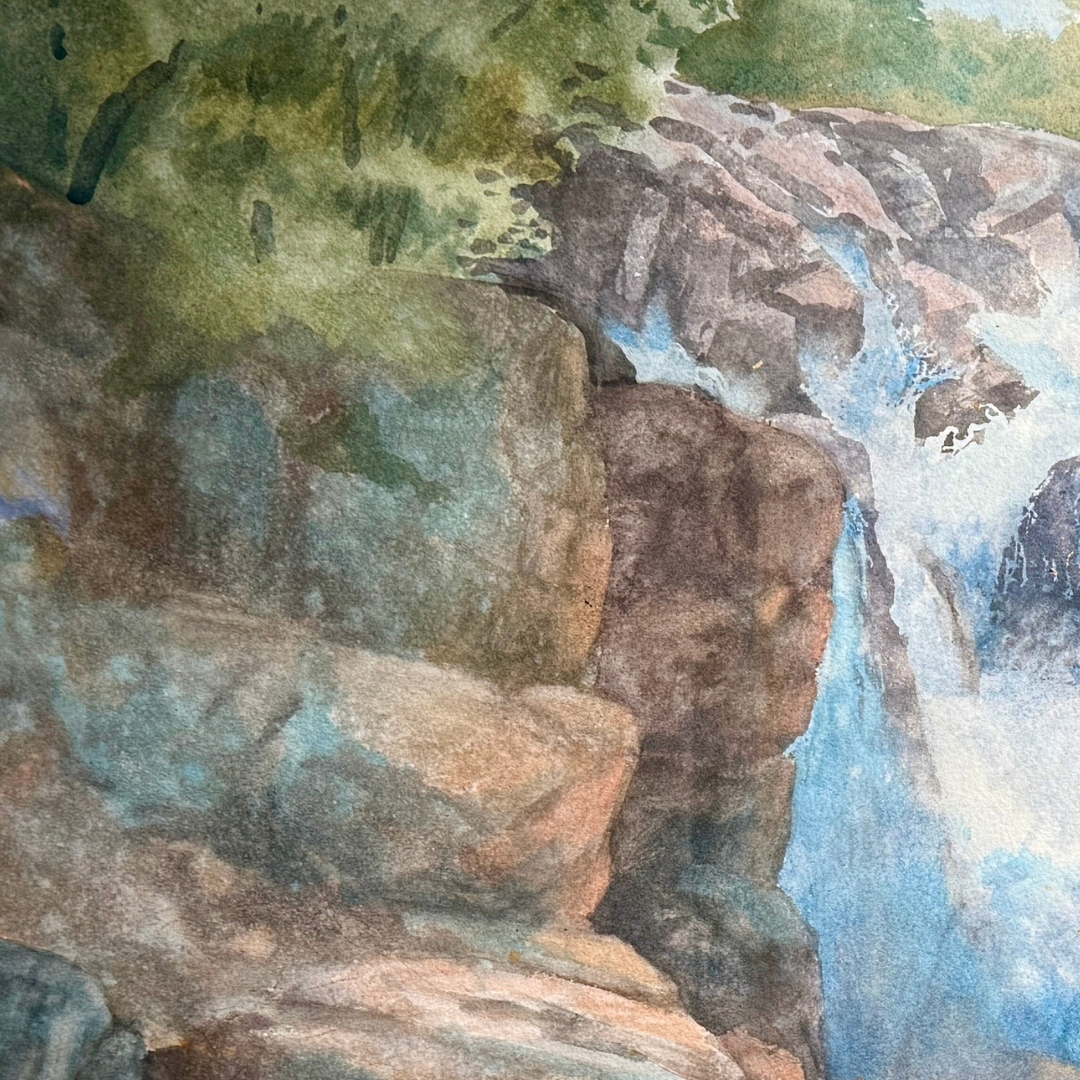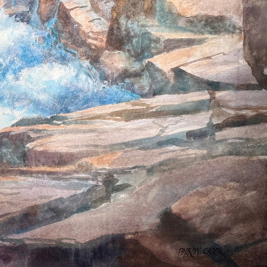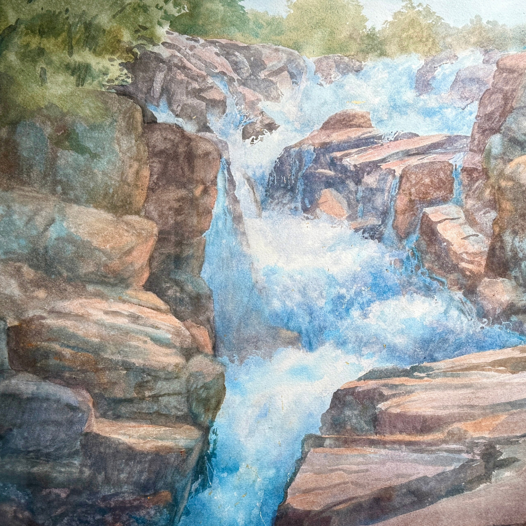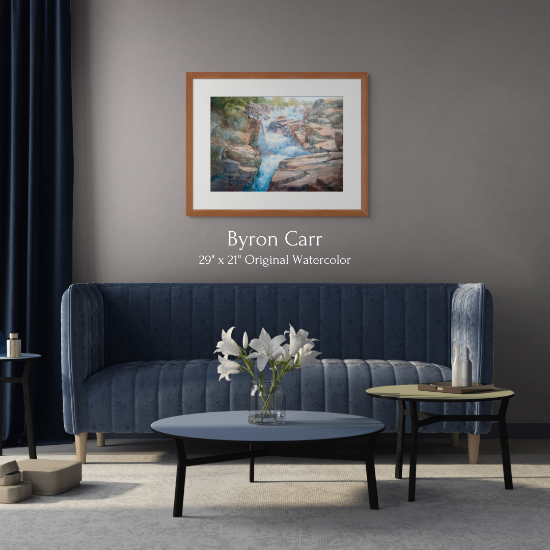 This original watercolor by Byron Carr captures the serene beauty of a New Hampshire waterfall. This framed piece combines natural elements with Carr's distinctive plein air style.