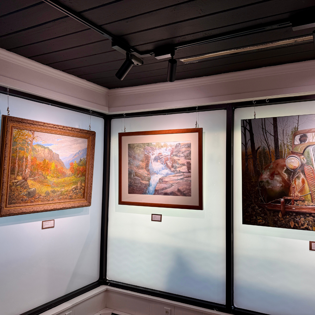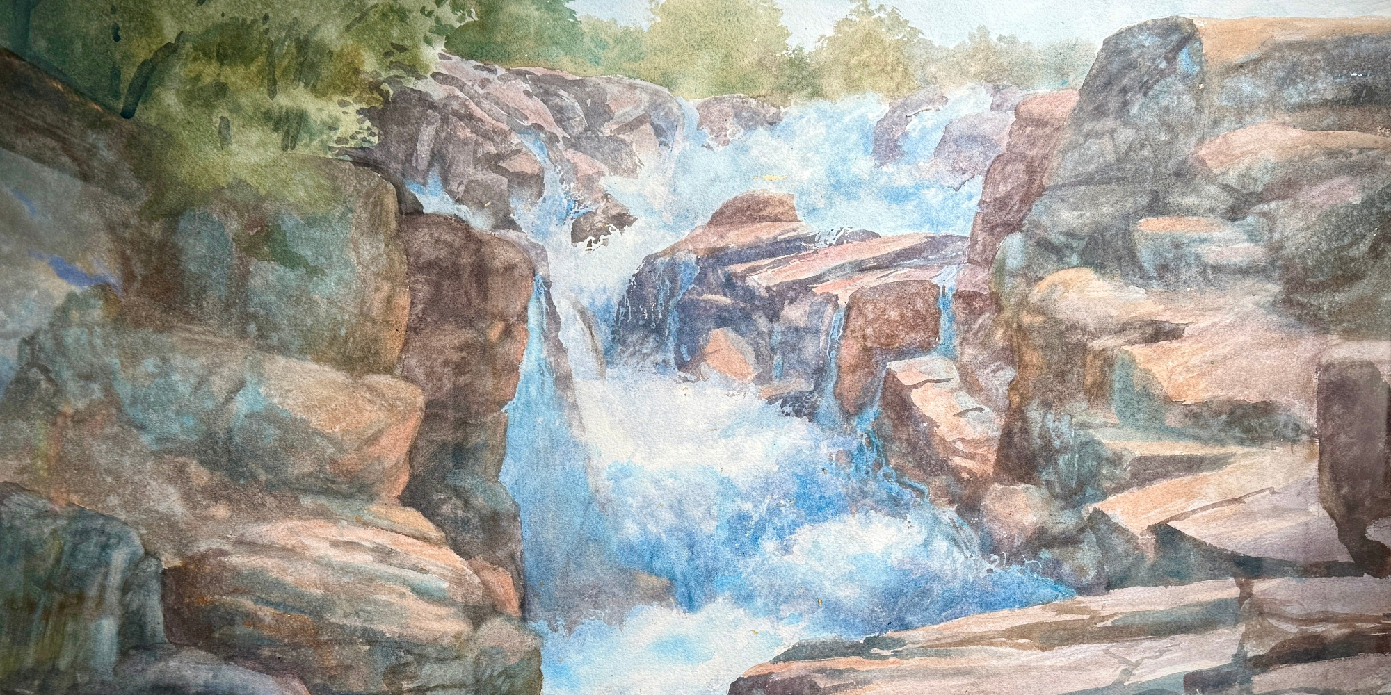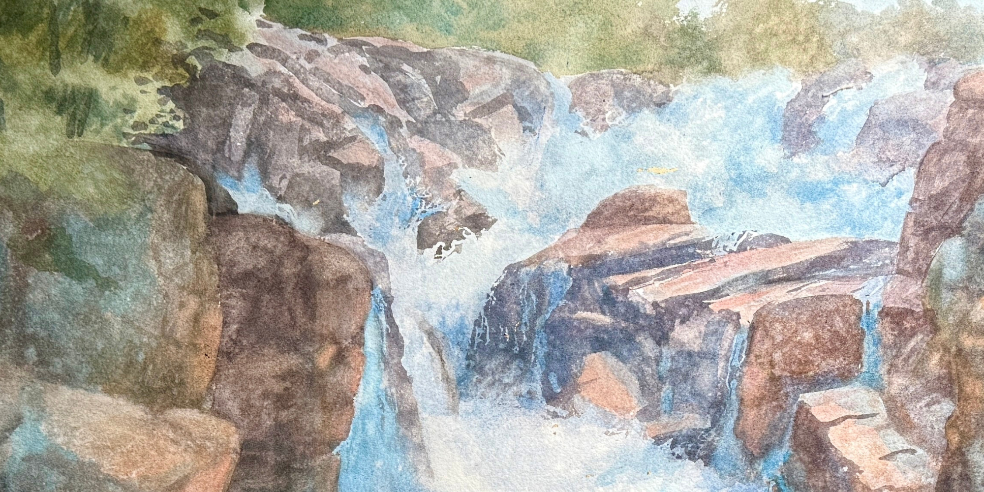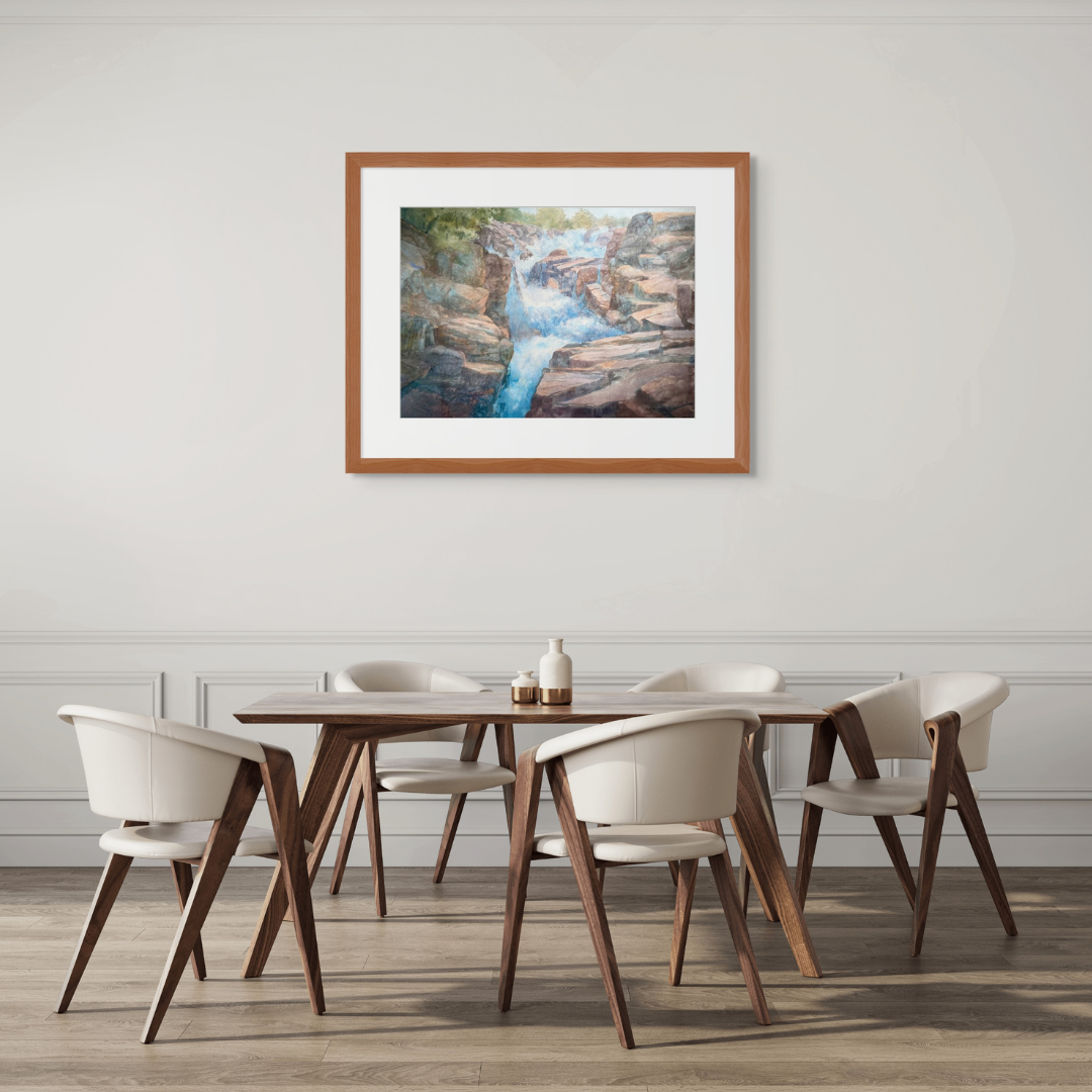 This original watercolor by Byron Carr captures the serene beauty of a New Hampshire waterfall. This framed piece combines natural elements with Carr's distinctive plein air style.