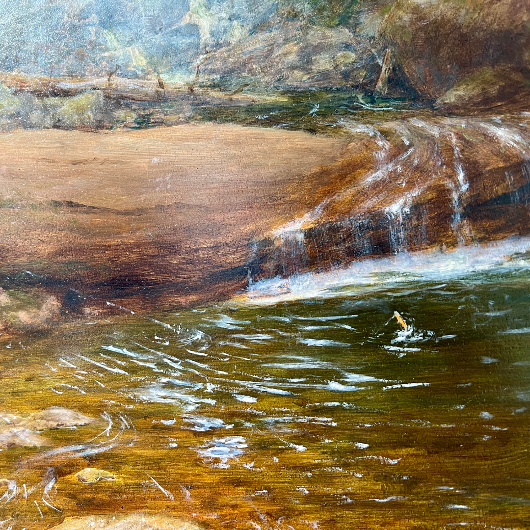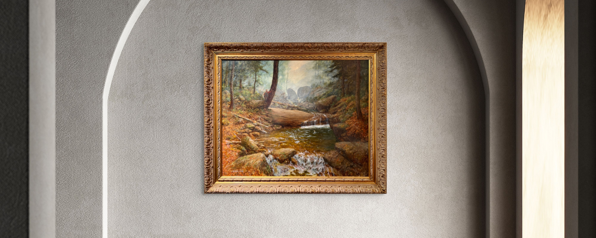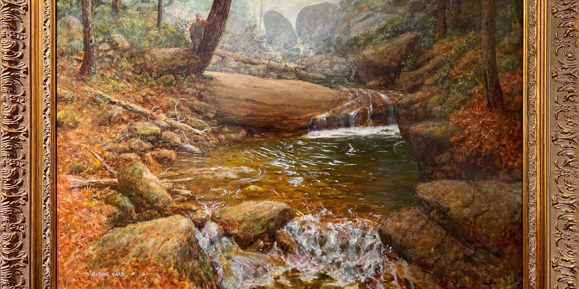 "Fisherman and Two Bears" captures a dramatic scene at Ledge Brook along the Kancamagus Highway. In the painting, a fisherman finds himself hiding from two bears near the picturesque Ledge Brook Falls. The tranquil beauty of the flowing water contrasts with the tension of the encounter, highlighting the wild, untamed nature of the New Hampshire wilderness. The piece evokes both the serenity of the landscape and the thrill of an unexpected encounter with wildlife.