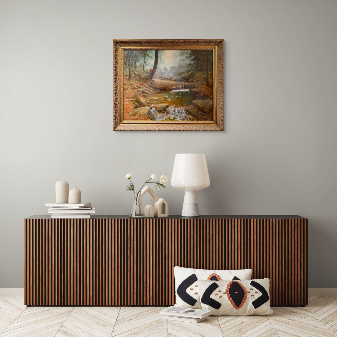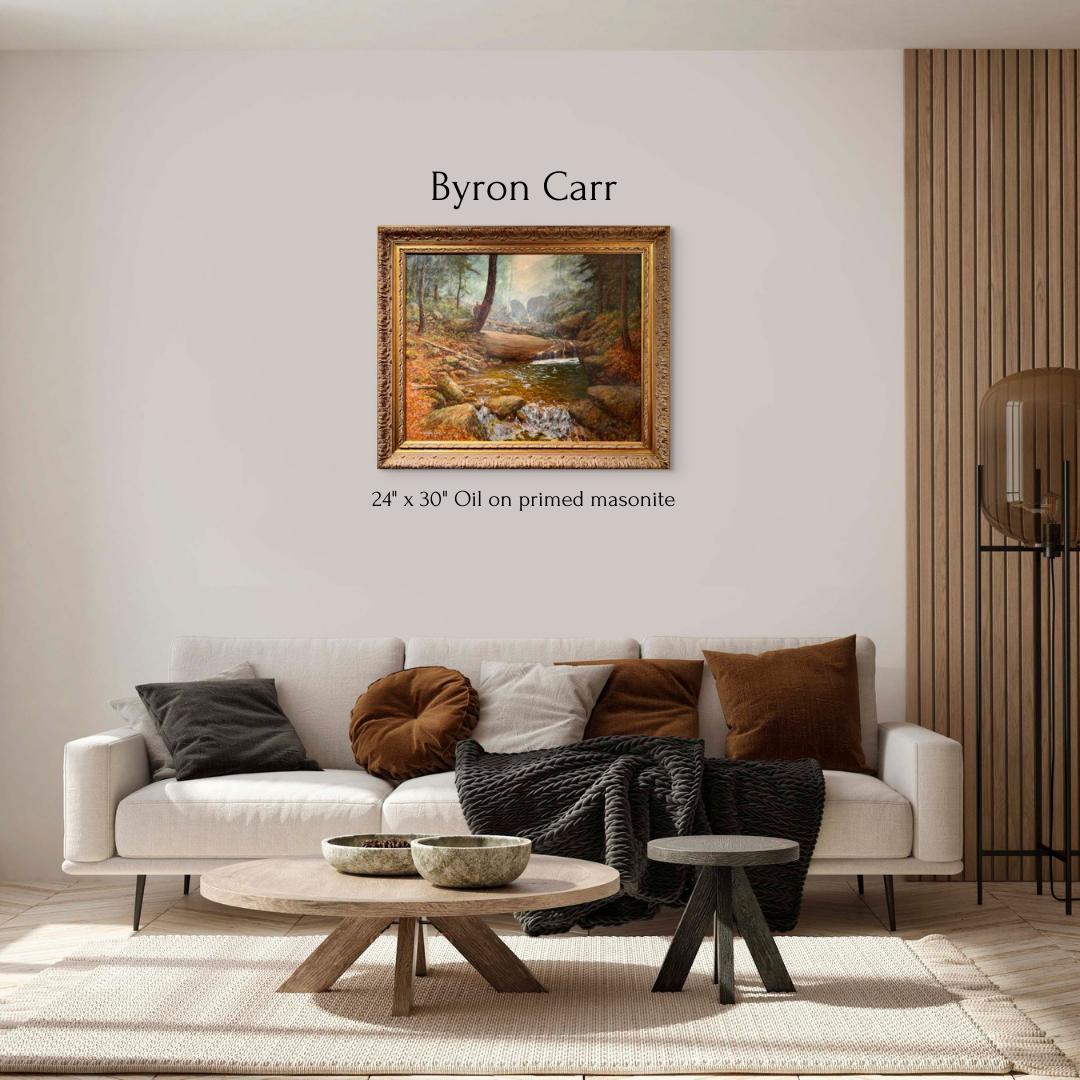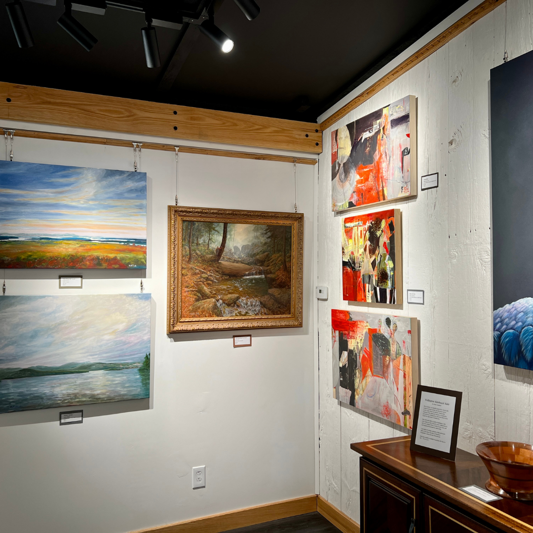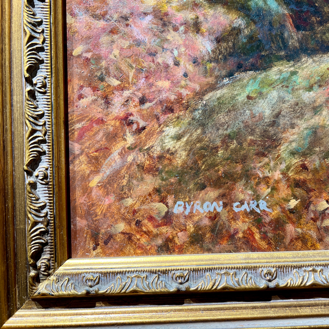 "Fisherman and Two Bears" captures a dramatic scene at Ledge Brook along the Kancamagus Highway. In the painting, a fisherman finds himself hiding from two bears near the picturesque Ledge Brook Falls. The tranquil beauty of the flowing water contrasts with the tension of the encounter, highlighting the wild, untamed nature of the New Hampshire wilderness. The piece evokes both the serenity of the landscape and the thrill of an unexpected encounter with wildlife.