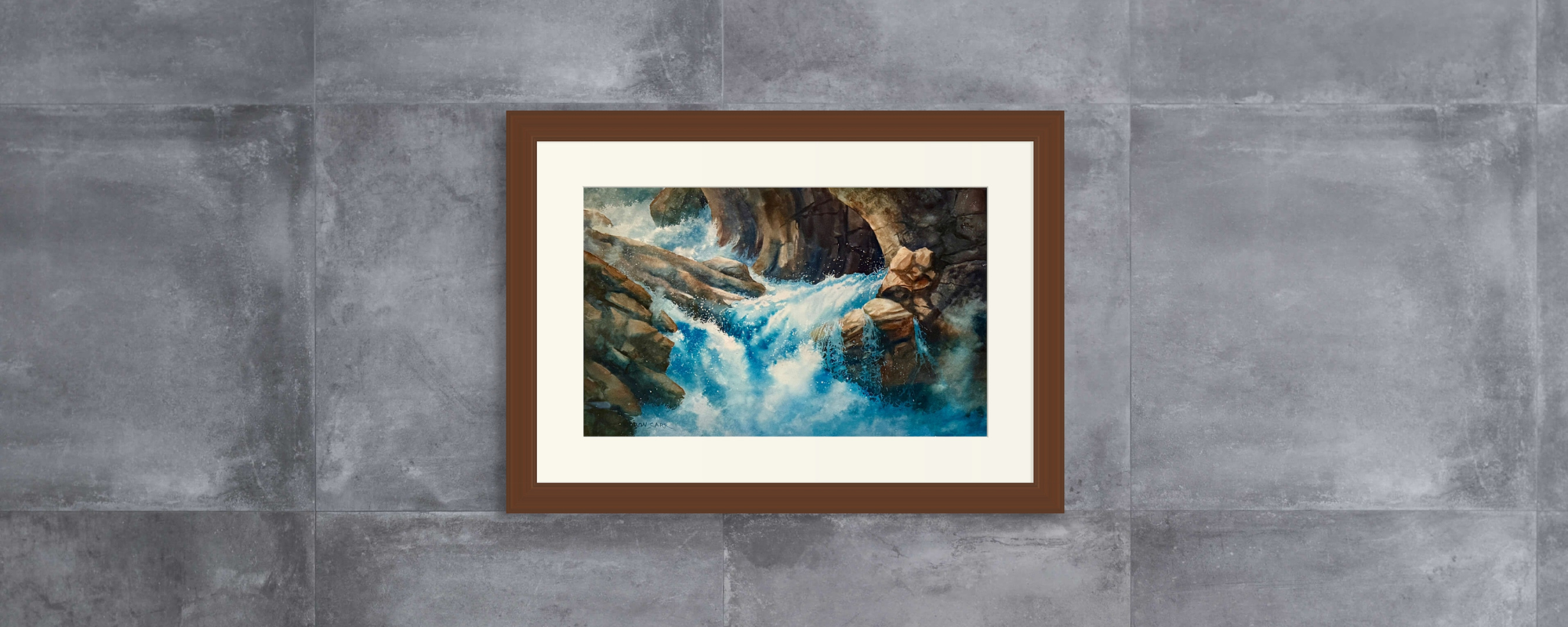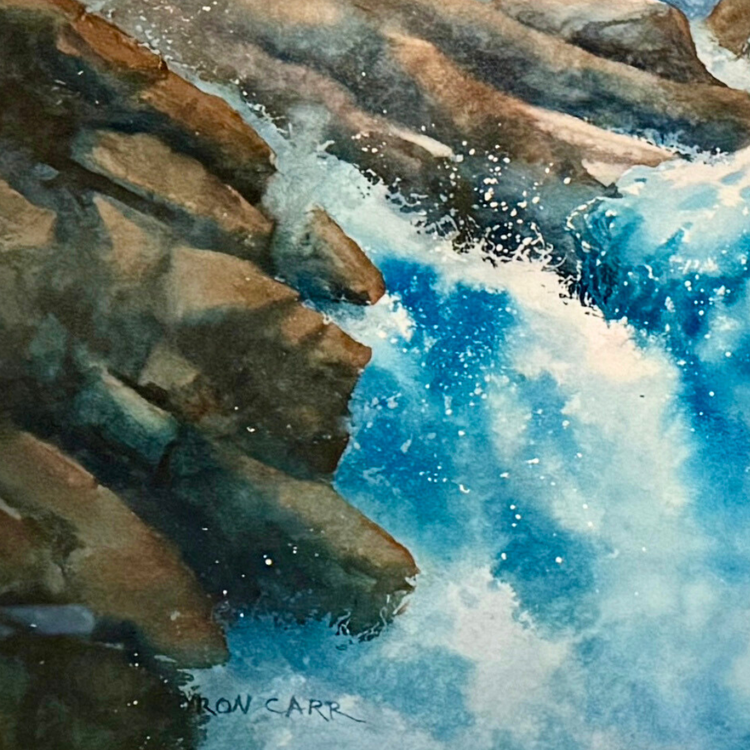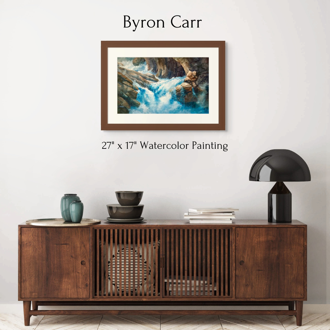 This original watercolor by Byron Carr features a serene waterfall scene framed with natural elements. The piece is matted and framed, ready for display.