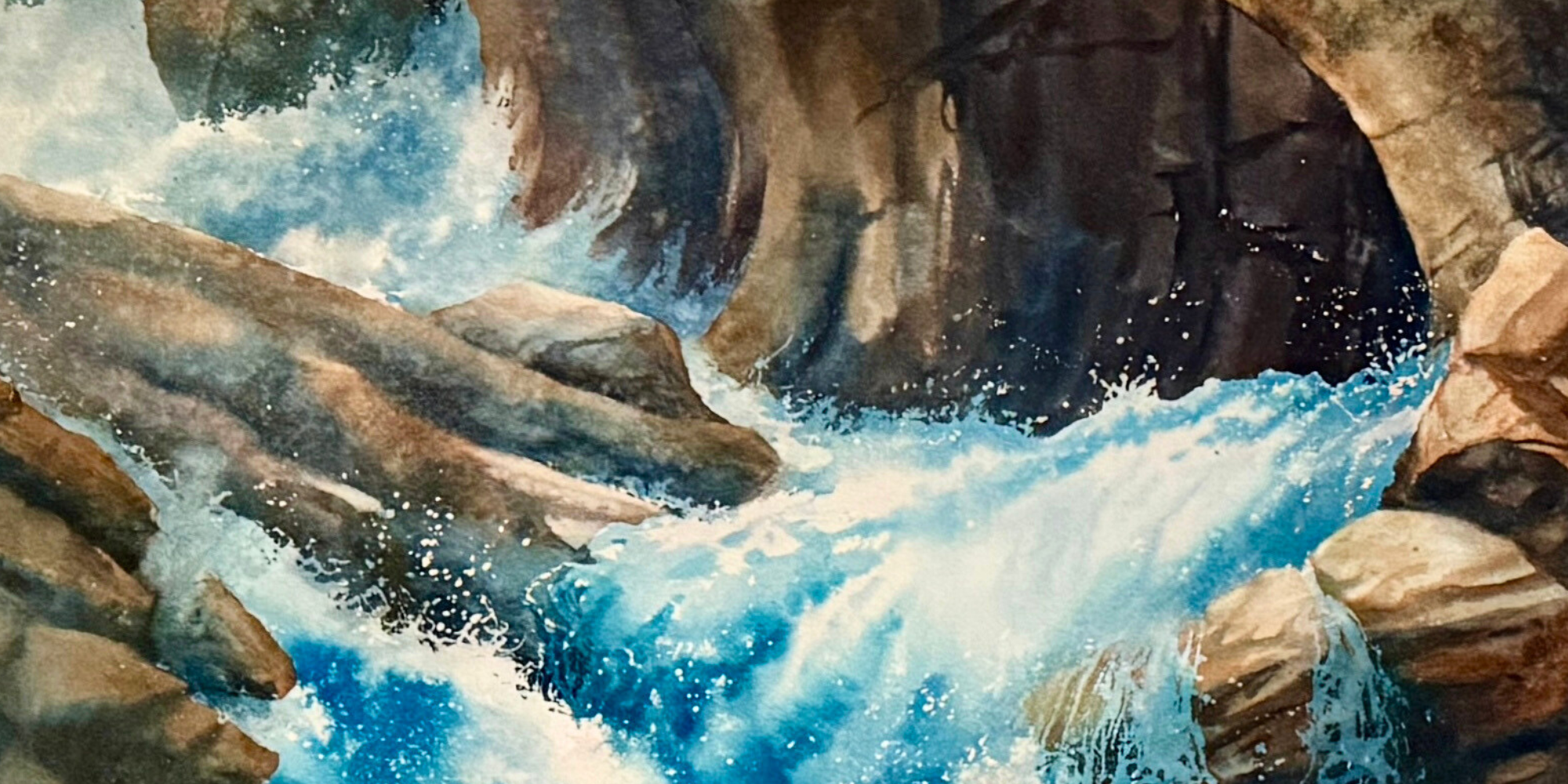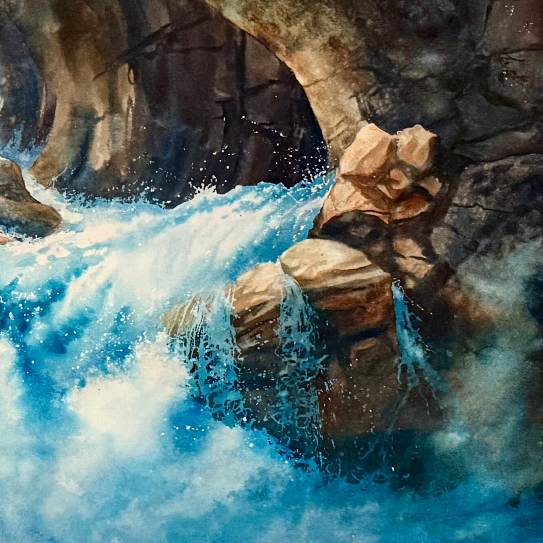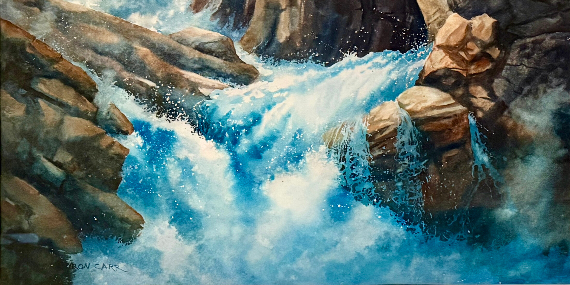 This original watercolor by Byron Carr features a serene waterfall scene framed with natural elements. The piece is matted and framed, ready for display.