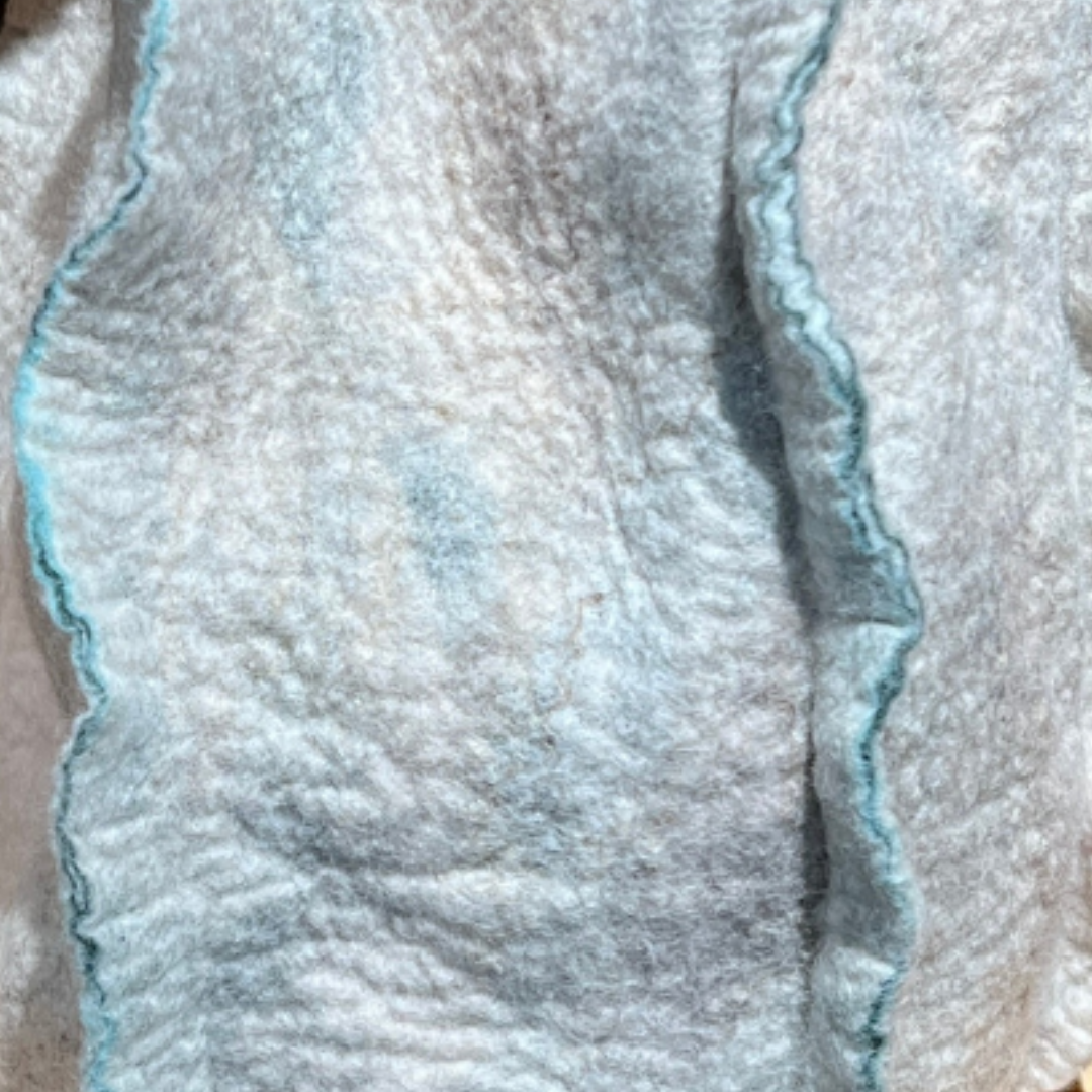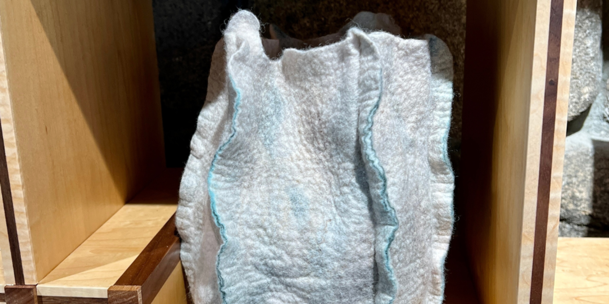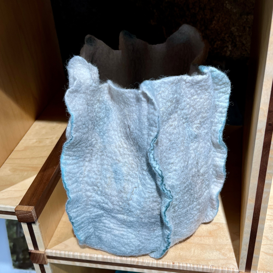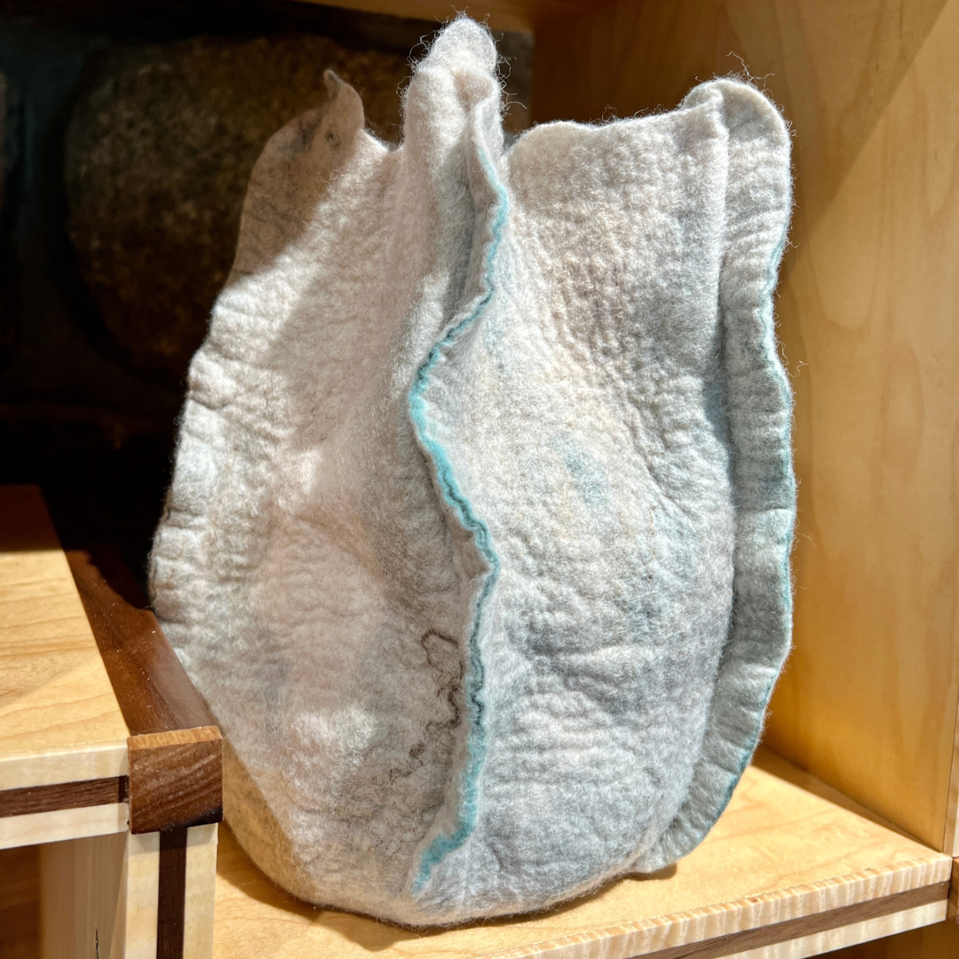 This hand-made merino wool felt vessel is both decorative and functional, making it an ideal addition to any space. It offers a unique texture and design for fiber art enthusiasts and collectors.