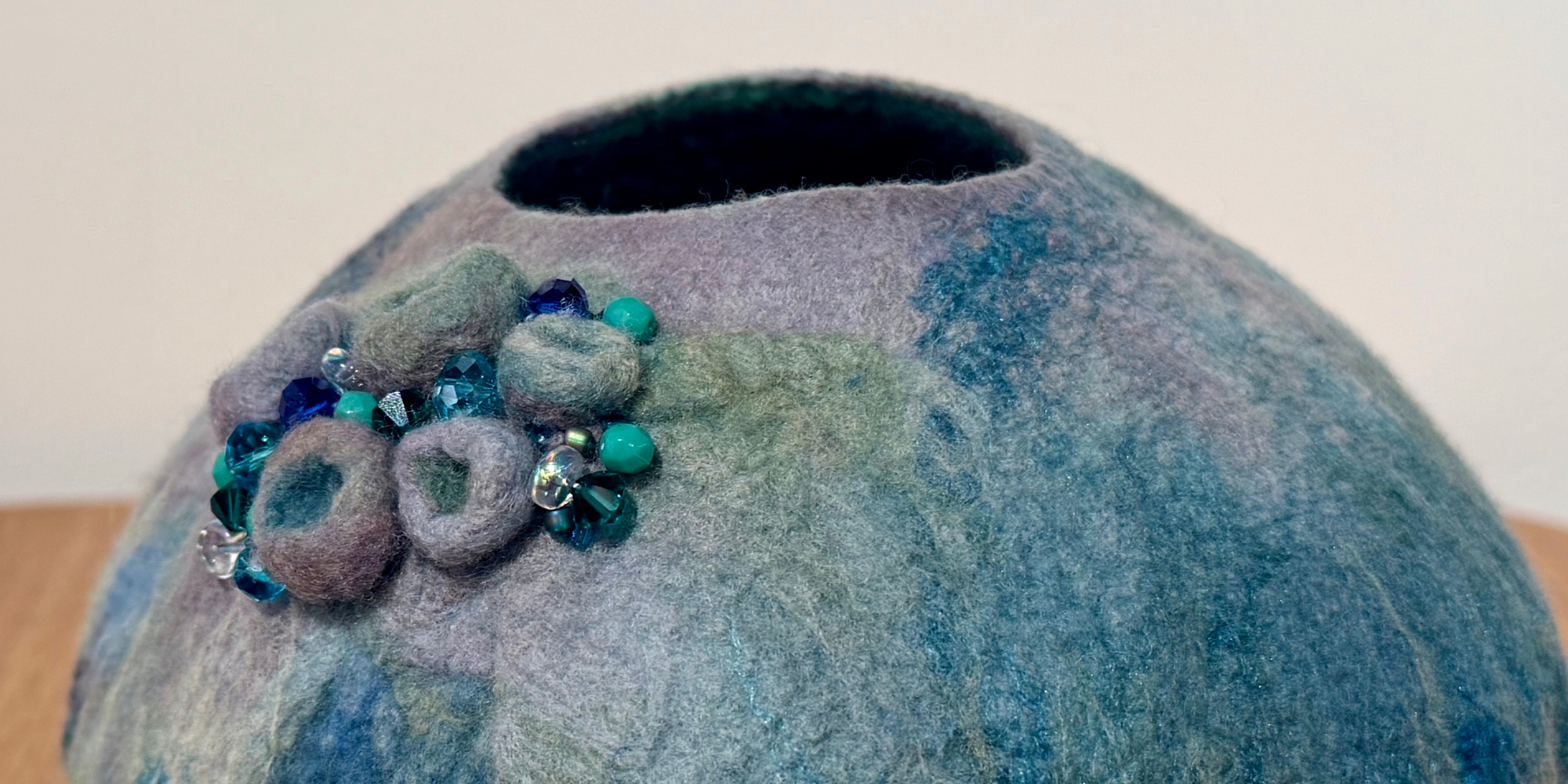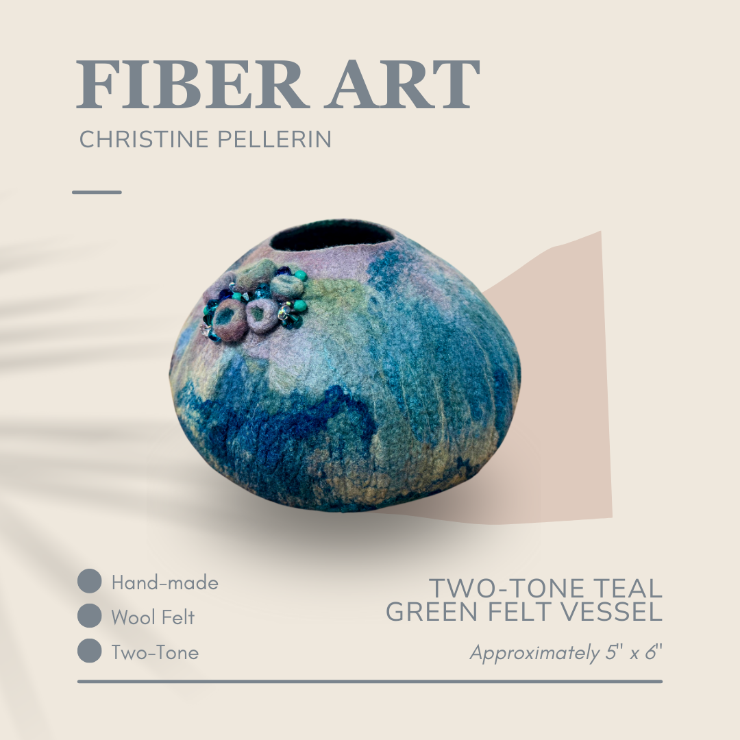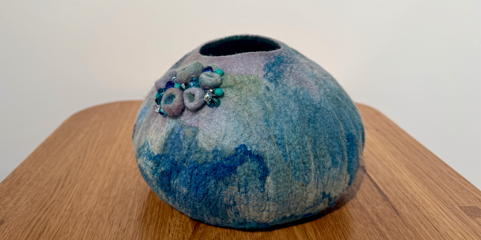 Christine crafts these lovely vessels using hand-felted merino wool. This technique, called 'wet felting,' creates art that looks like a vase but is fuzzy and far less breakable