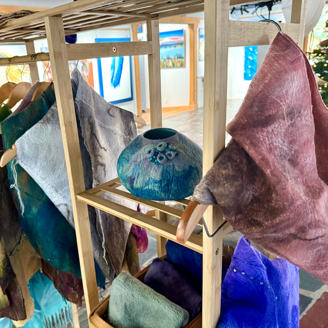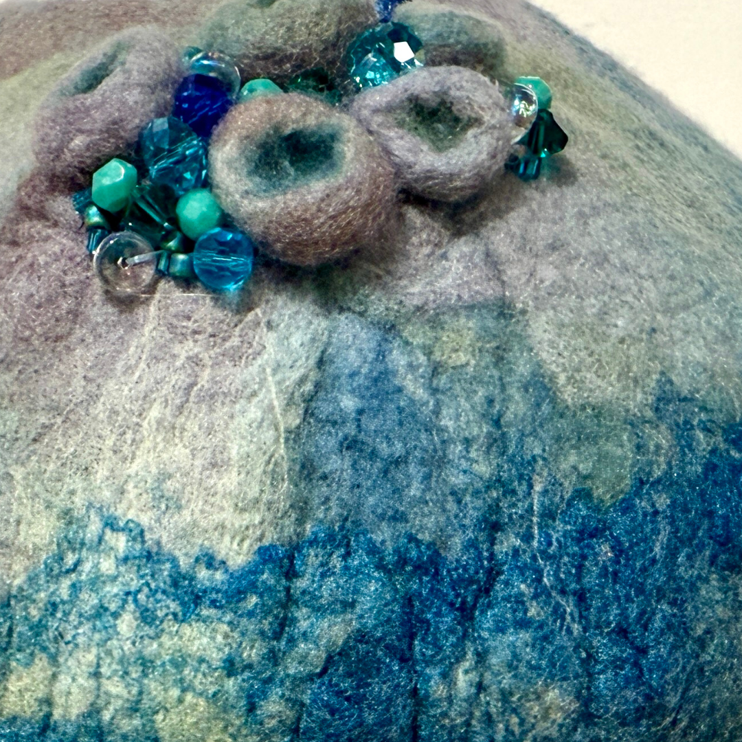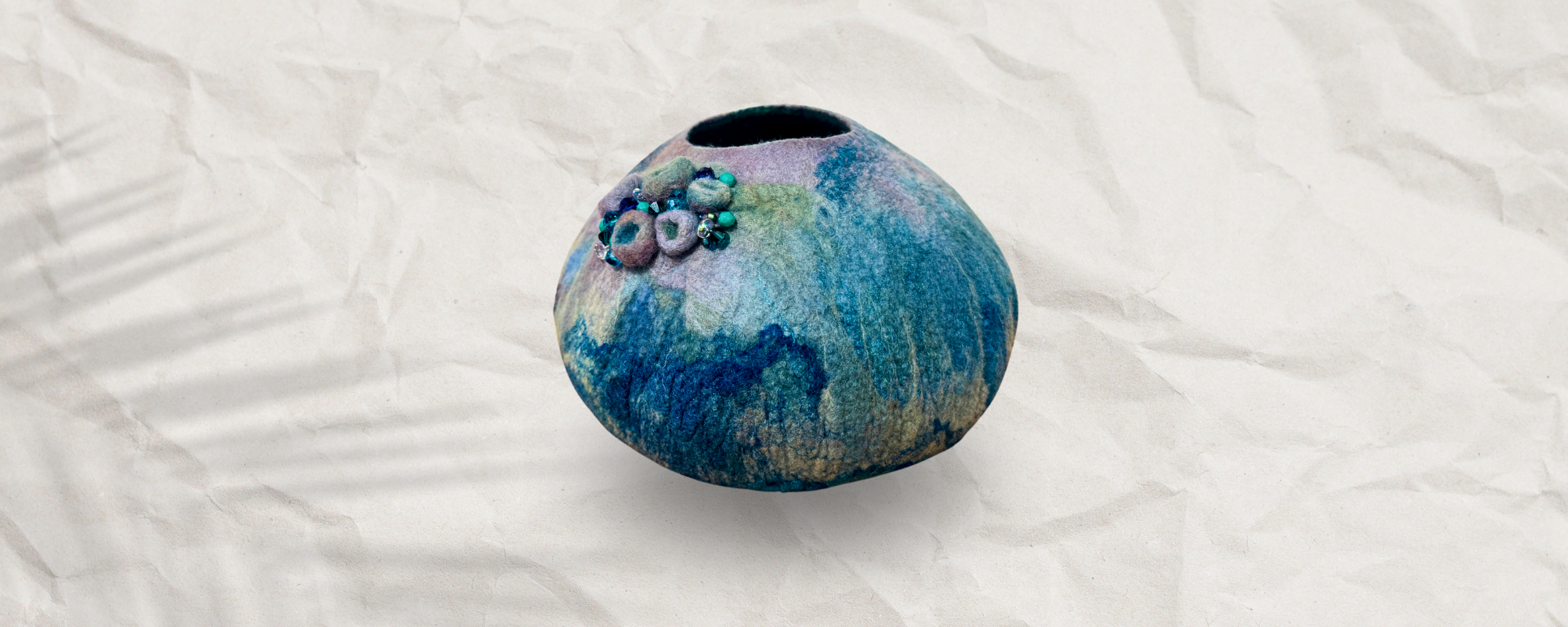 Christine crafts these lovely vessels using hand-felted merino wool. This technique, called 'wet felting,' creates art that looks like a vase but is fuzzy and far less breakable