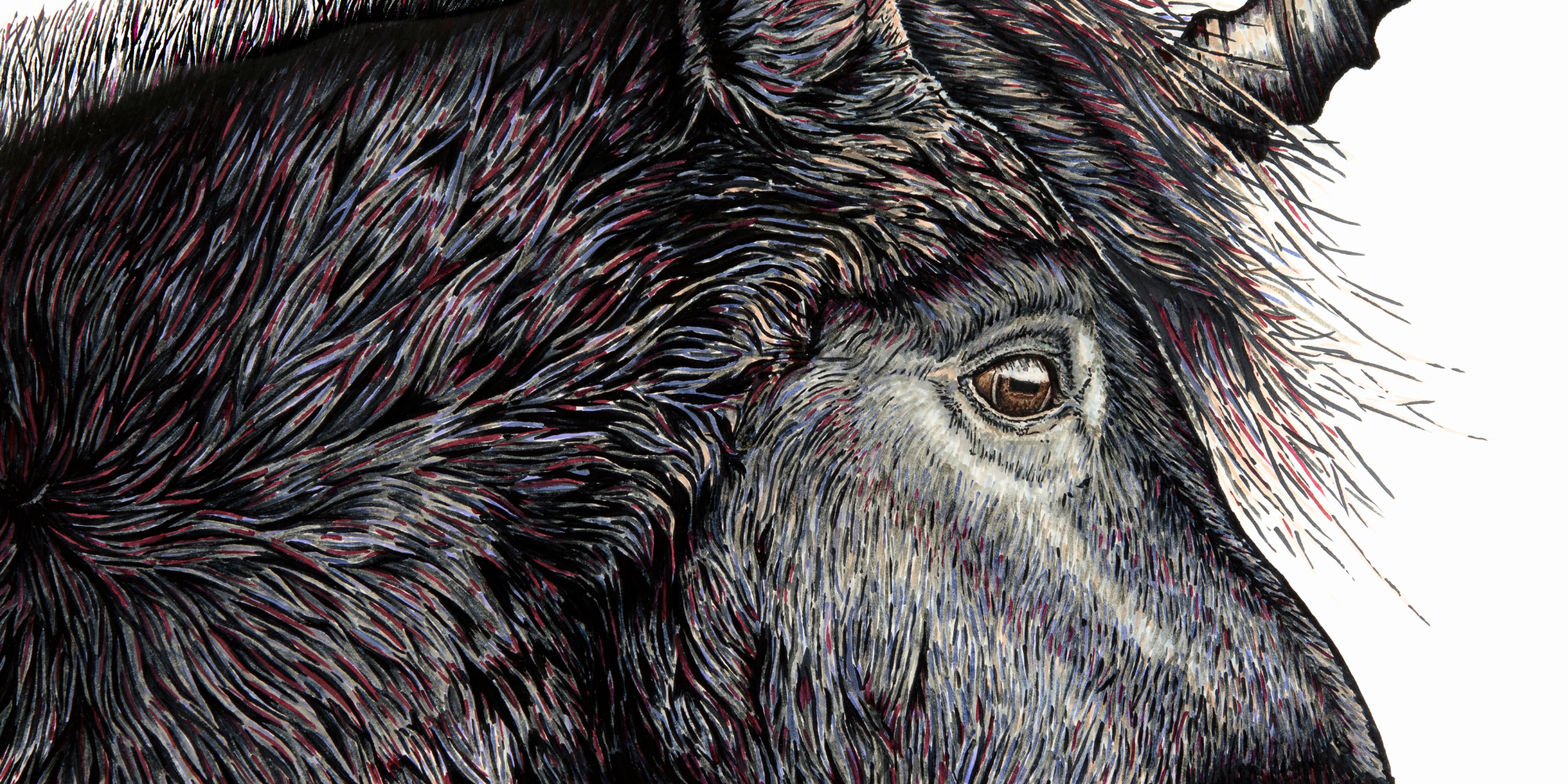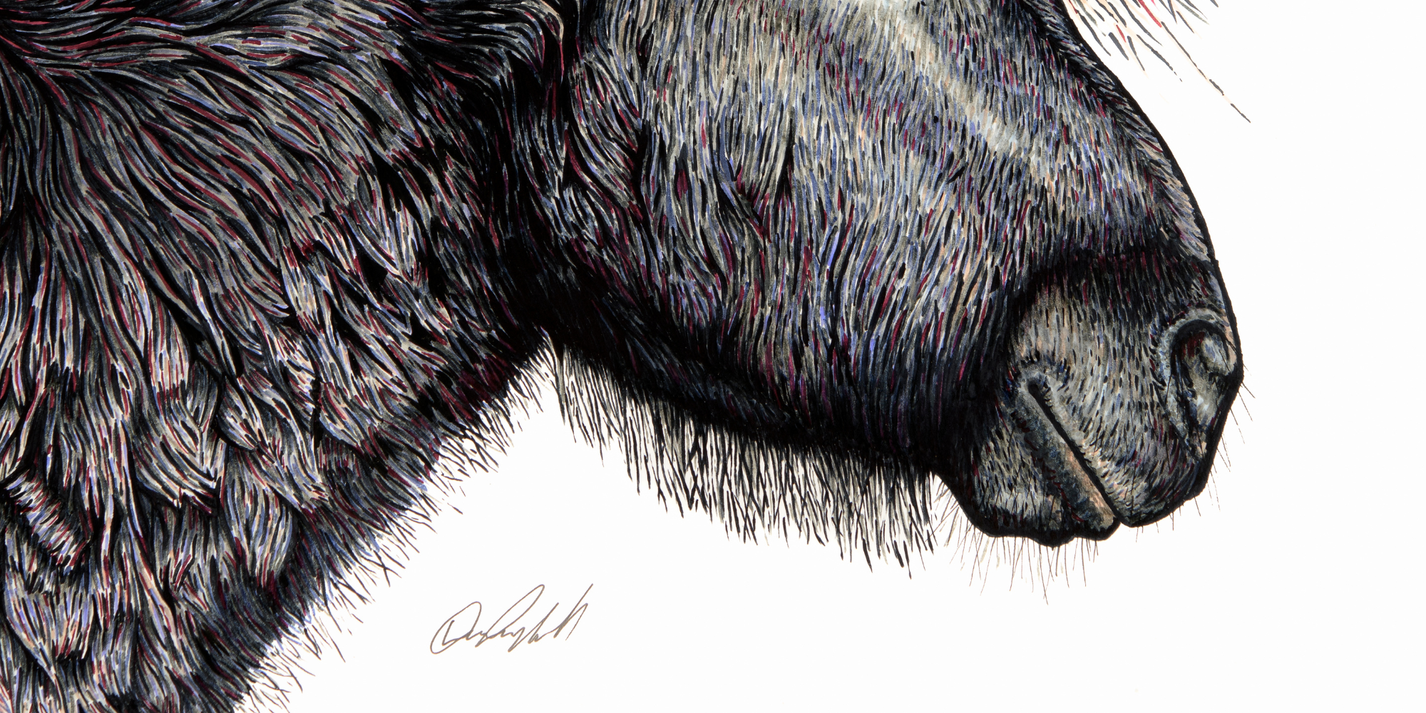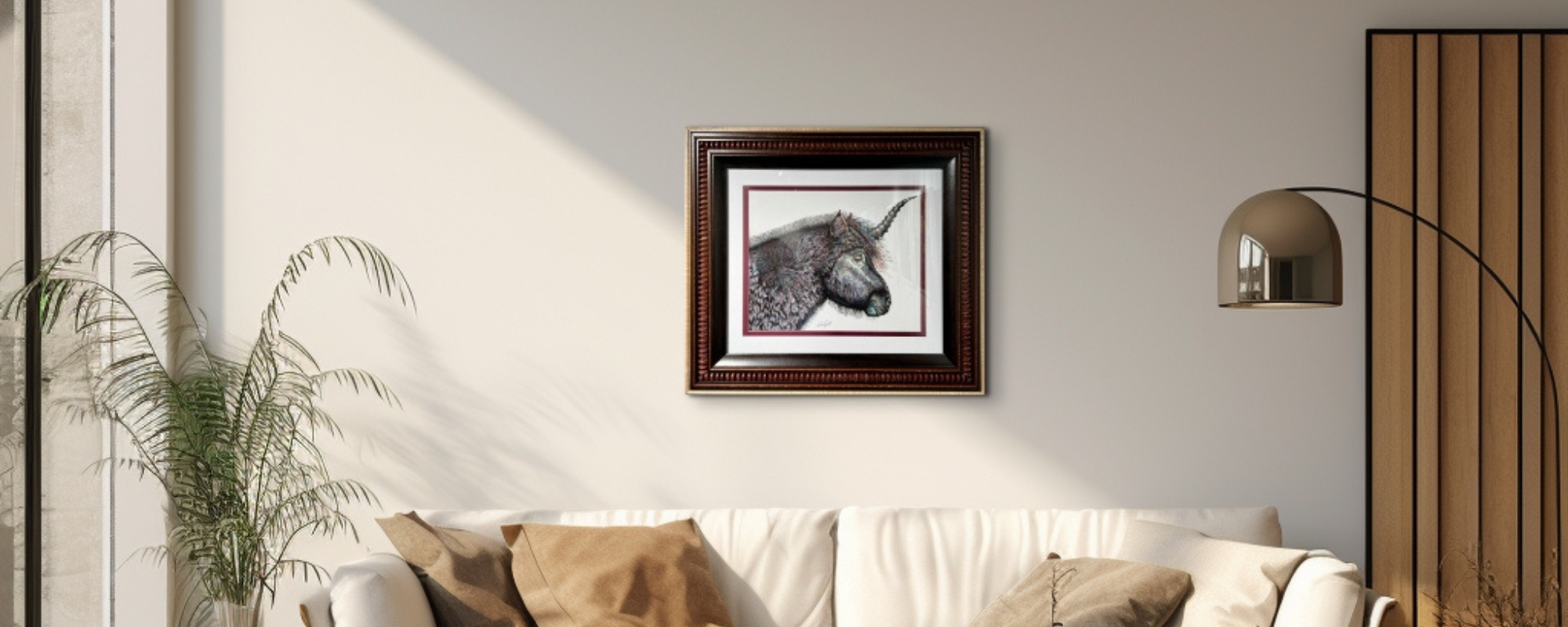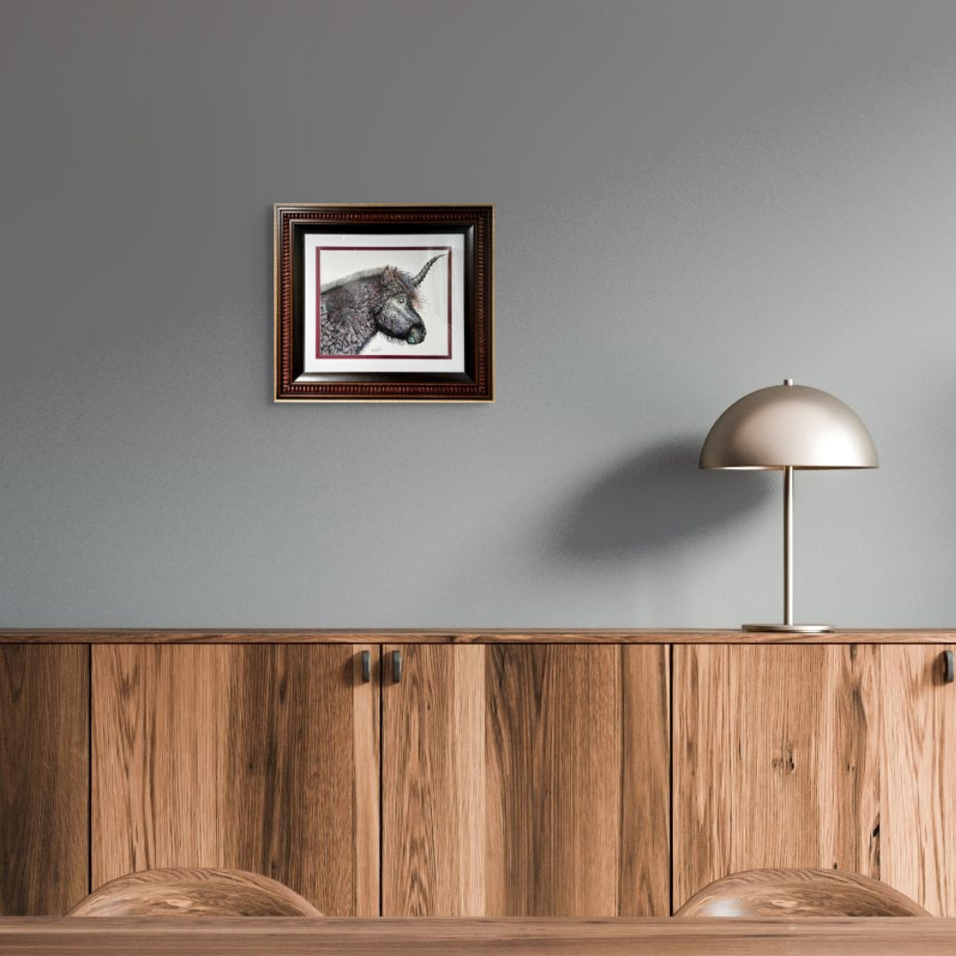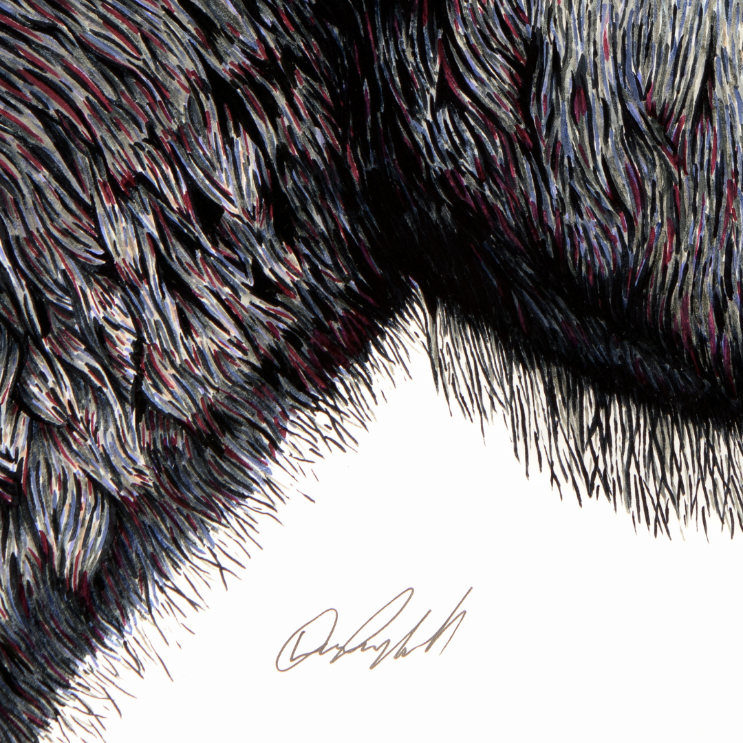 Dana custom-matted and framed this original as a creative extension of the piece. The bold and elaborate frame compliments the majesty (and silliness) of this mythical creature. It is constructed of cherry wood, purple heart, lacewood, and curly maple.