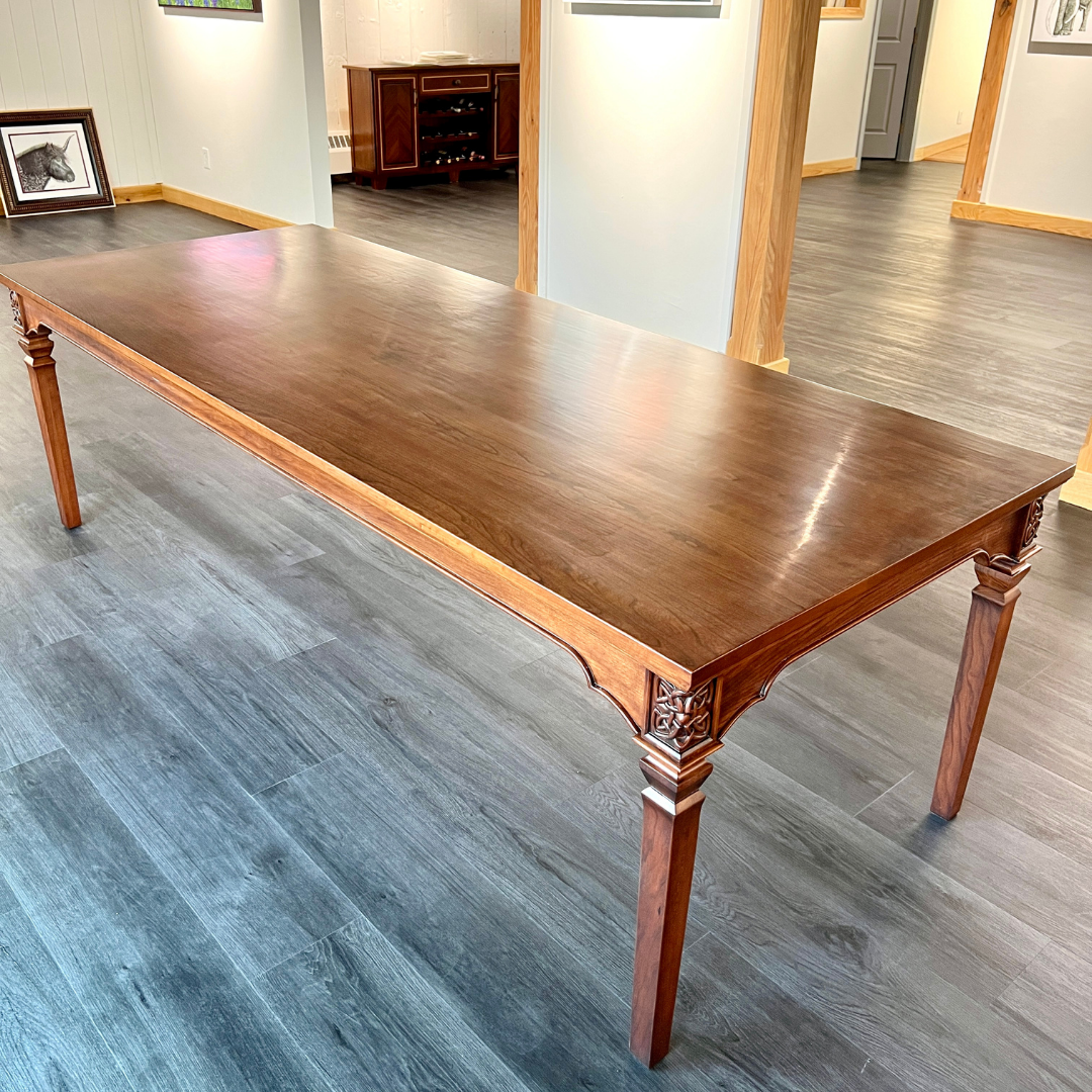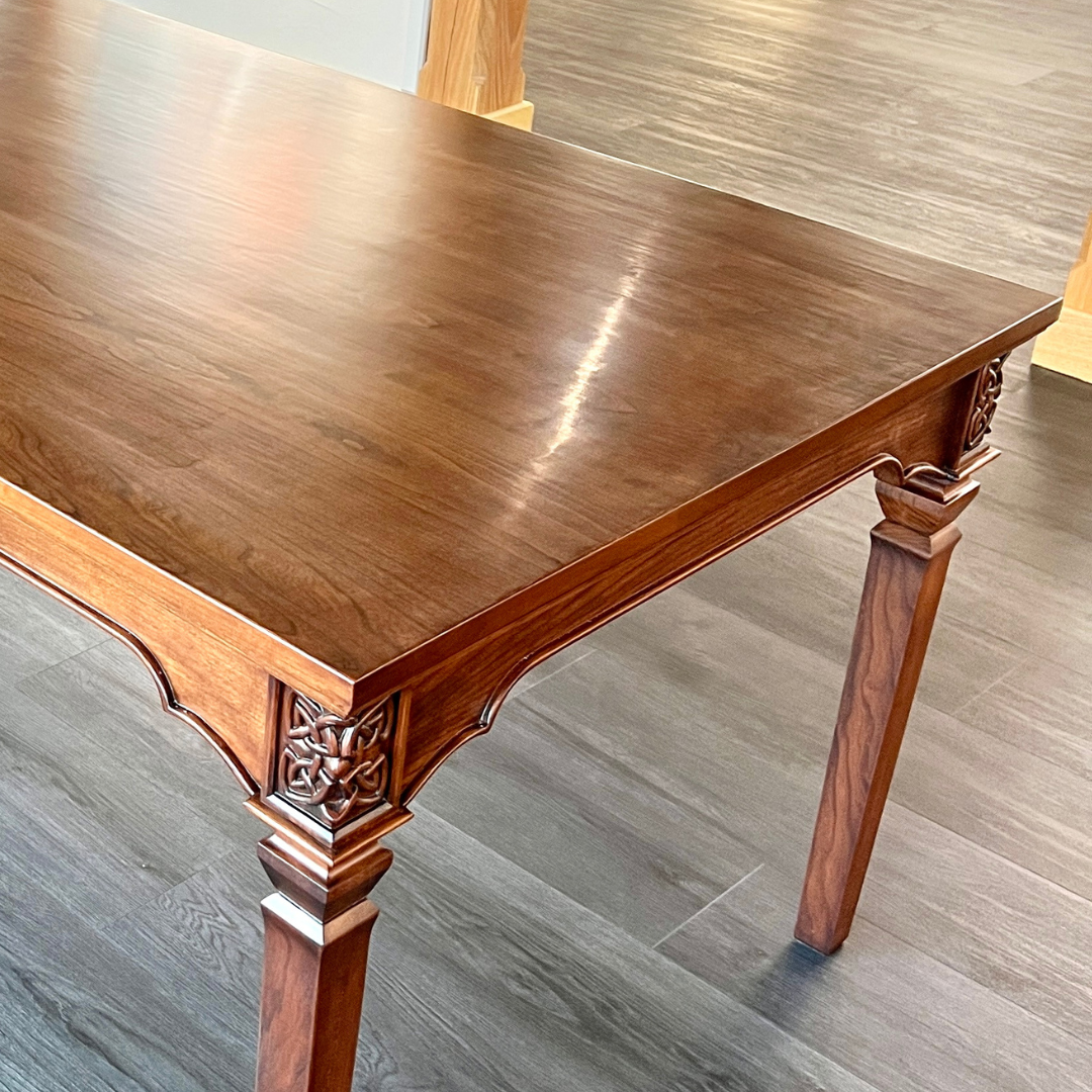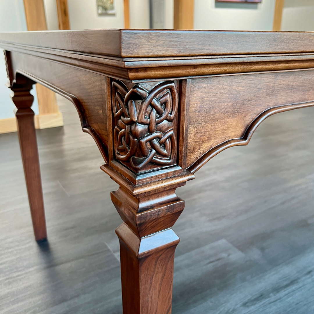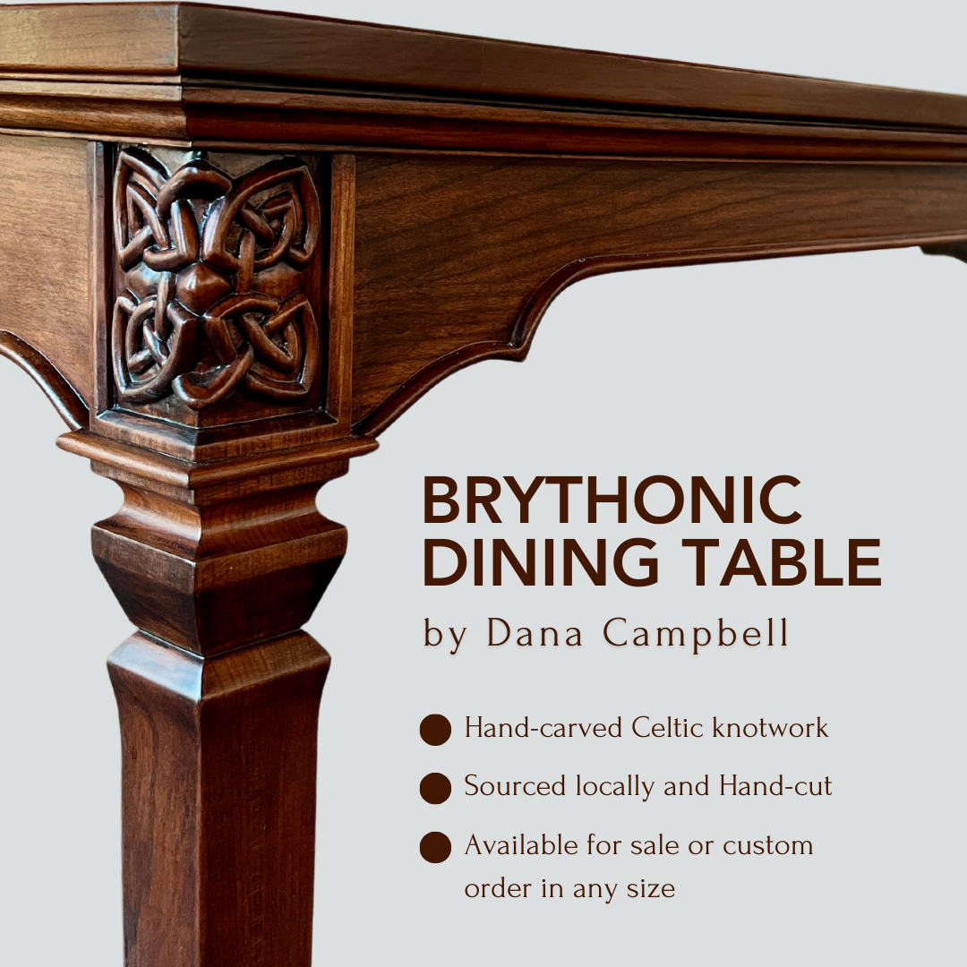 The Brythonic Dining Table is a handcrafted piece made from locally sourced black cherry wood. Featuring hand-carved Celtic knotwork on the legs and intricate beading along the skirting, this table combines traditional craftsmanship with functional design. It seats ten for casual use or eight for formal dining, making it versatile for any dining space. Customizable to fit your specifications.