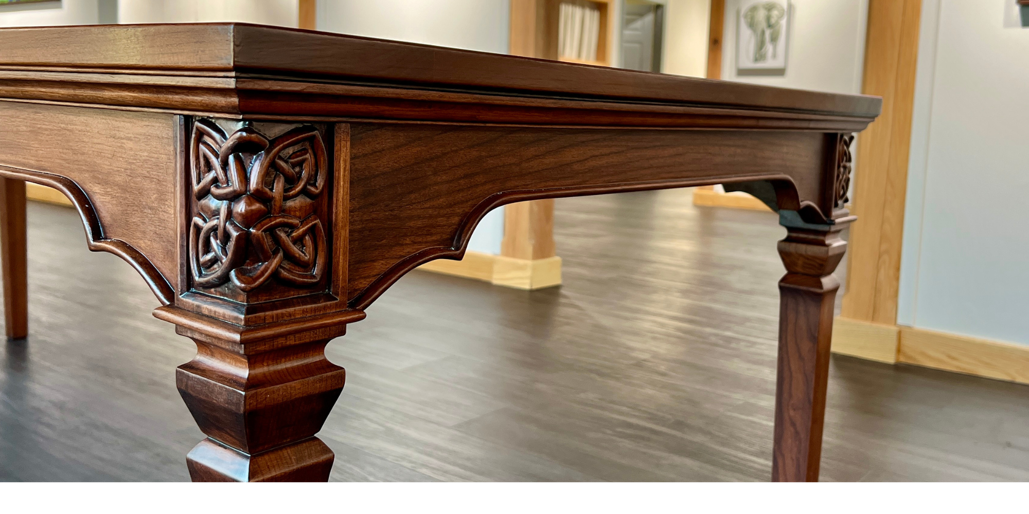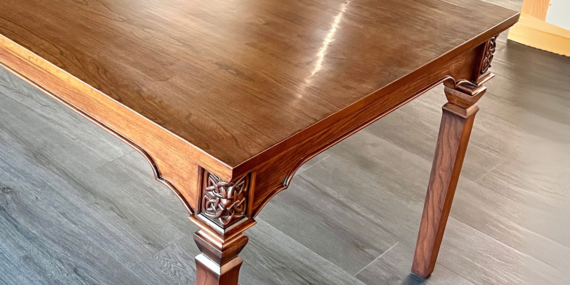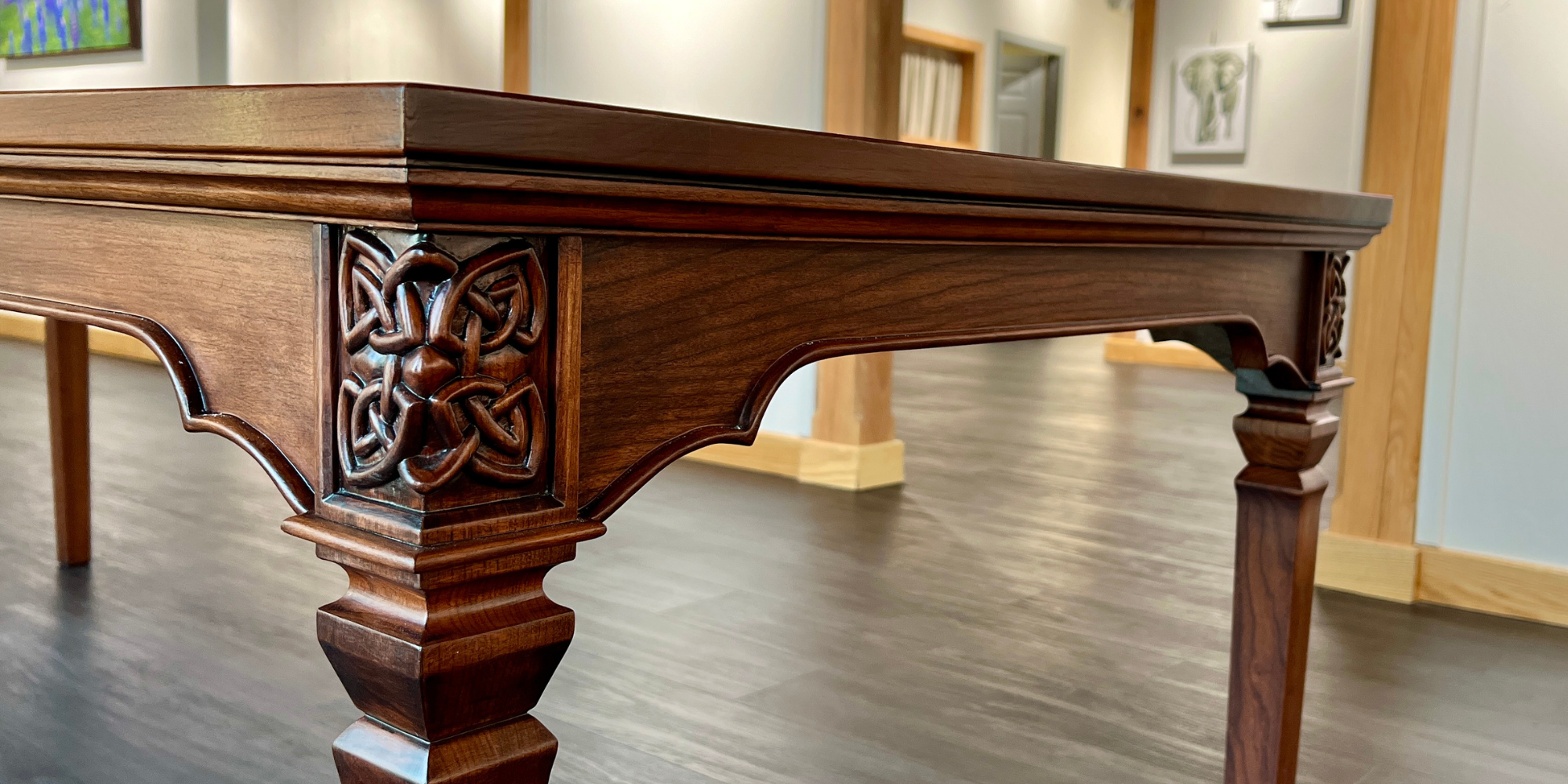 The Brythonic Dining Table is a handcrafted piece made from locally sourced black cherry wood. Featuring hand-carved Celtic knotwork on the legs and intricate beading along the skirting, this table combines traditional craftsmanship with functional design. It seats ten for casual use or eight for formal dining, making it versatile for any dining space. Customizable to fit your specifications.