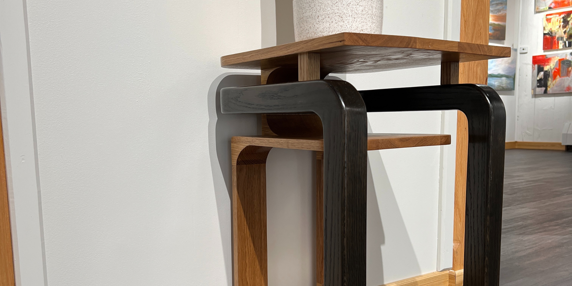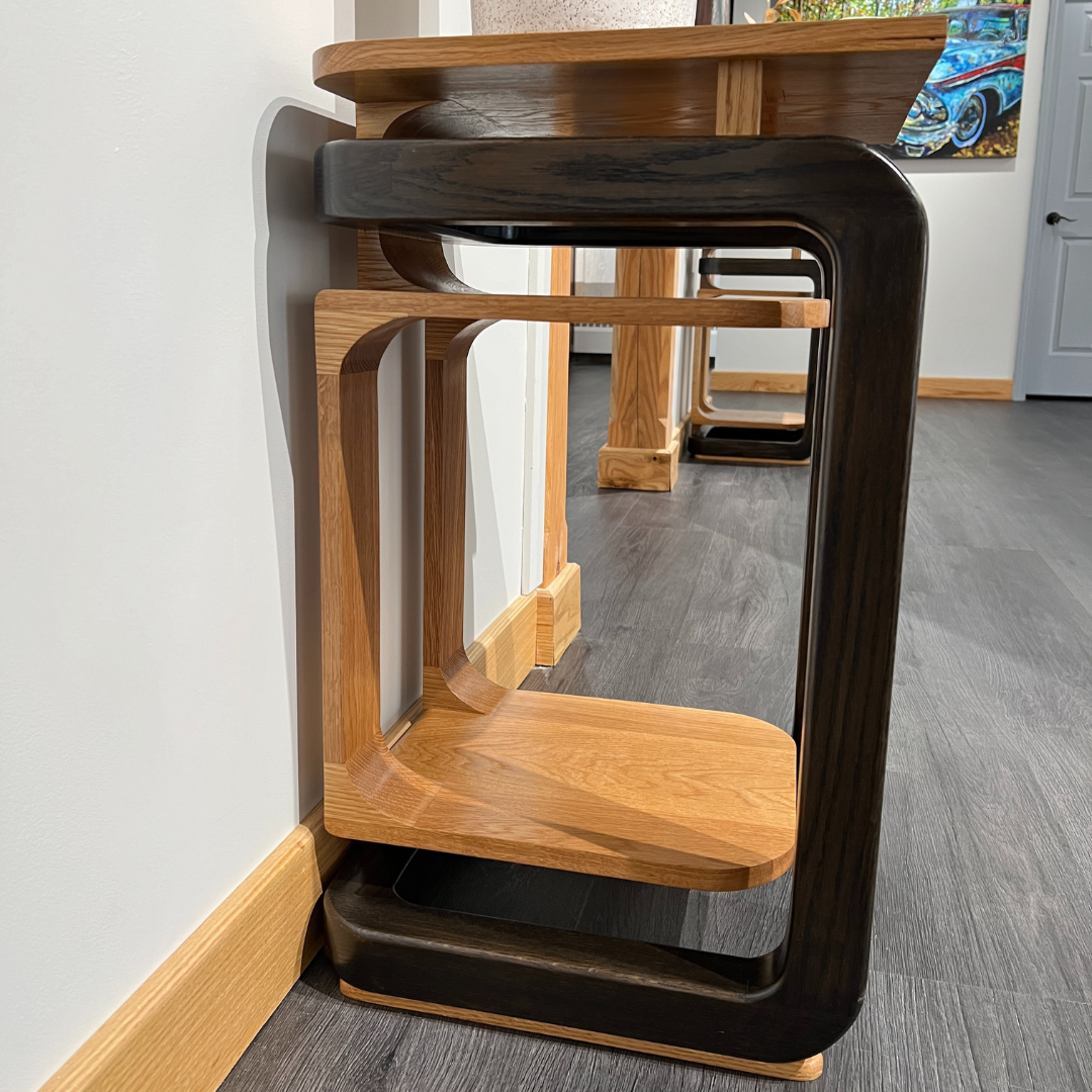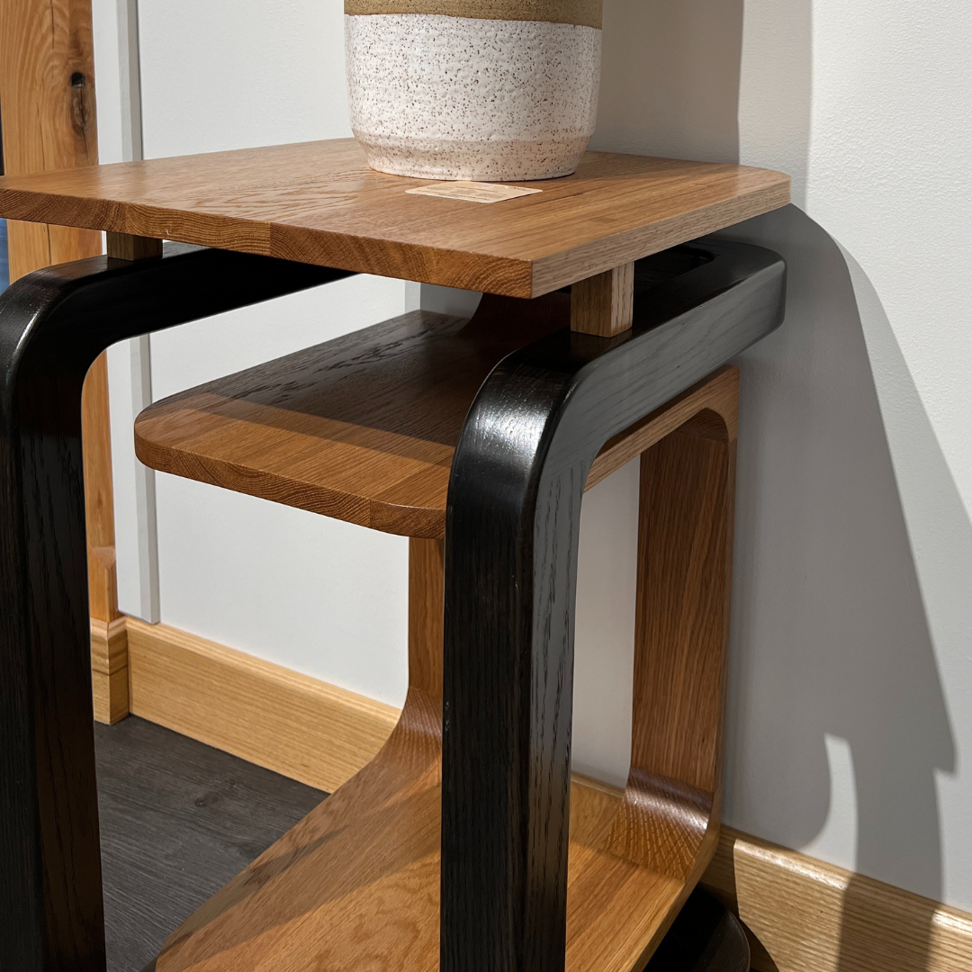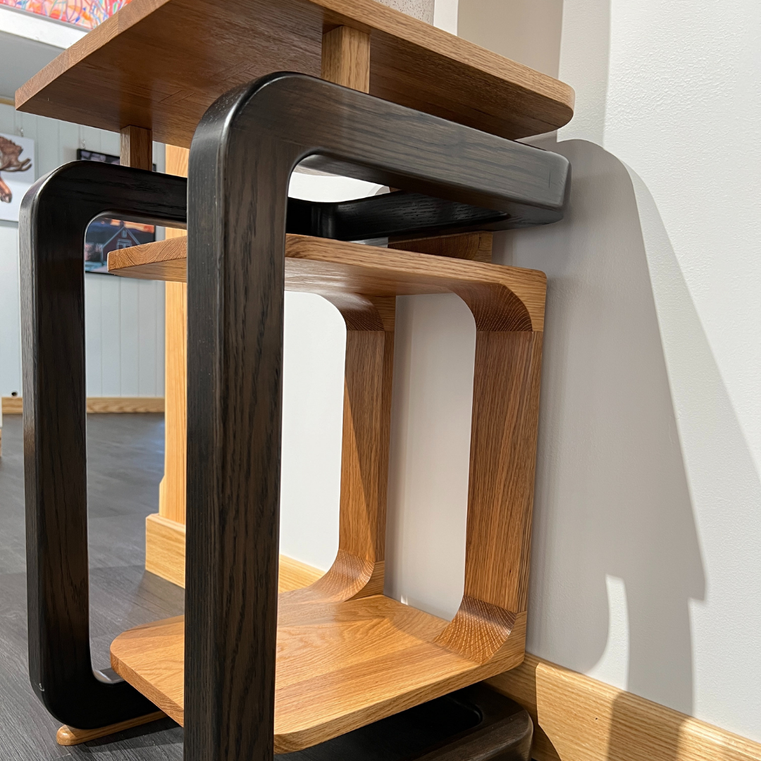 These elegant white oak end tables are designed as functional sculptures, blending simplicity and complexity in a striking interplay of continuous lines, floating shelves, and imaginative geometry.