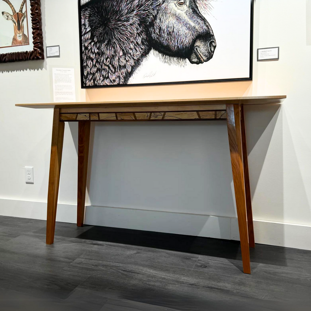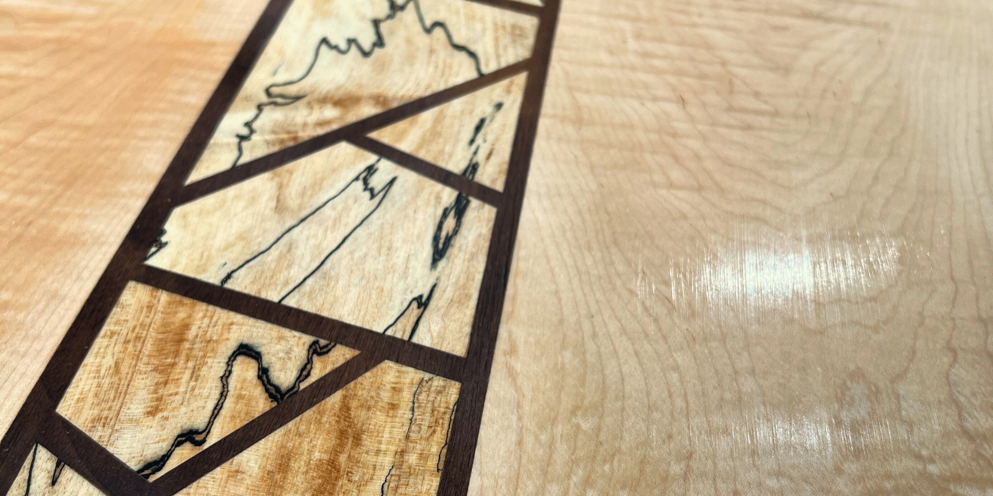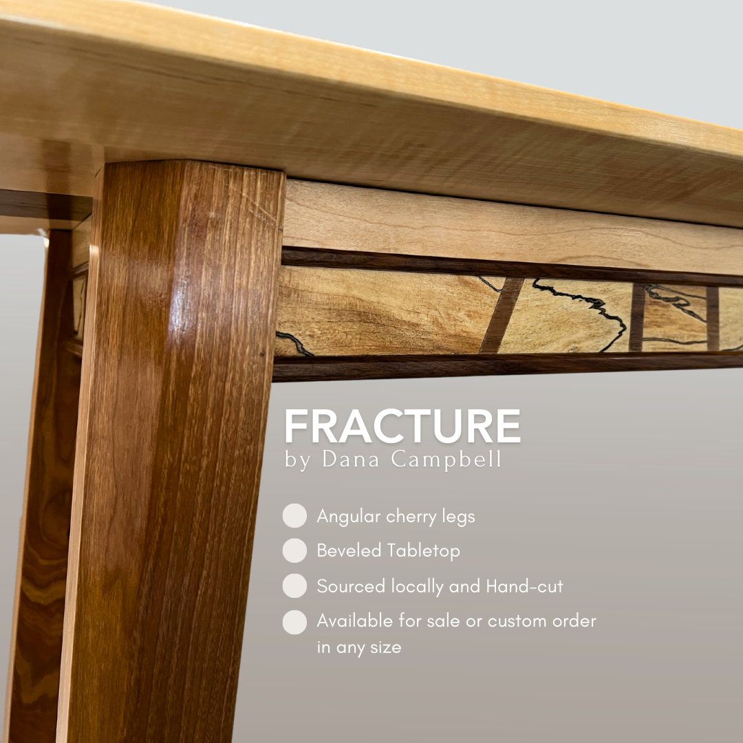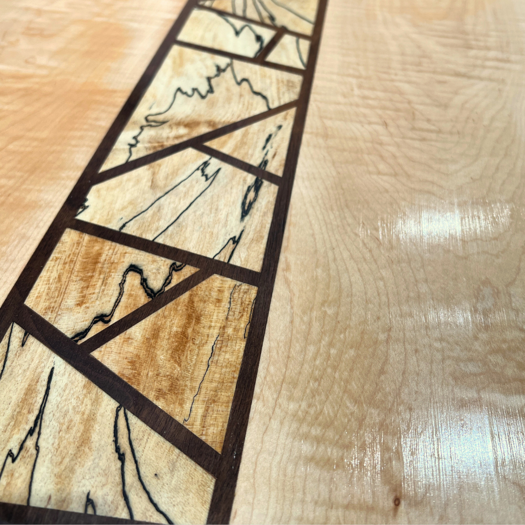 This table is crafted from locally sourced curly maple with walnut accents, cherry legs, and spalted maple inlays. The result is a piece of furniture that is sure to spark conversation. The table is sleek and angular, drawing attention to the 'fractured' center accent stripe, which is beautifully contrasted against the curly maple.