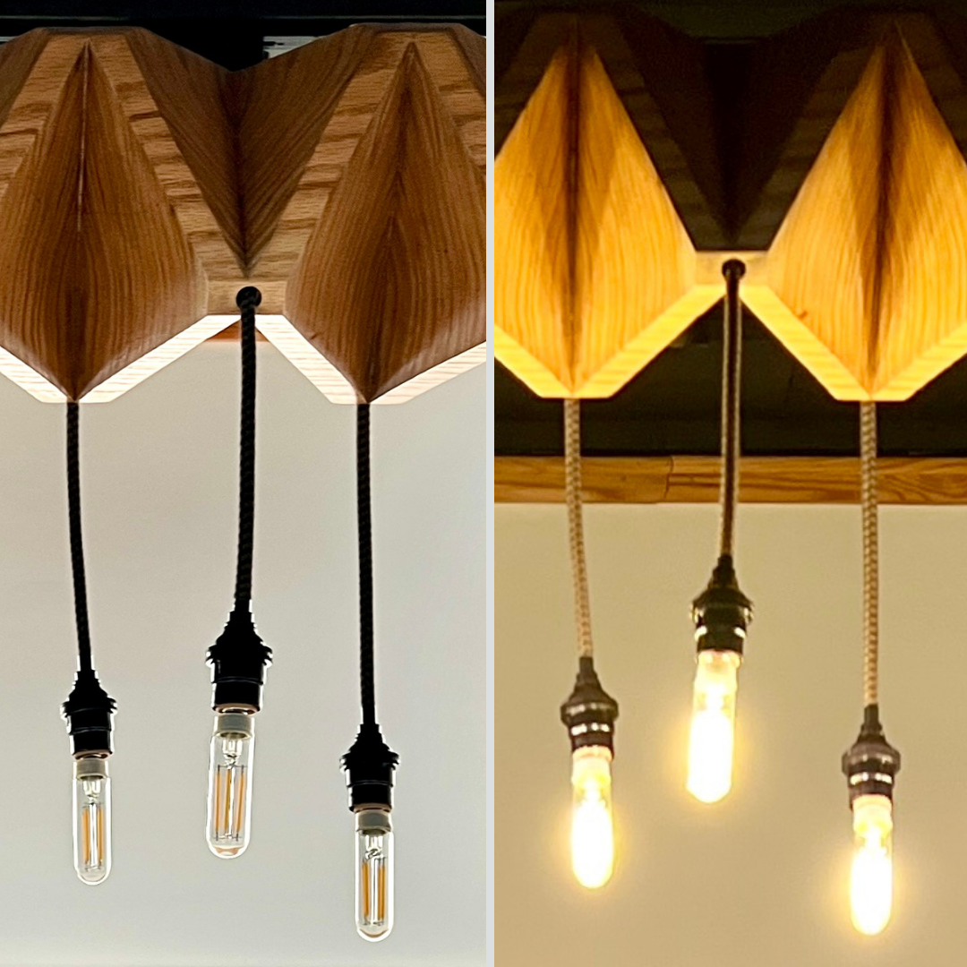 Fitted with dimmable LED lights, this fixture can be configured for hardwiring or a plug, and its dimensions can be customized to suit your space—just as long as we account for the mounting weight.