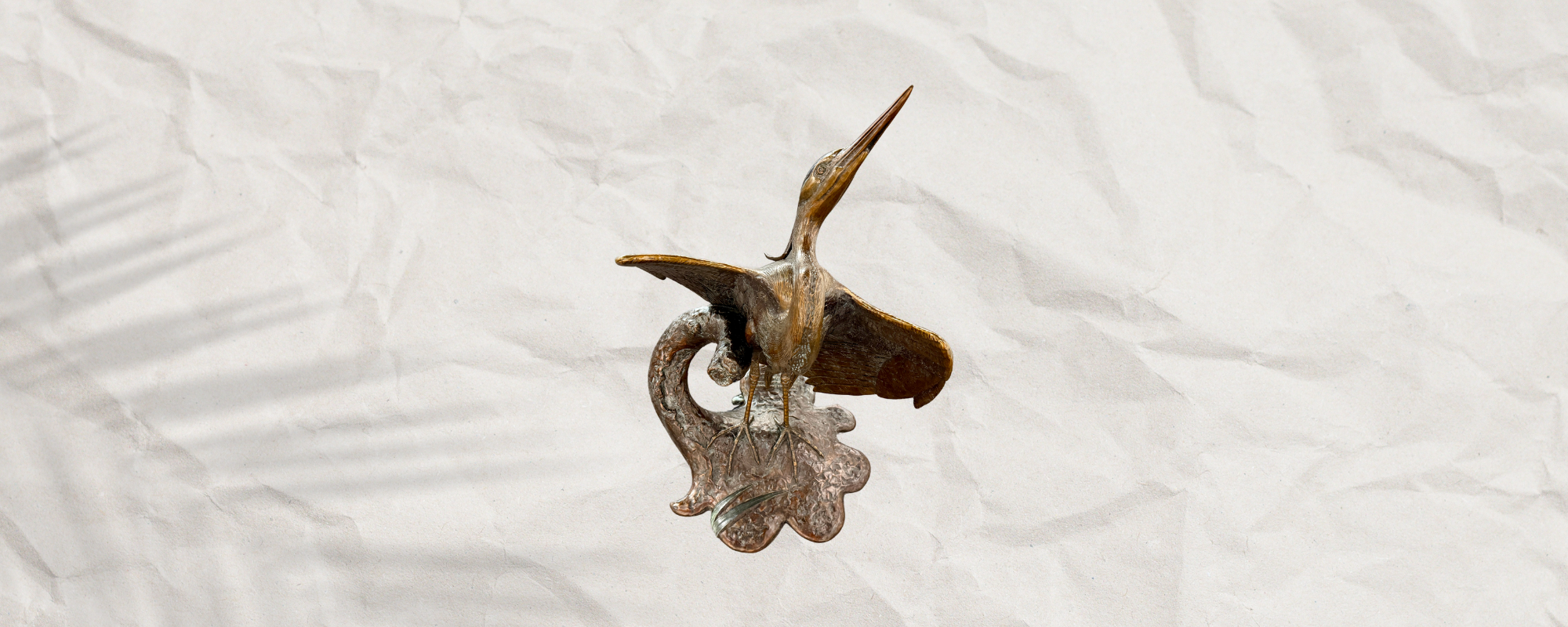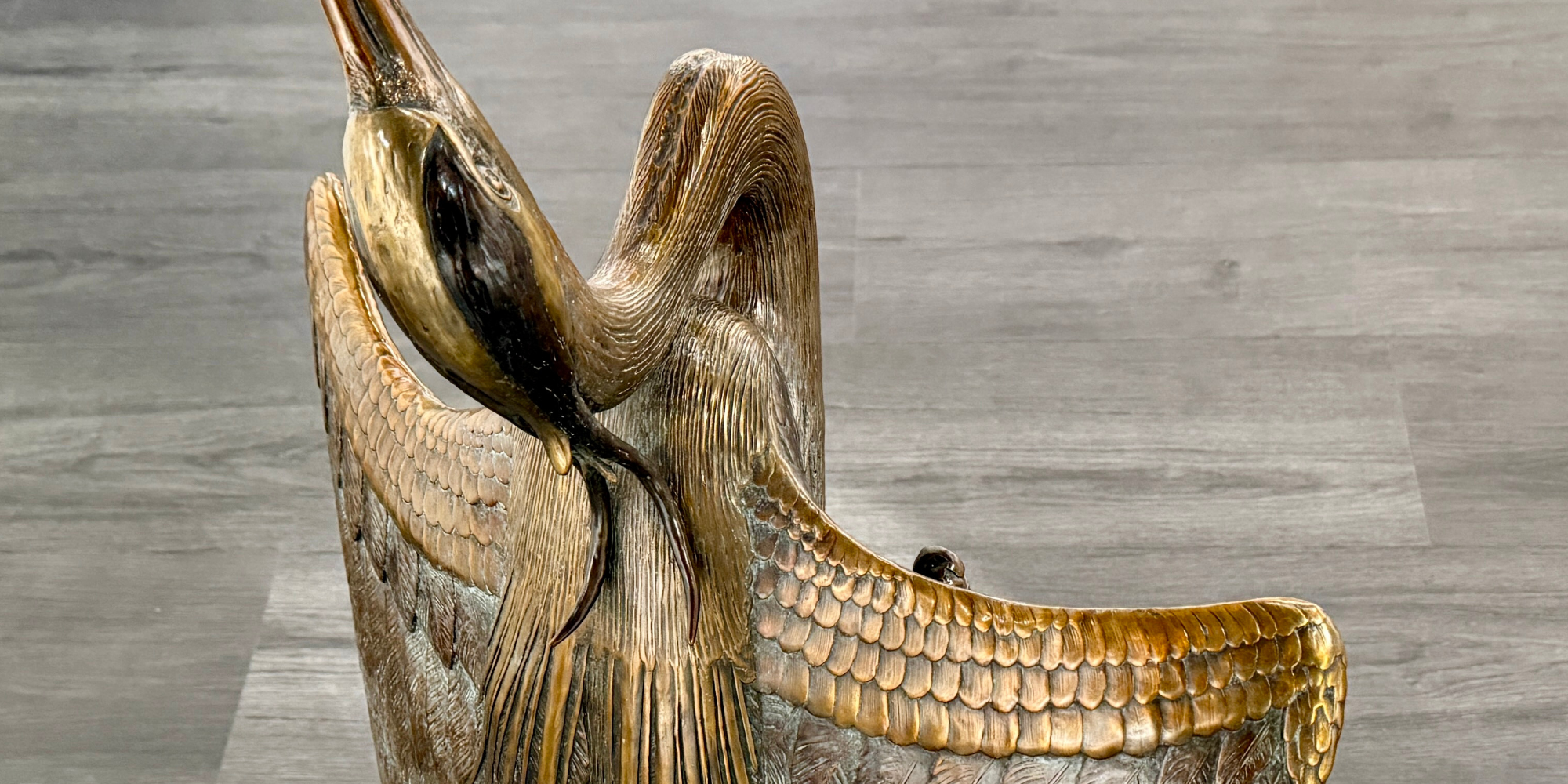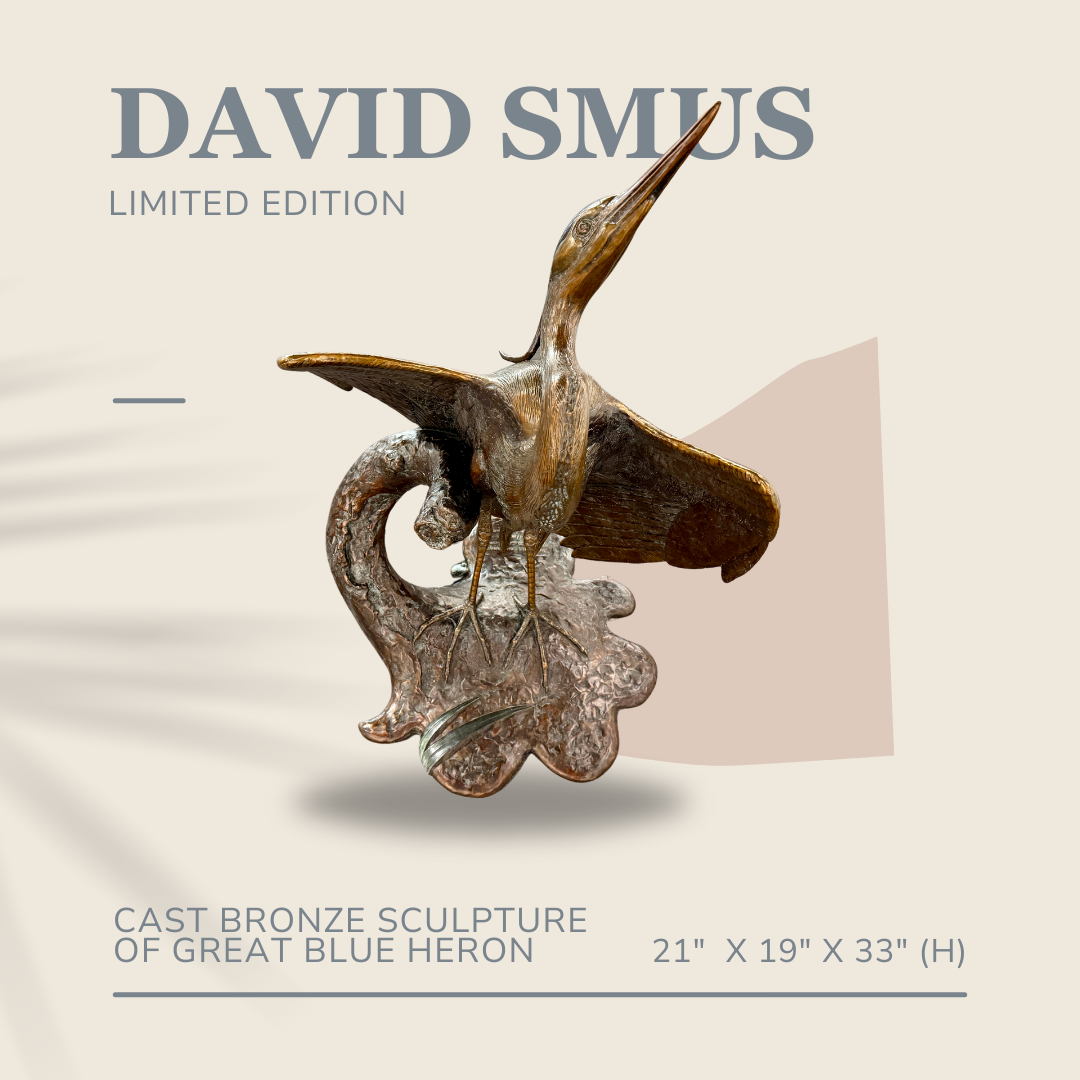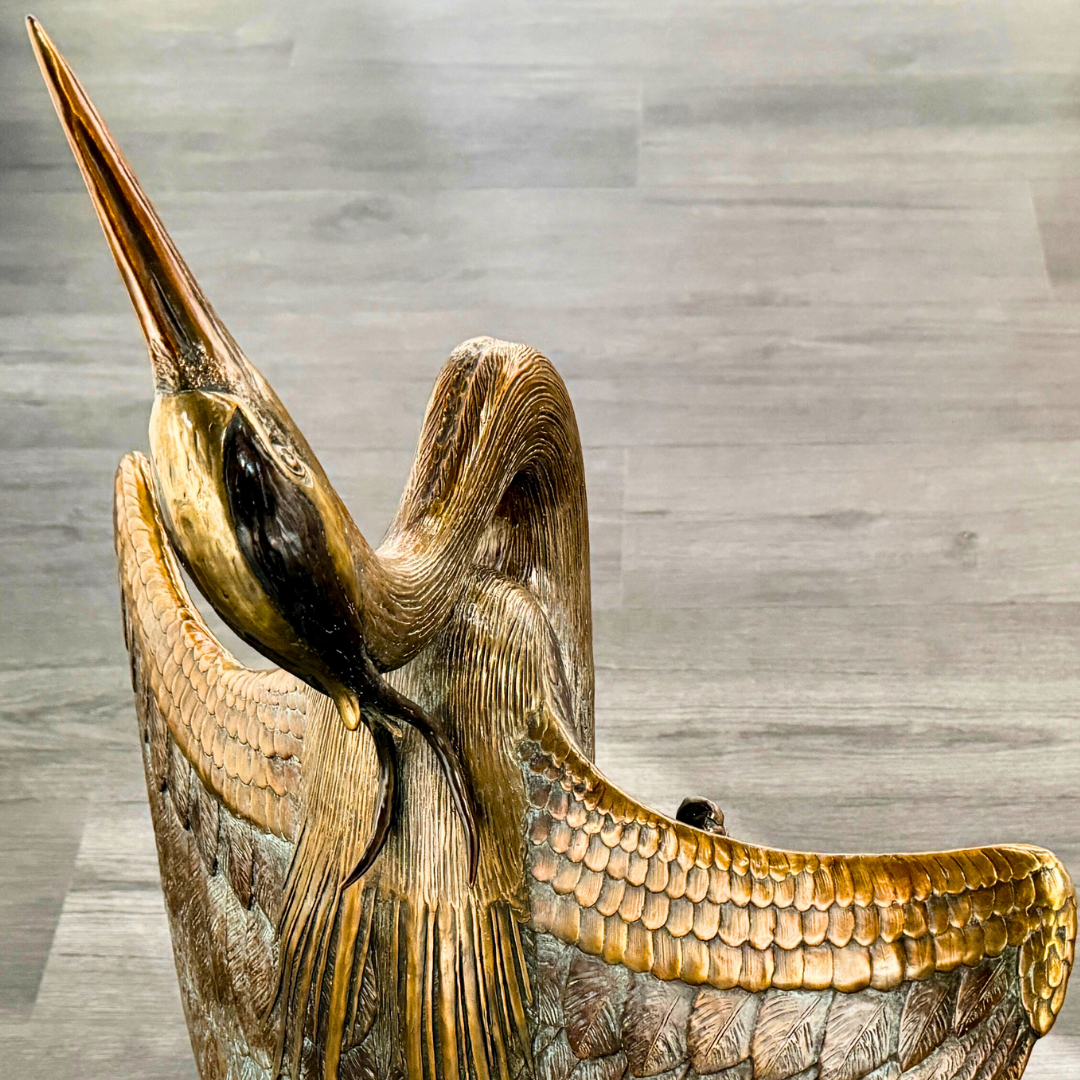 This Cast Bronze floor sculpture of Great Blue Heron stands 3 feet tall. It features a Heron about to take flight, and if you look close, you might just see a tiny frog watching!