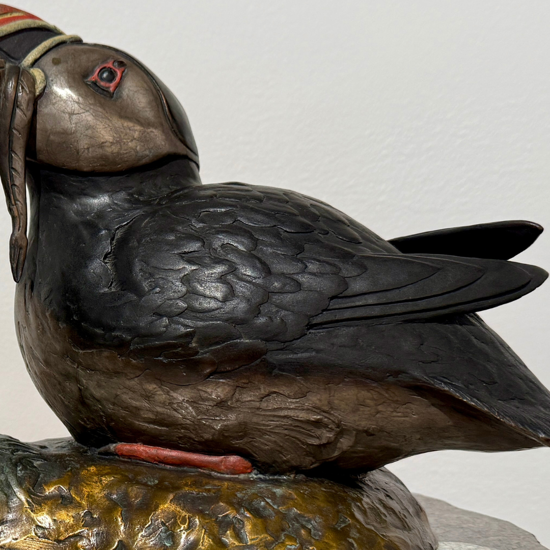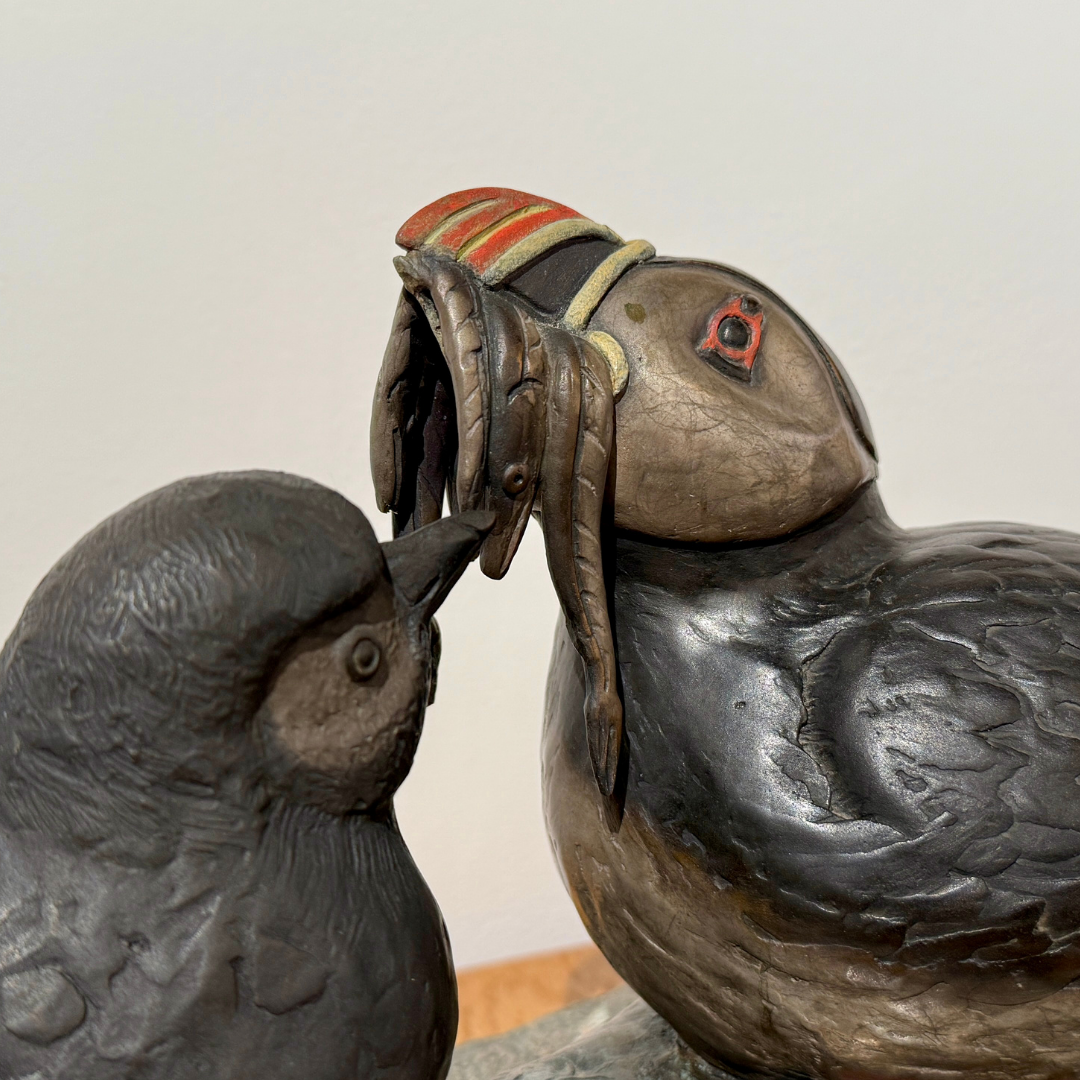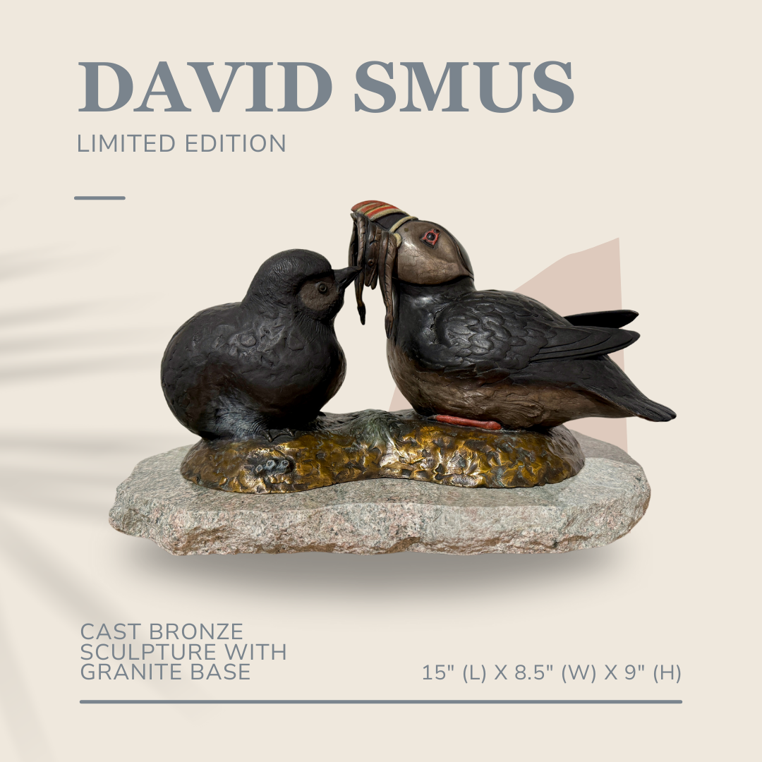 "Puffin Stuffin" is a limited edition cast bronze sculpture by David Smus, featuring a puffin chick being fed by its parent. This detailed piece, set on a granite base, measures 15" (L) x 8.5" (W) x 9" (H) and is part of a numbered edition of 30.
