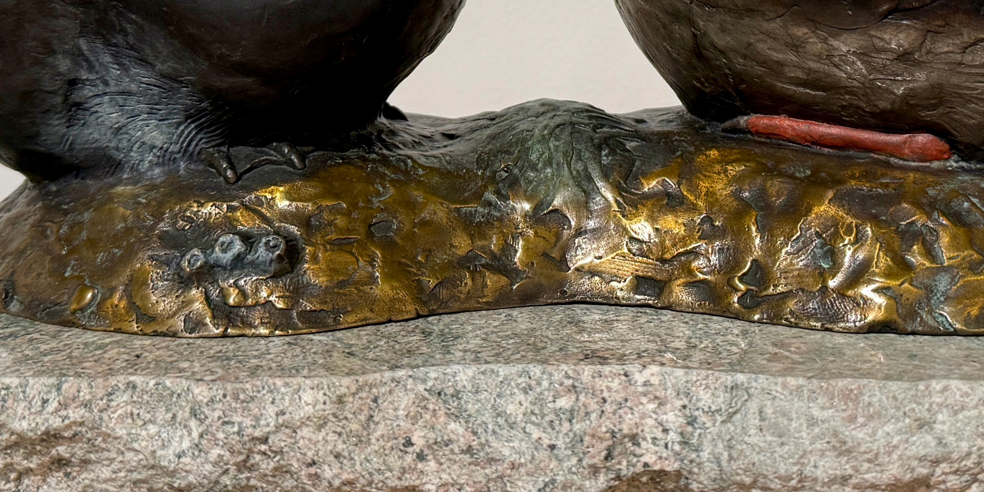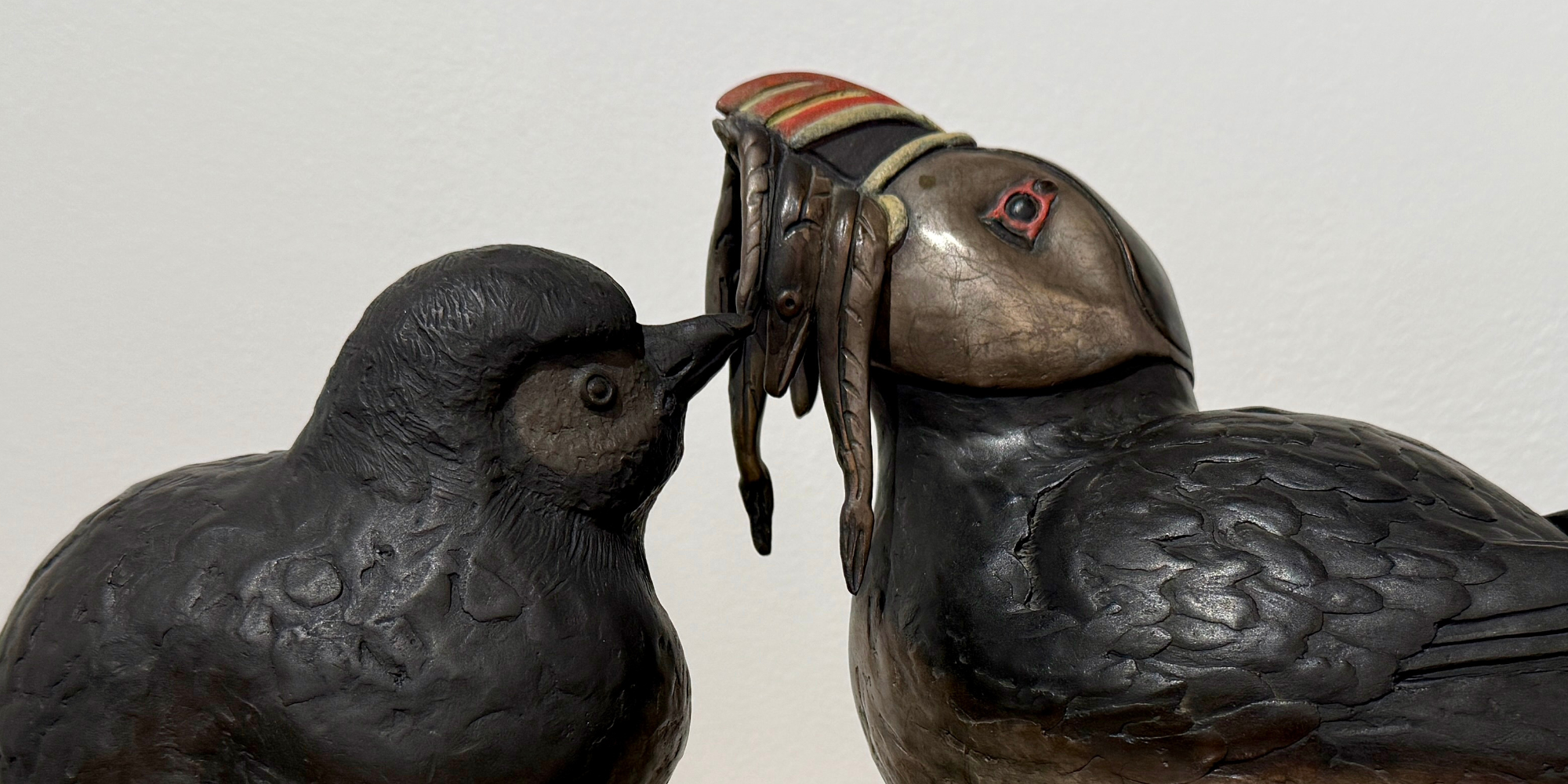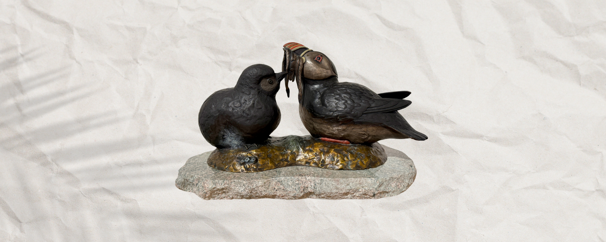 "Puffin Stuffin" is a limited edition cast bronze sculpture by David Smus, featuring a puffin chick being fed by its parent. This detailed piece, set on a granite base, measures 15" (L) x 8.5" (W) x 9" (H) and is part of a numbered edition of 30.