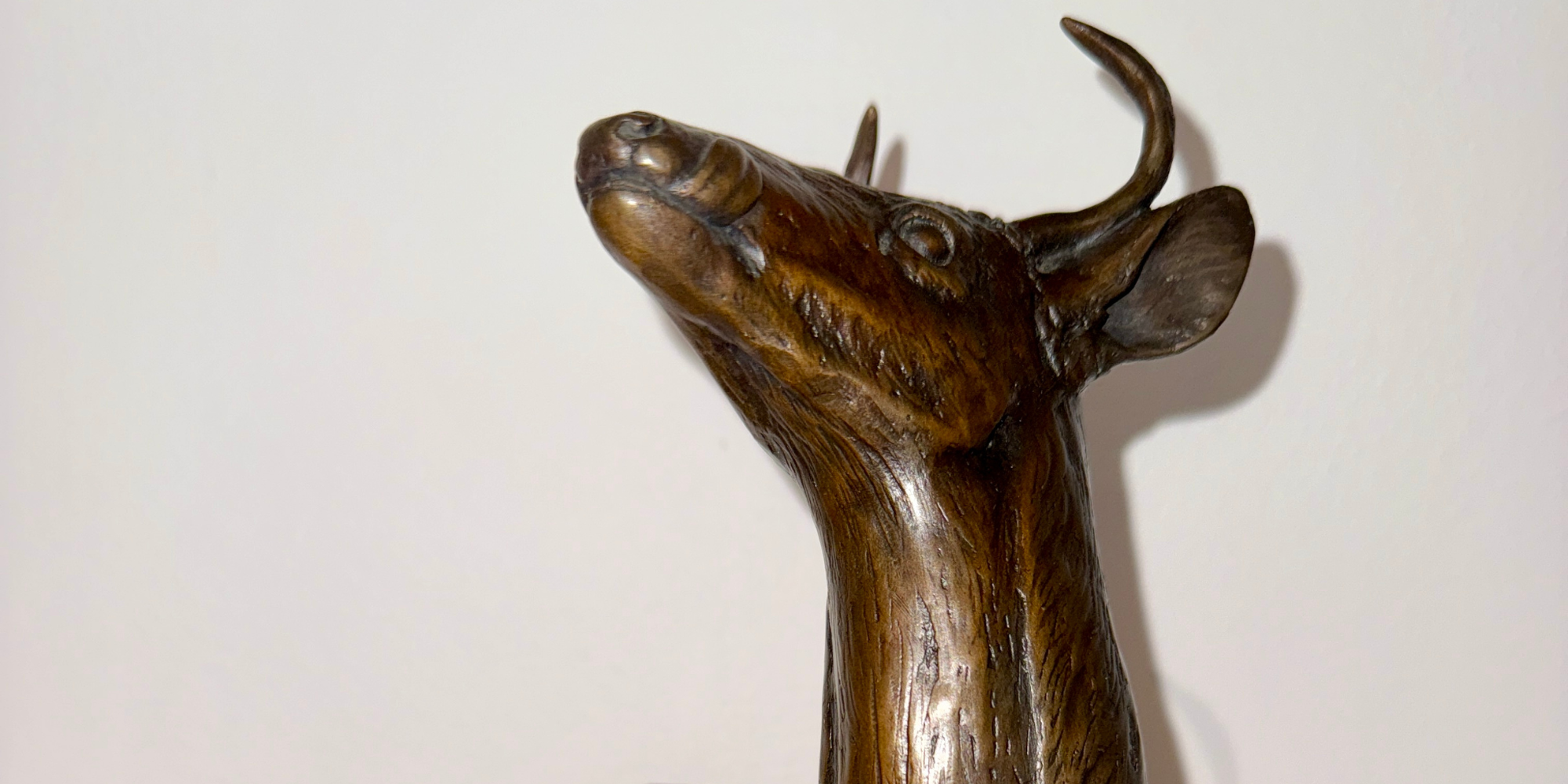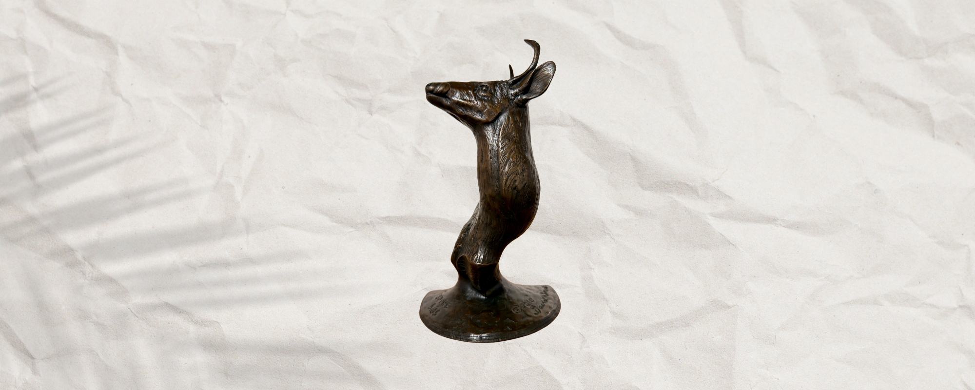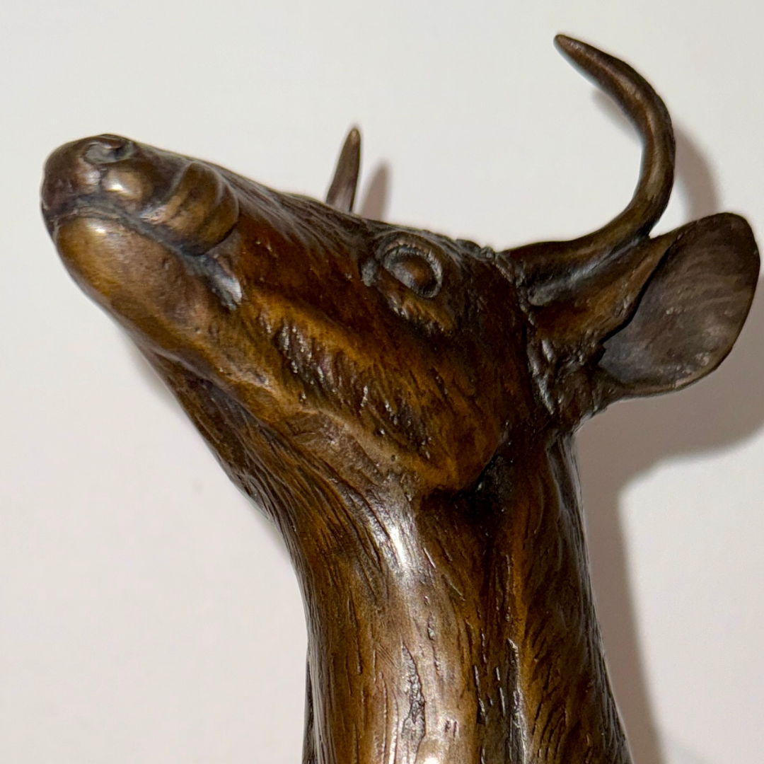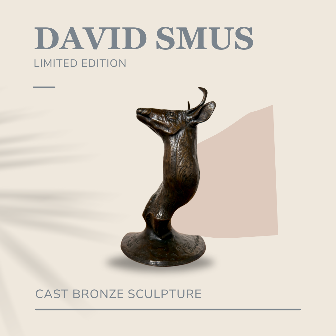 "Spike" is a limited edition cast bronze sculpture by David Smus. This tabletop piece captures the essence of a white-tailed deer with intricate detail and craftsmanship. Edition #5/35.