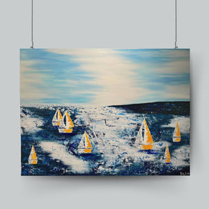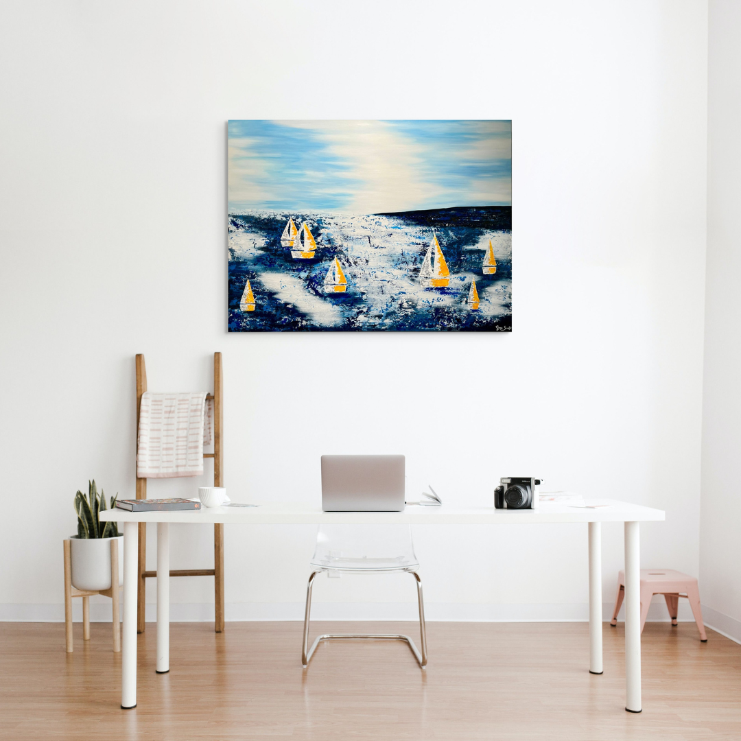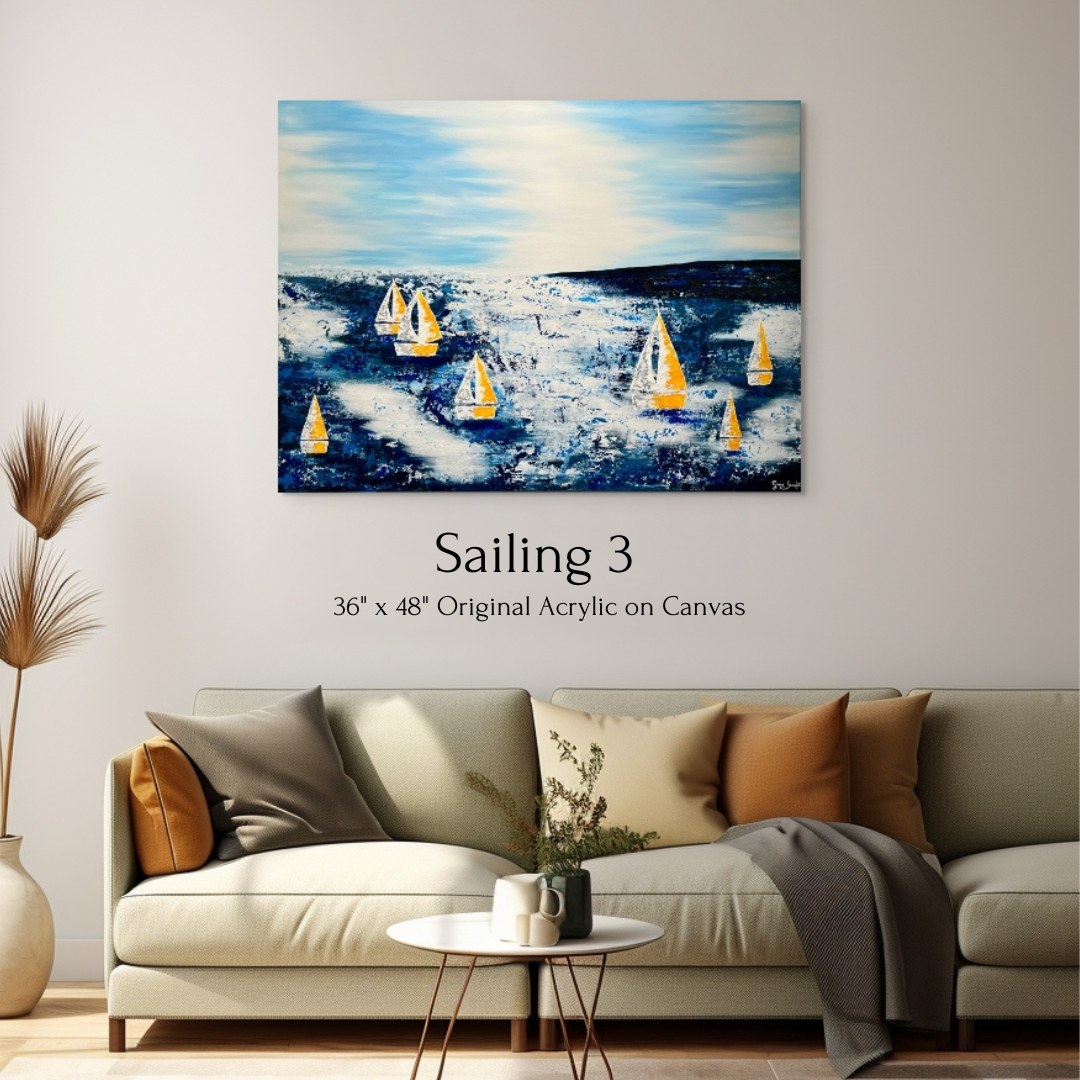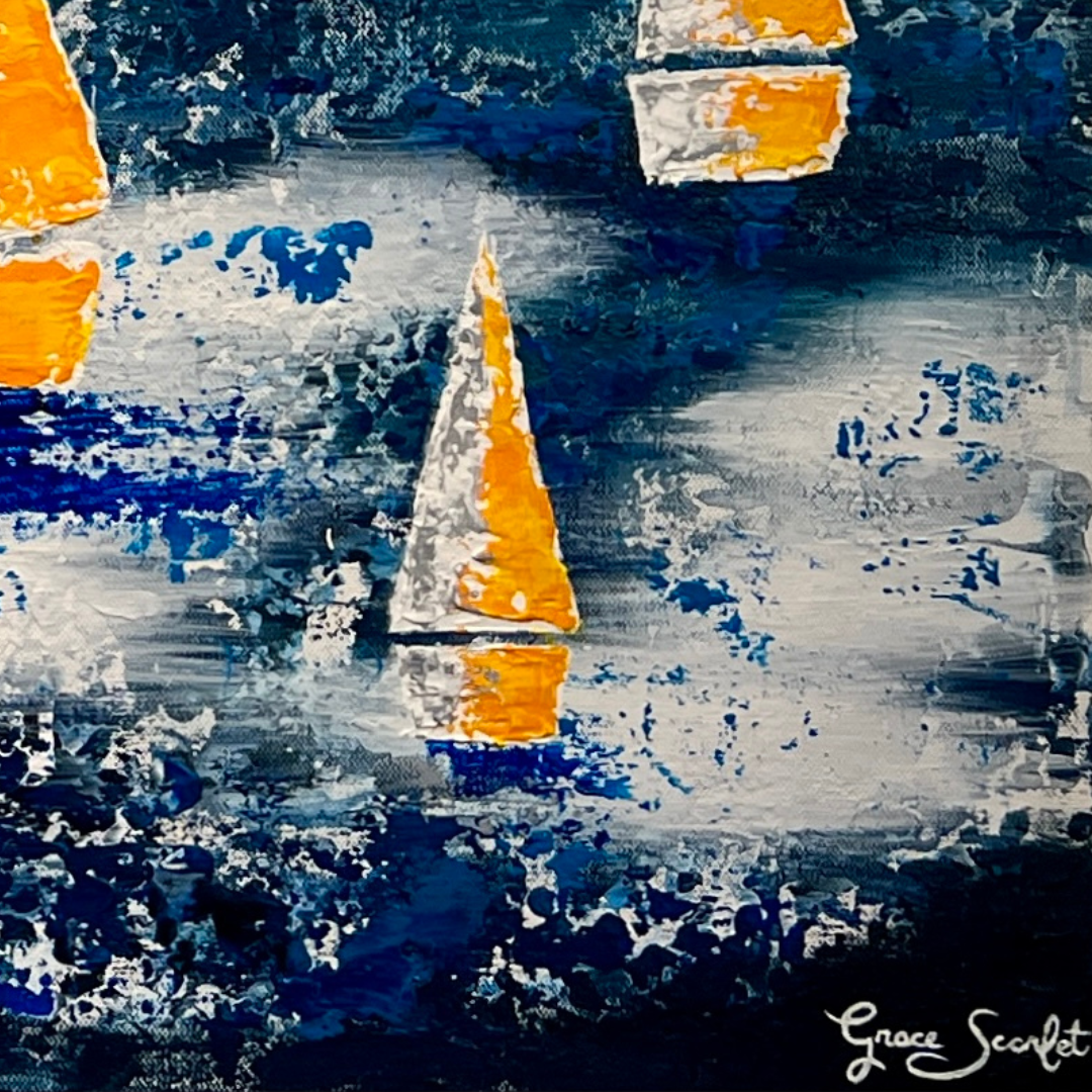 This vibrant 36" x 48" original acrylic on canvas by Grace Scarlet features colorful sailboats, capturing the essence of movement and energy on the water. Perfect for those looking to add a dynamic and contemporary piece to their collection.