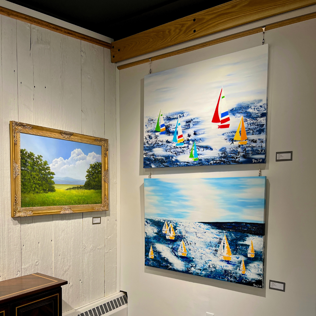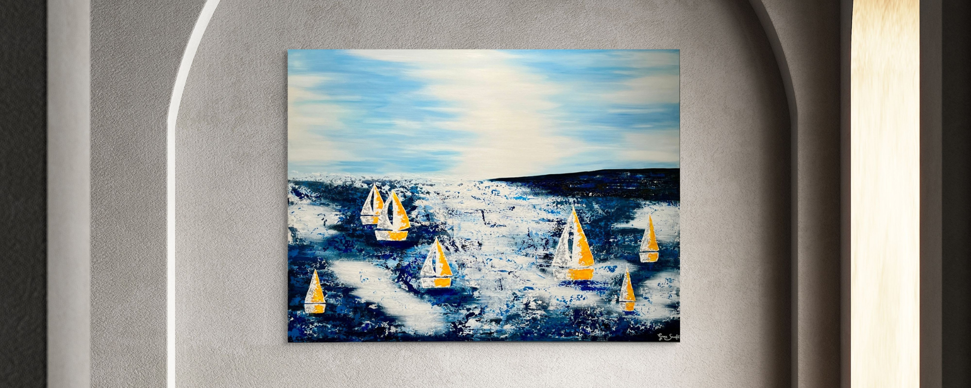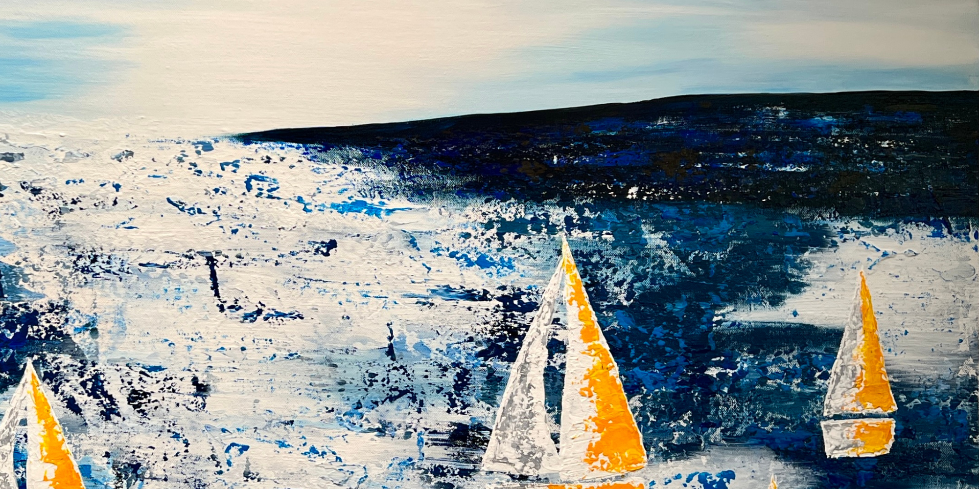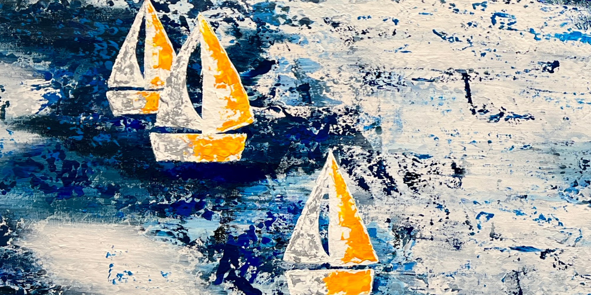 This vibrant 36" x 48" original acrylic on canvas by Grace Scarlet features colorful sailboats, capturing the essence of movement and energy on the water. Perfect for those looking to add a dynamic and contemporary piece to their collection.