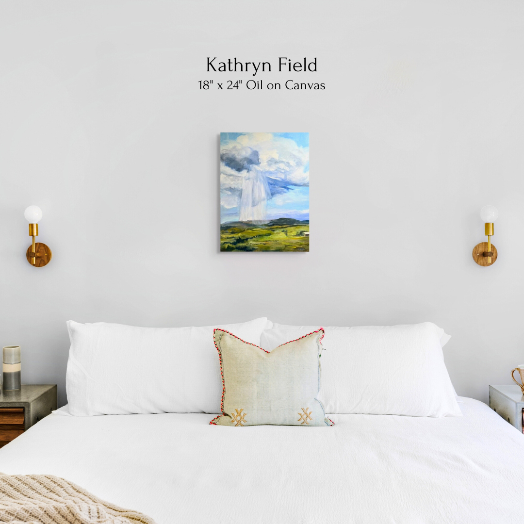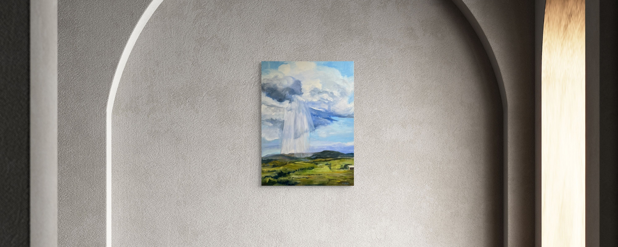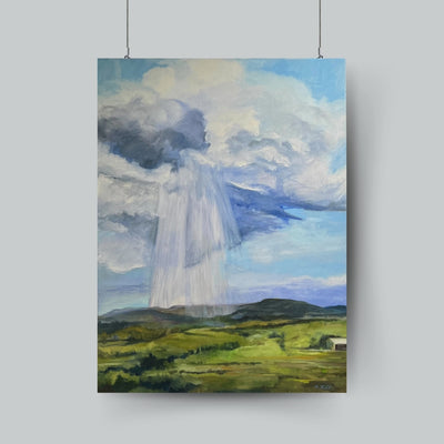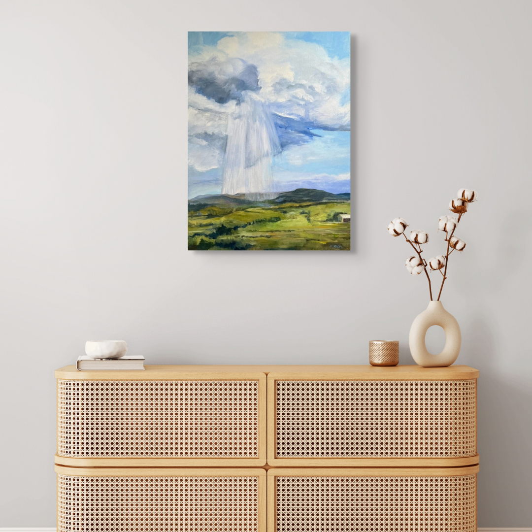 This beautifully rendered landscape captures a summer rainstorm breaking over the horizon, invoking moods of peace and relaxation.