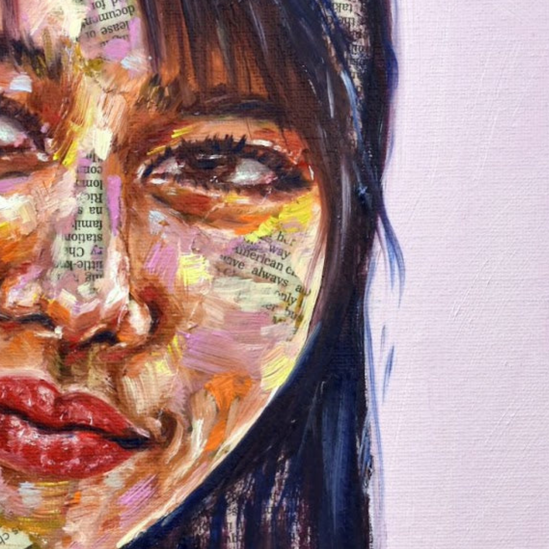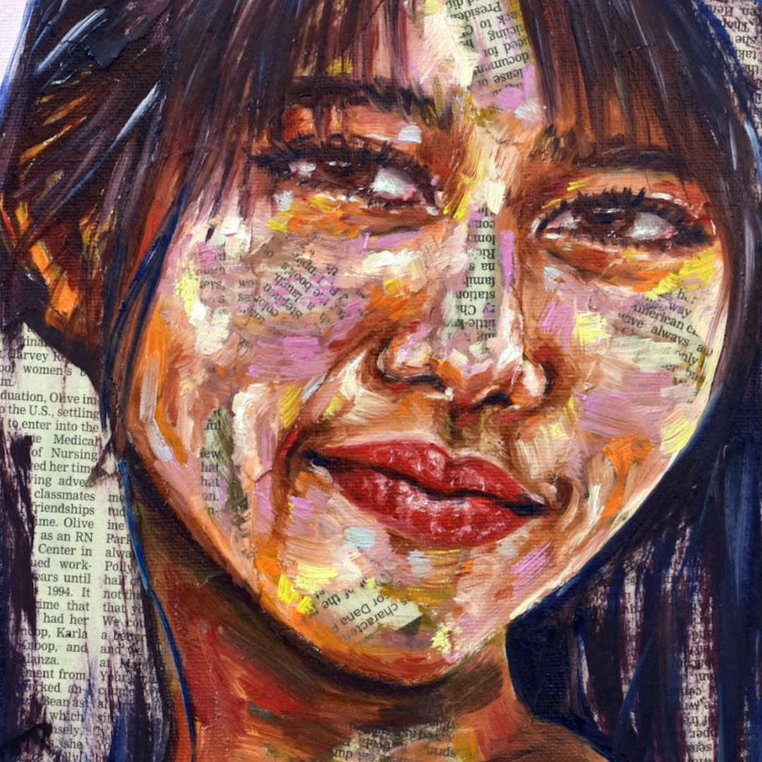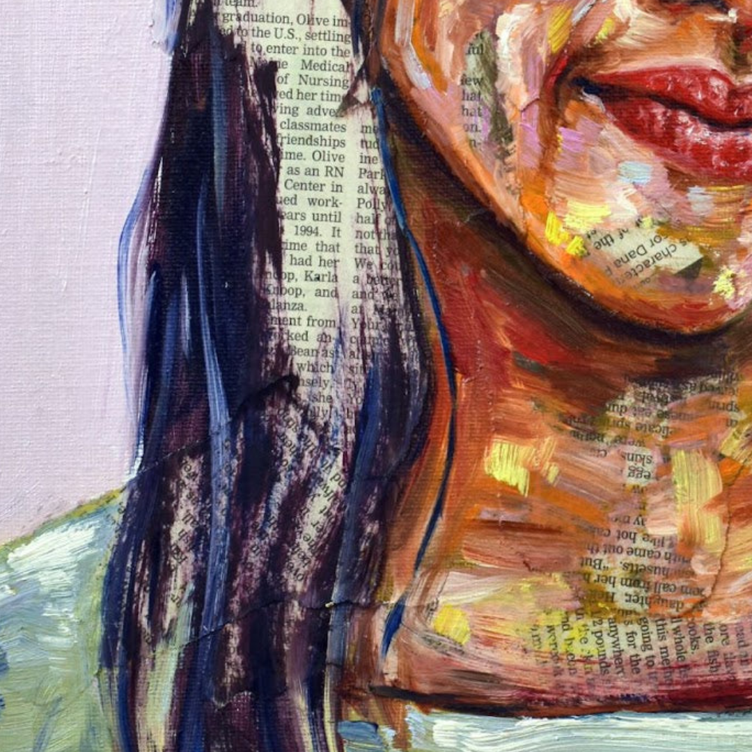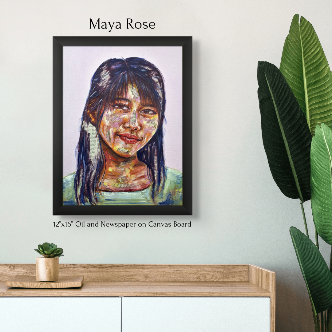 Maya's collection of mixed-media portraits is haunting and beautiful. Look closely, and you'll realize these beautiful faces are painted onto newsprint. Look even closer, and you'll see some of these articles are obituaries.