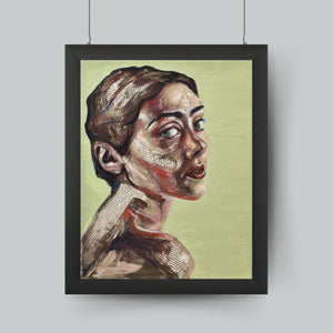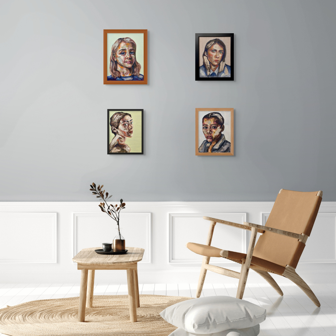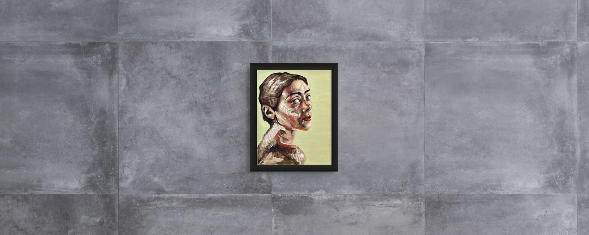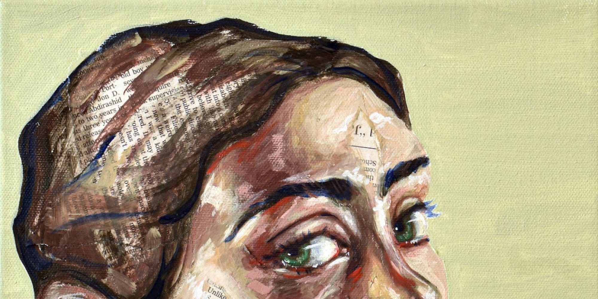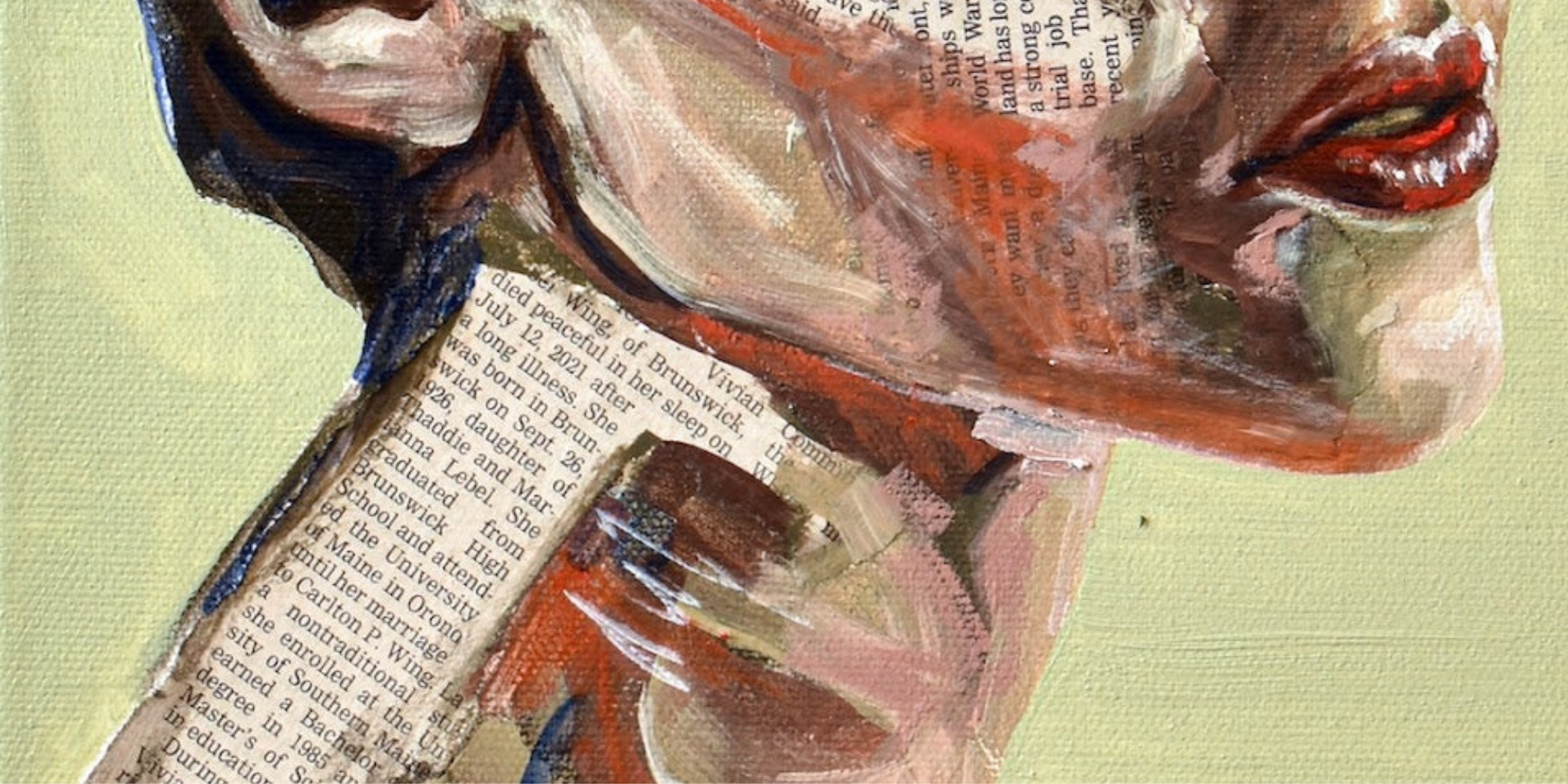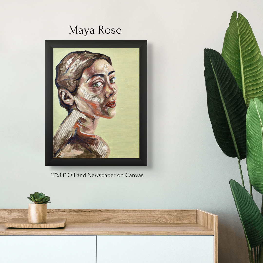 Maya's collection of mixed-media portraits is haunting and beautiful. Look closely, and you'll realize these beautiful faces are painted onto newsprint. Look even closer, and you'll see some of these articles are obituaries.