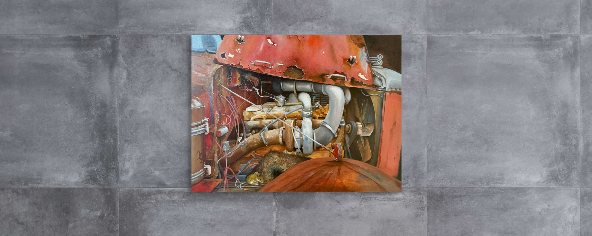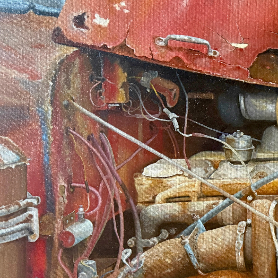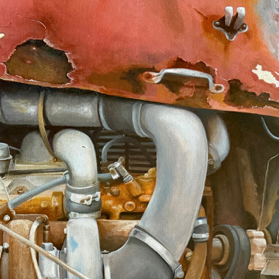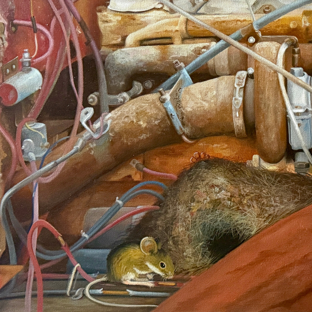 This piece captures a whimsical and unexpected scene of a mouse nesting in a tractor engine block, a common sight on New England farms. The artwork blends rural charm with a touch of humor, making it a perfect addition for collectors who appreciate storytelling in art.