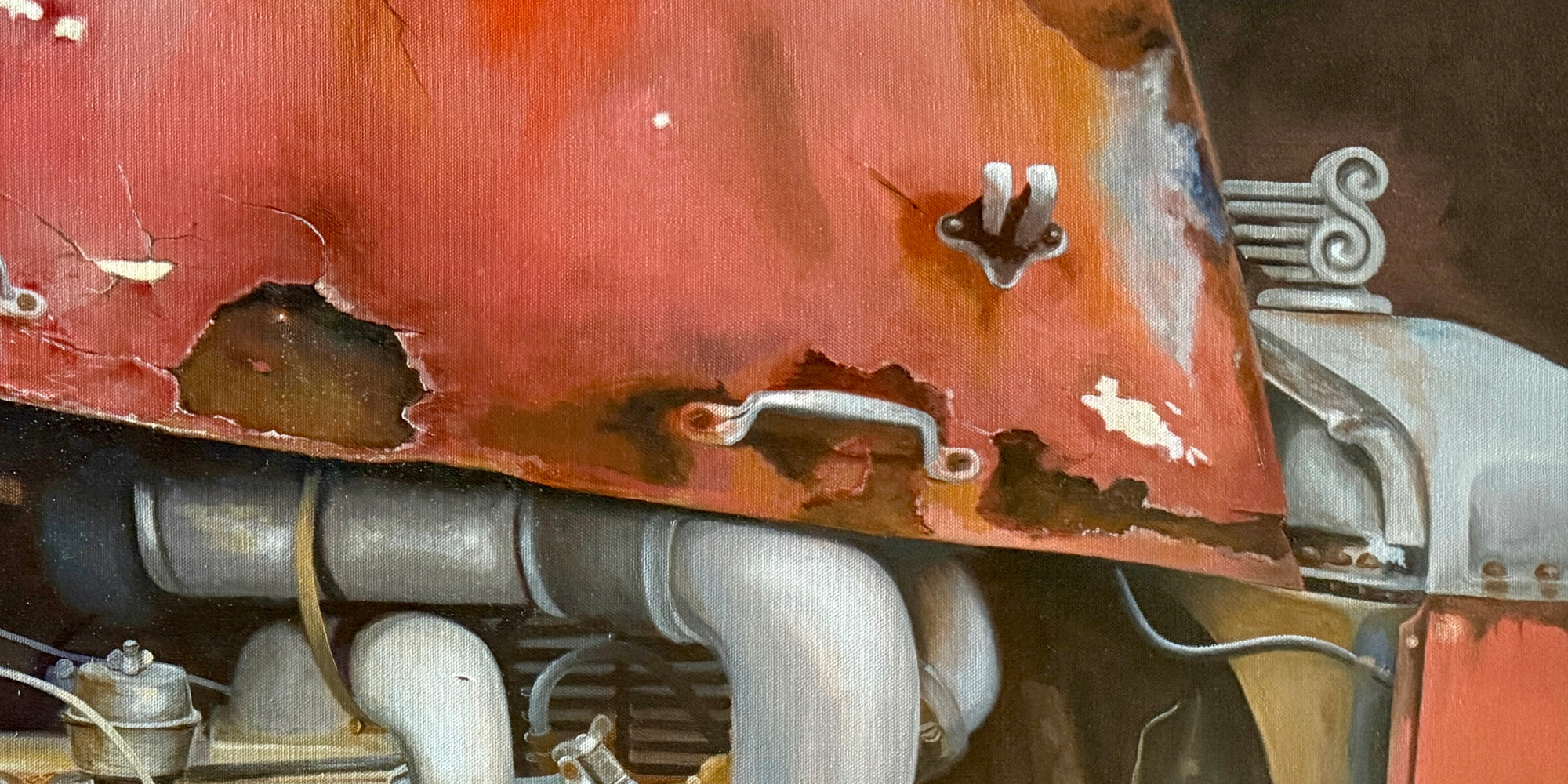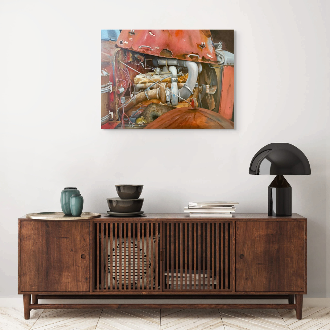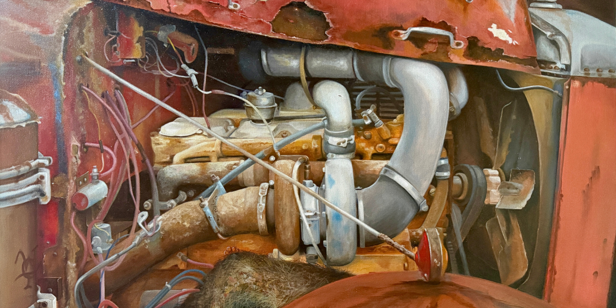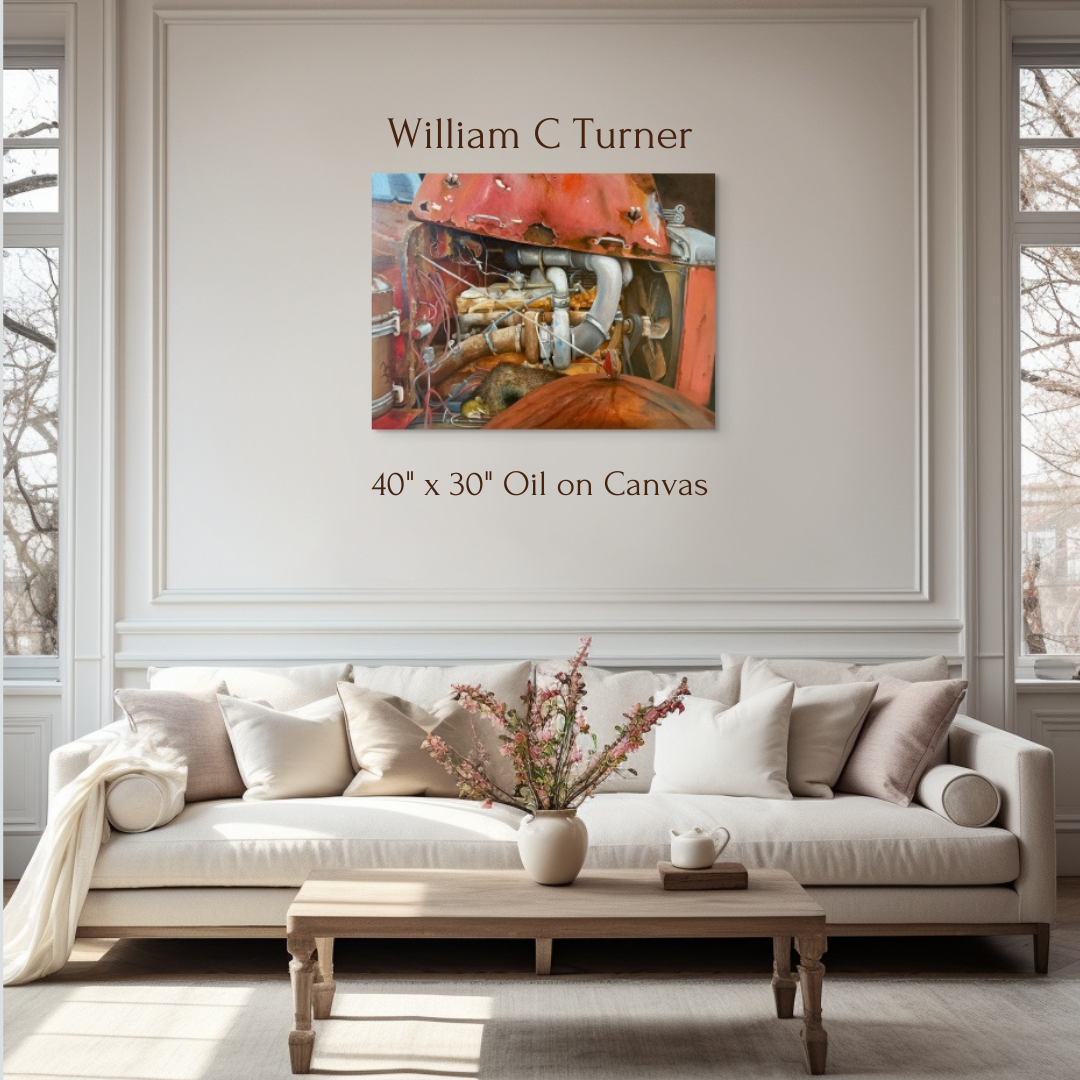 This piece captures a whimsical and unexpected scene of a mouse nesting in a tractor engine block, a common sight on New England farms. The artwork blends rural charm with a touch of humor, making it a perfect addition for collectors who appreciate storytelling in art.
