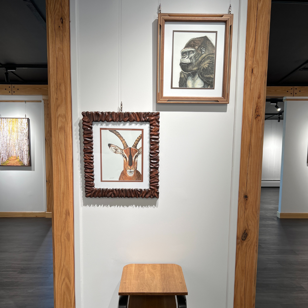 This original is custom-matted and framed by the artist. The minimalist striated maple and walnut frame accompanying this portrait was designed as an extension of the art contained within.
