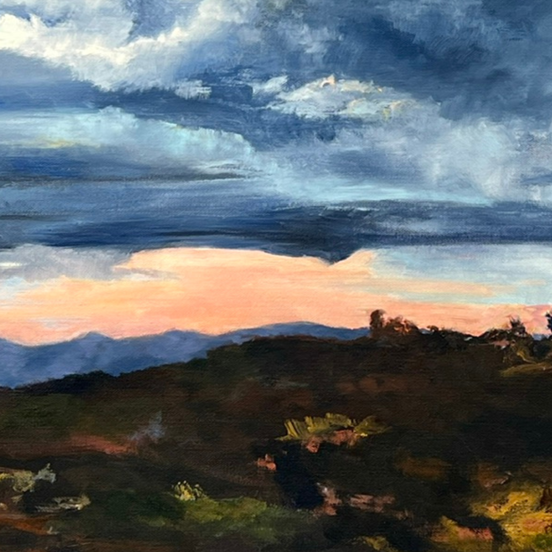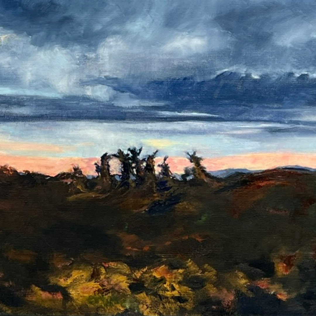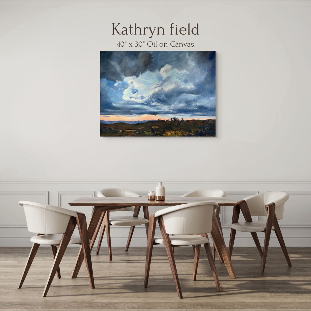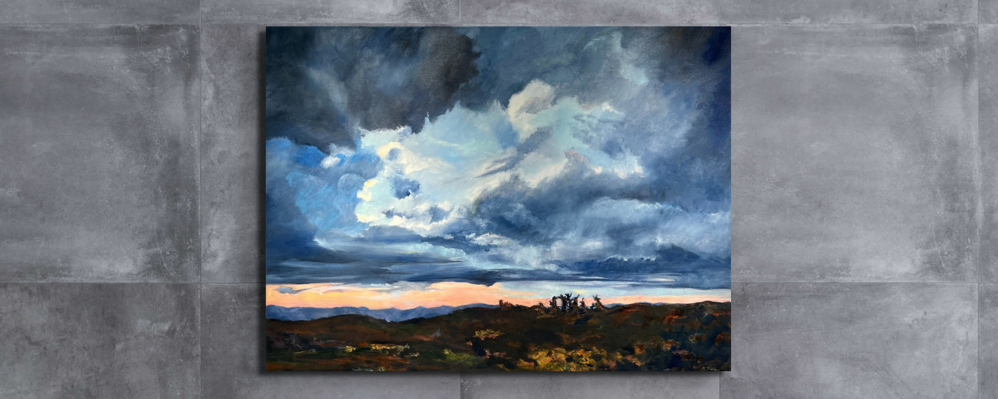 In this oil painting, the low, heavily shadowed horizon draws the viewers' attention to the vast and intense sky. It is a dramatic depiction of nature with a sense of scale that makes one feel small when immersed in this landscape.