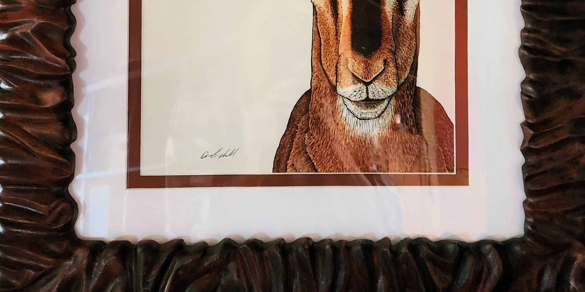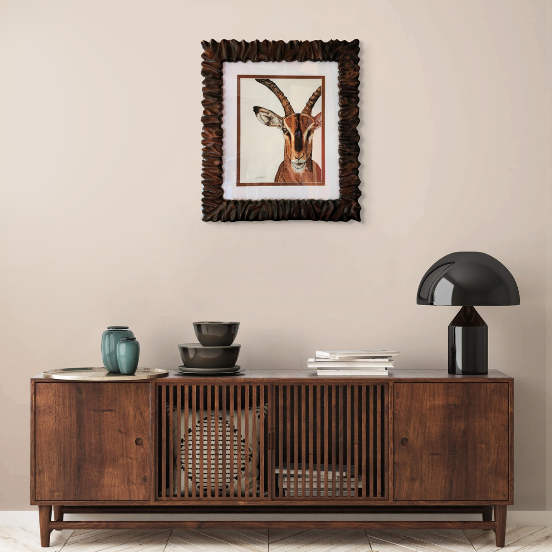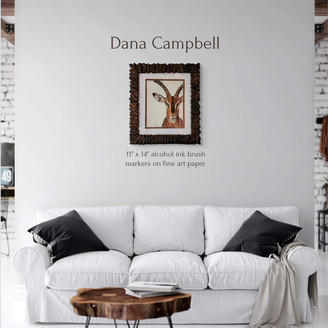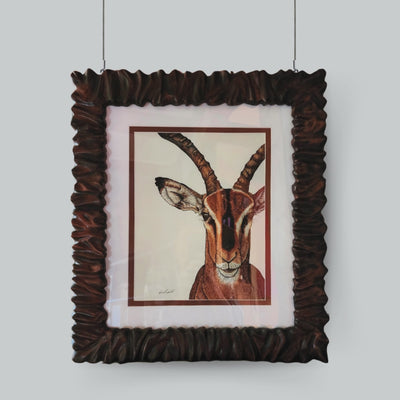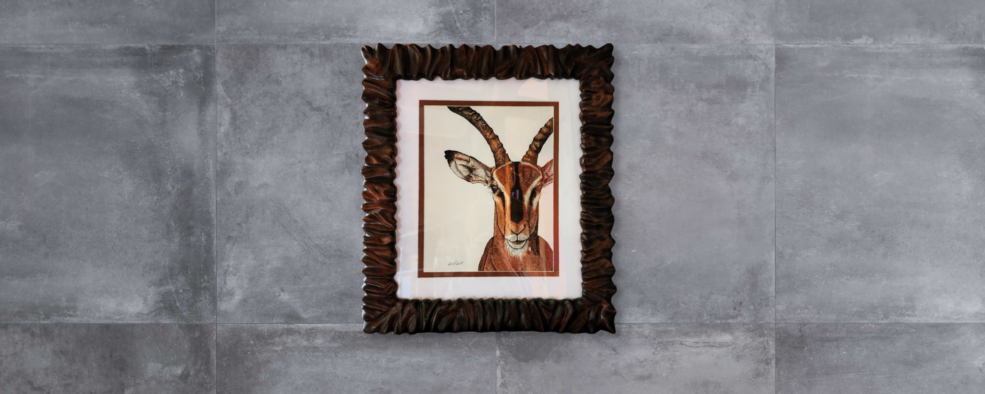 This Original is matted and framed by Dana. The frame is carved from hard maple and finished in a way that compliments the texture of the Impala's antlers. The custom frames on Dana's original works are intended as and artistic extension of the work inside it.
