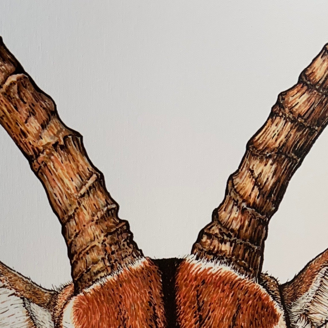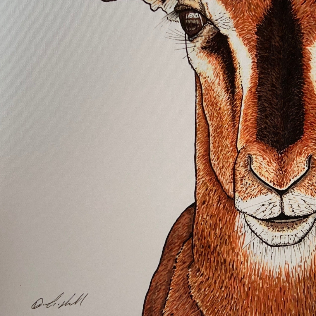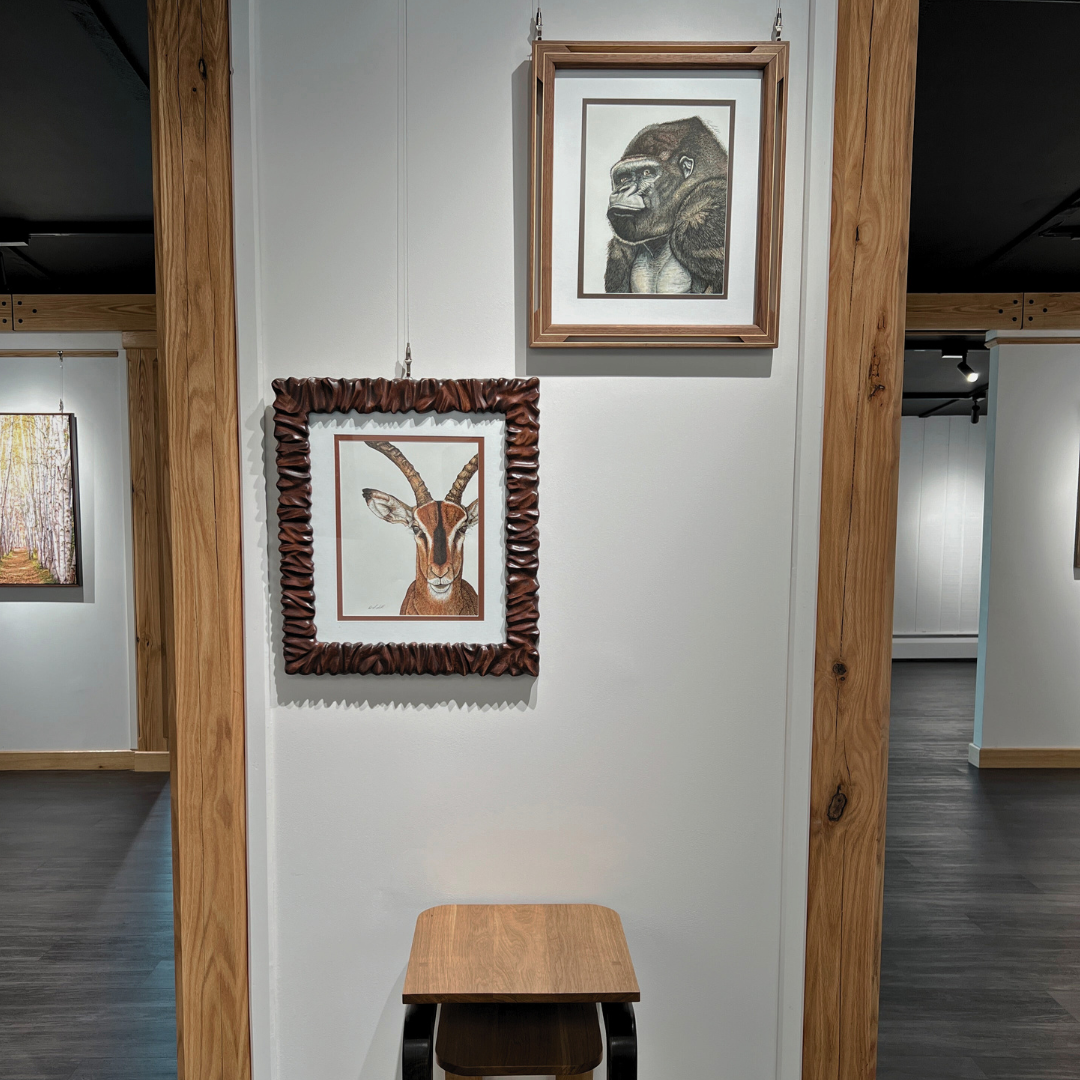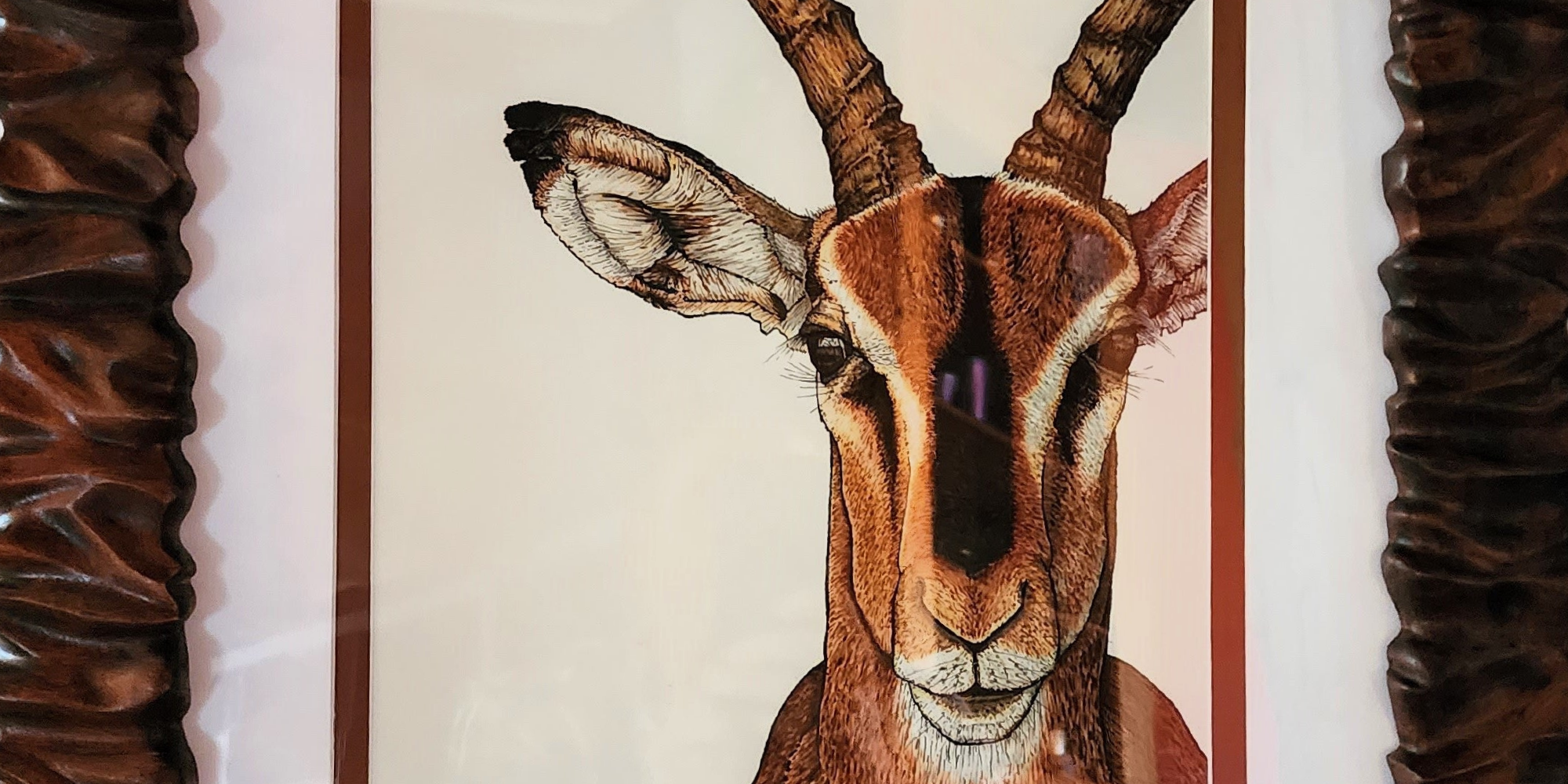 This Original is matted and framed by Dana. The frame is carved from hard maple and finished in a way that compliments the texture of the Impala's antlers. The custom frames on Dana's original works are intended as and artistic extension of the work inside it.