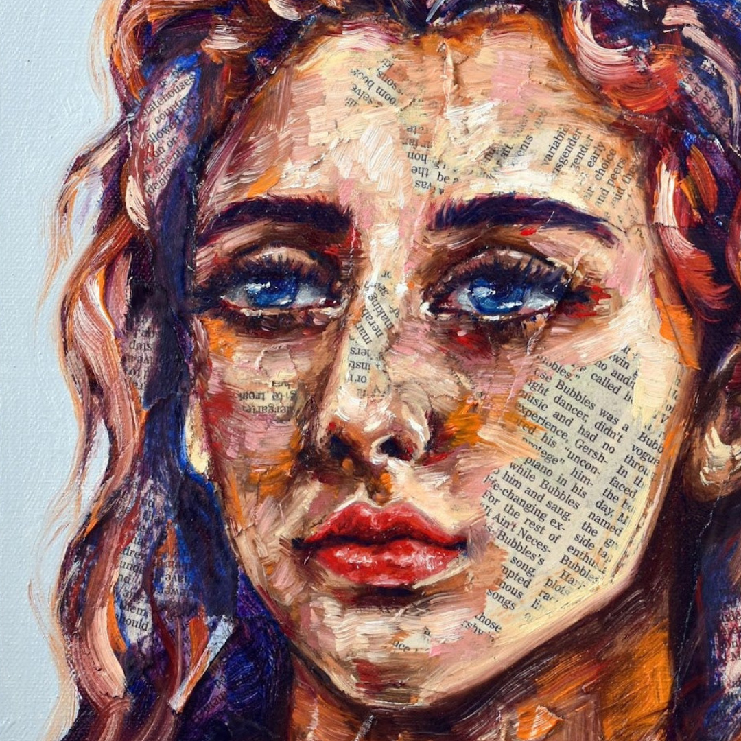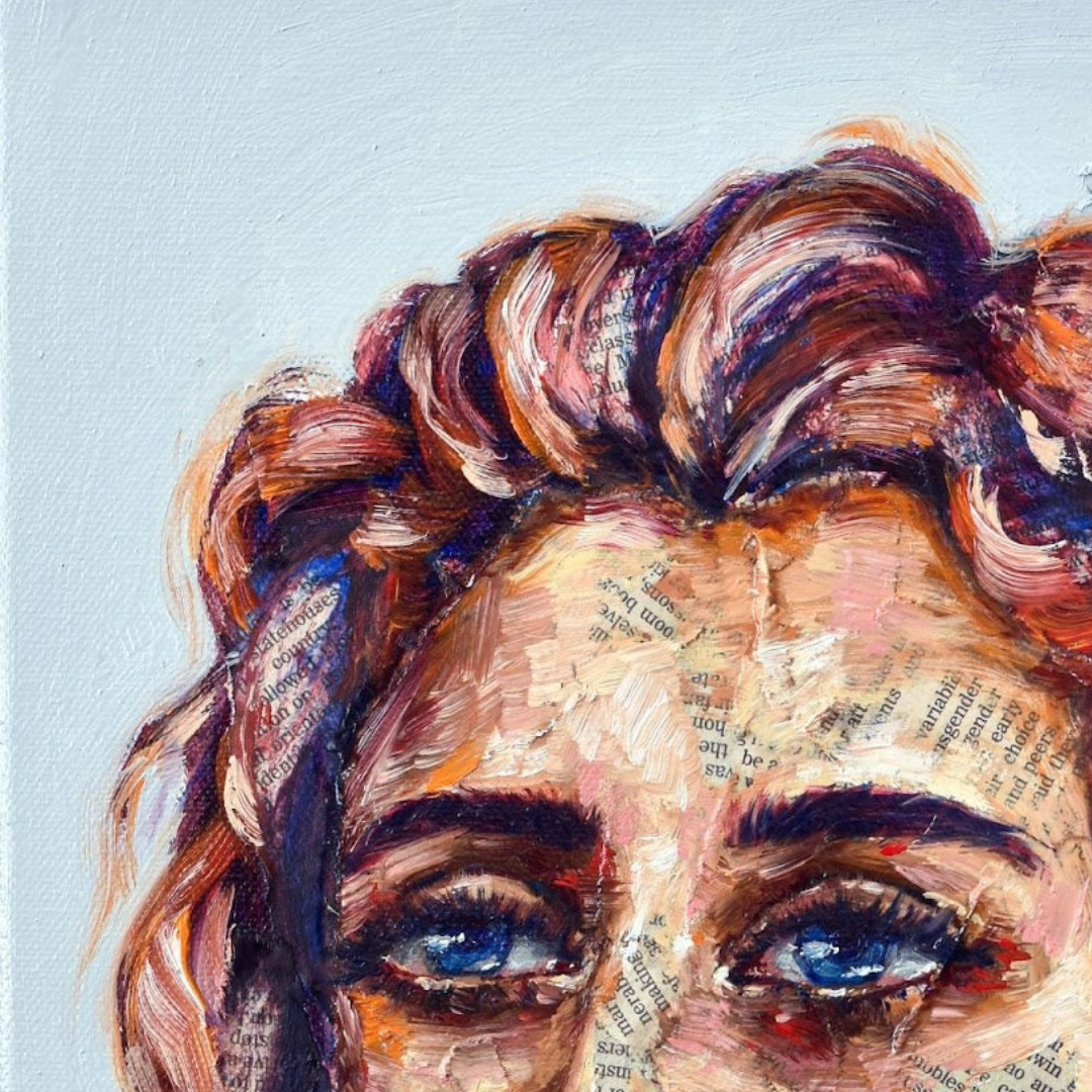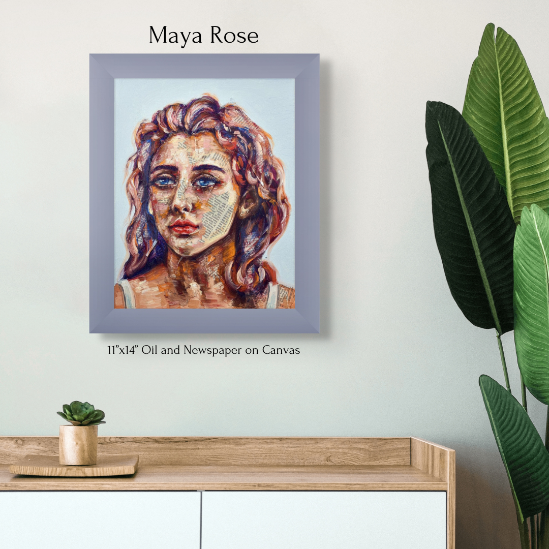 Maya's collection of mixed-media portraits is haunting and beautiful. Look closely, and you'll realize these beautiful faces are painted onto newsprint. Look even closer, and you'll see some of these articles are obituaries.