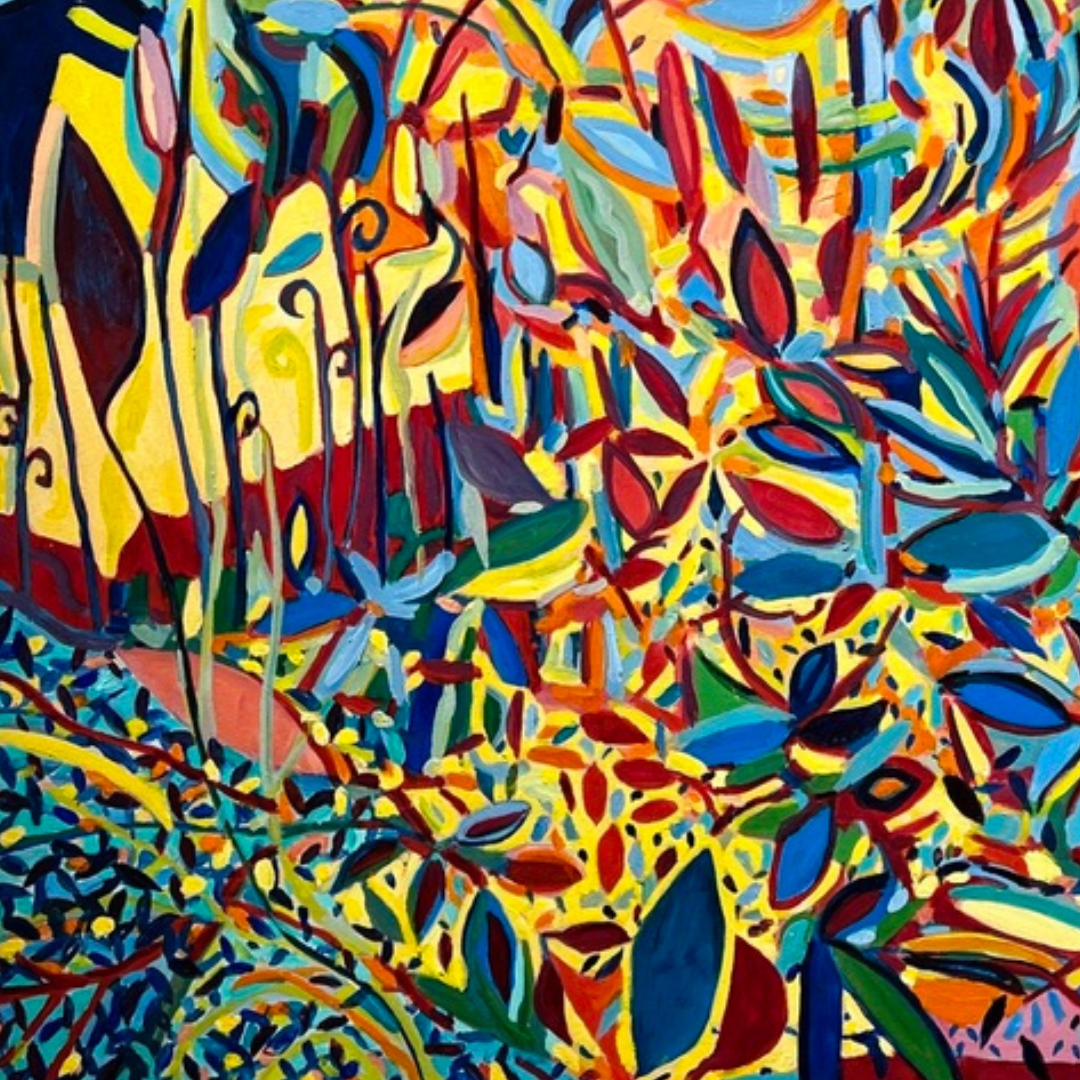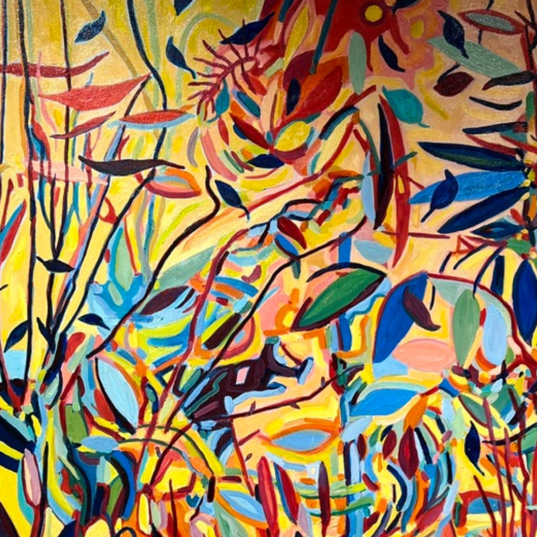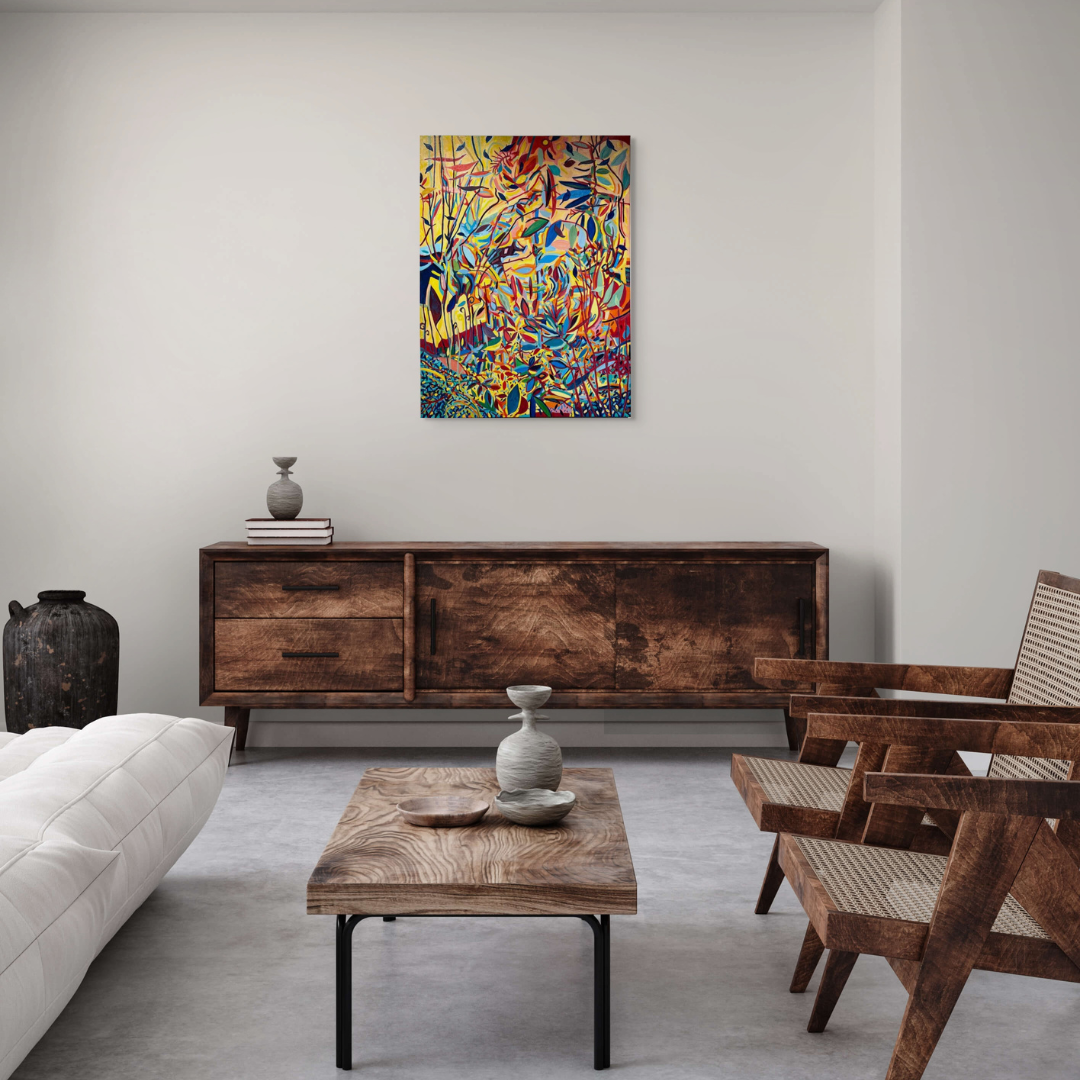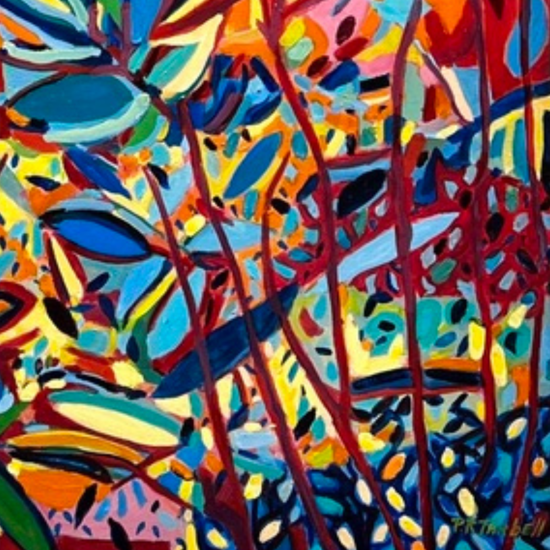 This original abstract painting by Pamela Tarbell features dynamic forms and a rich interplay of colors, offering a thought-provoking visual experience. Ideal for contemporary spaces seeking bold and modern artwork.