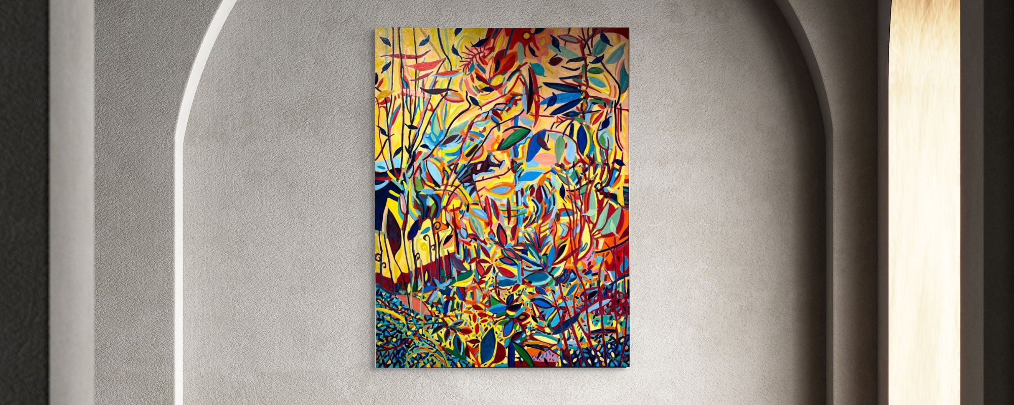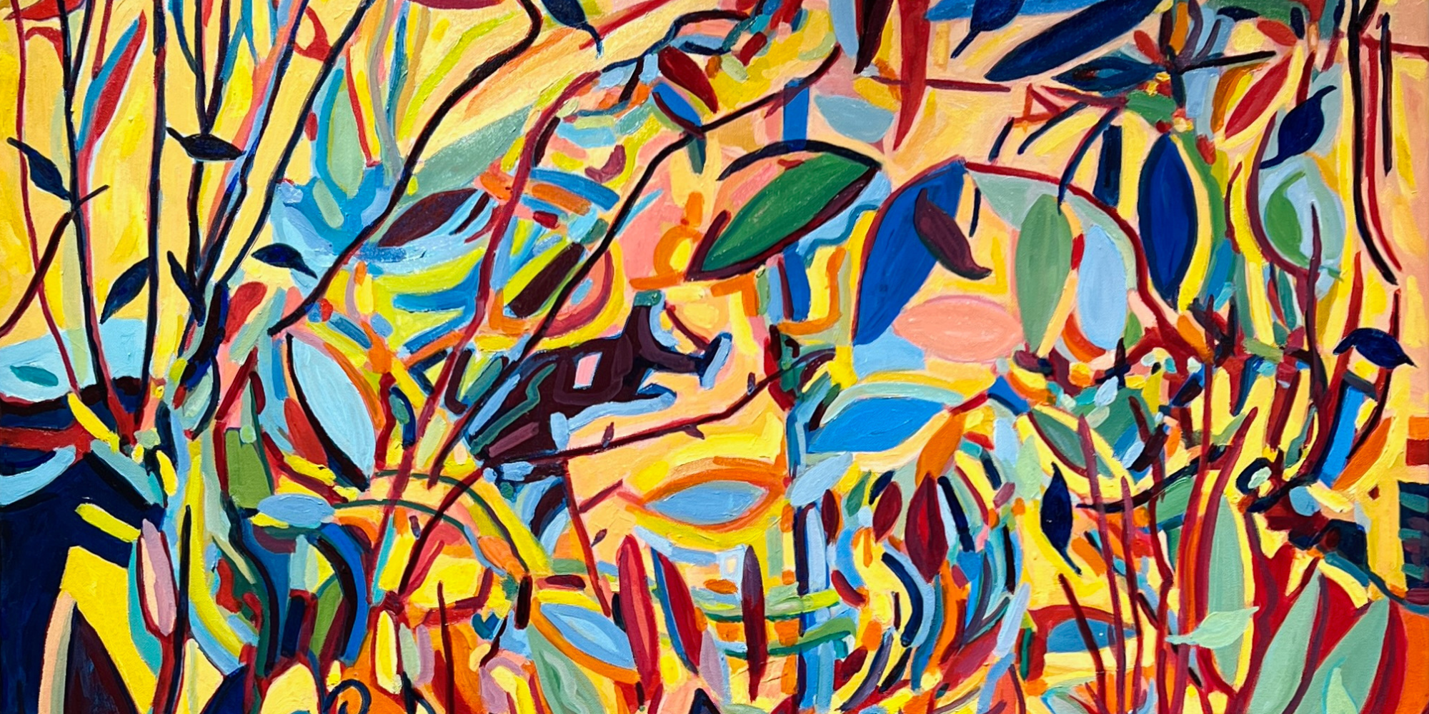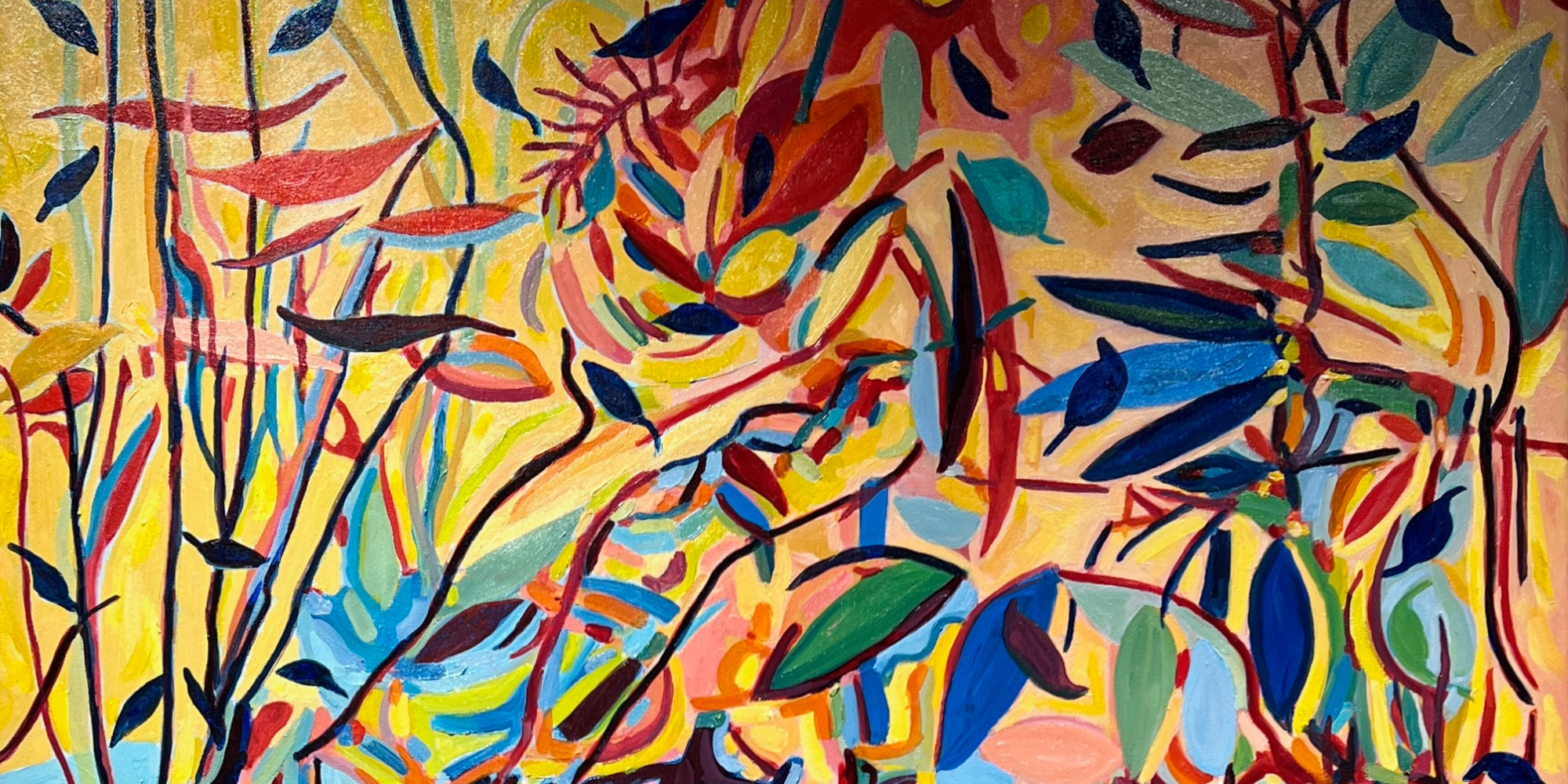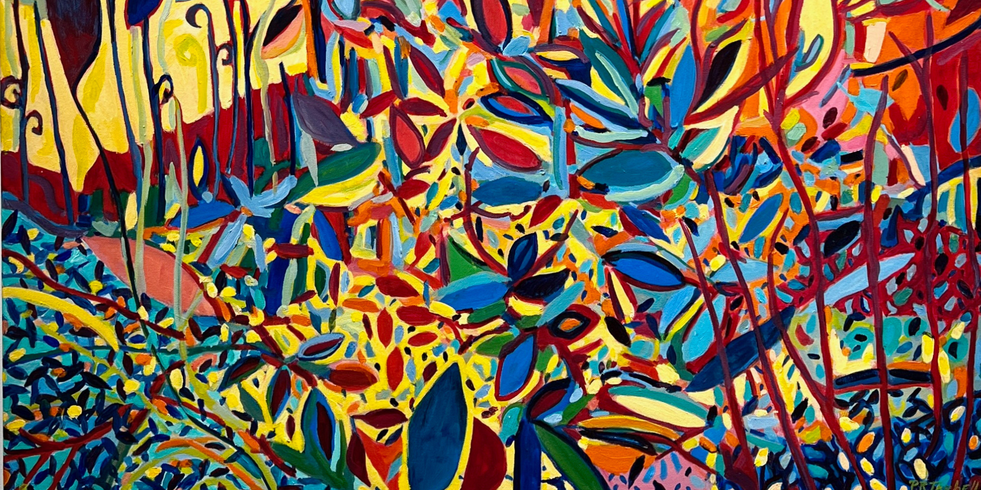 This original abstract painting by Pamela Tarbell features dynamic forms and a rich interplay of colors, offering a thought-provoking visual experience. Ideal for contemporary spaces seeking bold and modern artwork.